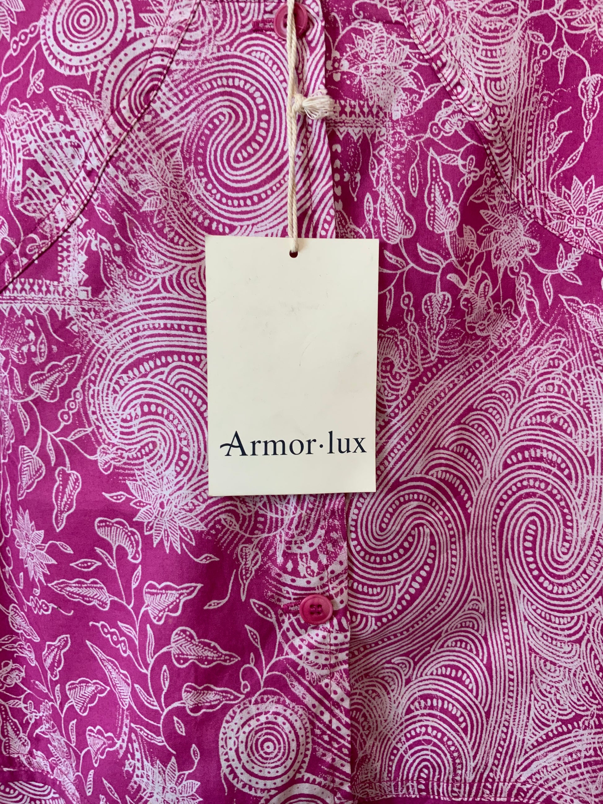 Tres beau débardeur boutonné Rose fuchsia et blanc 100% coton popeline avec son étiquette neuve 1980 Armor Lux Motifs fleurs et géométriques- Etat Neuf Excellent-