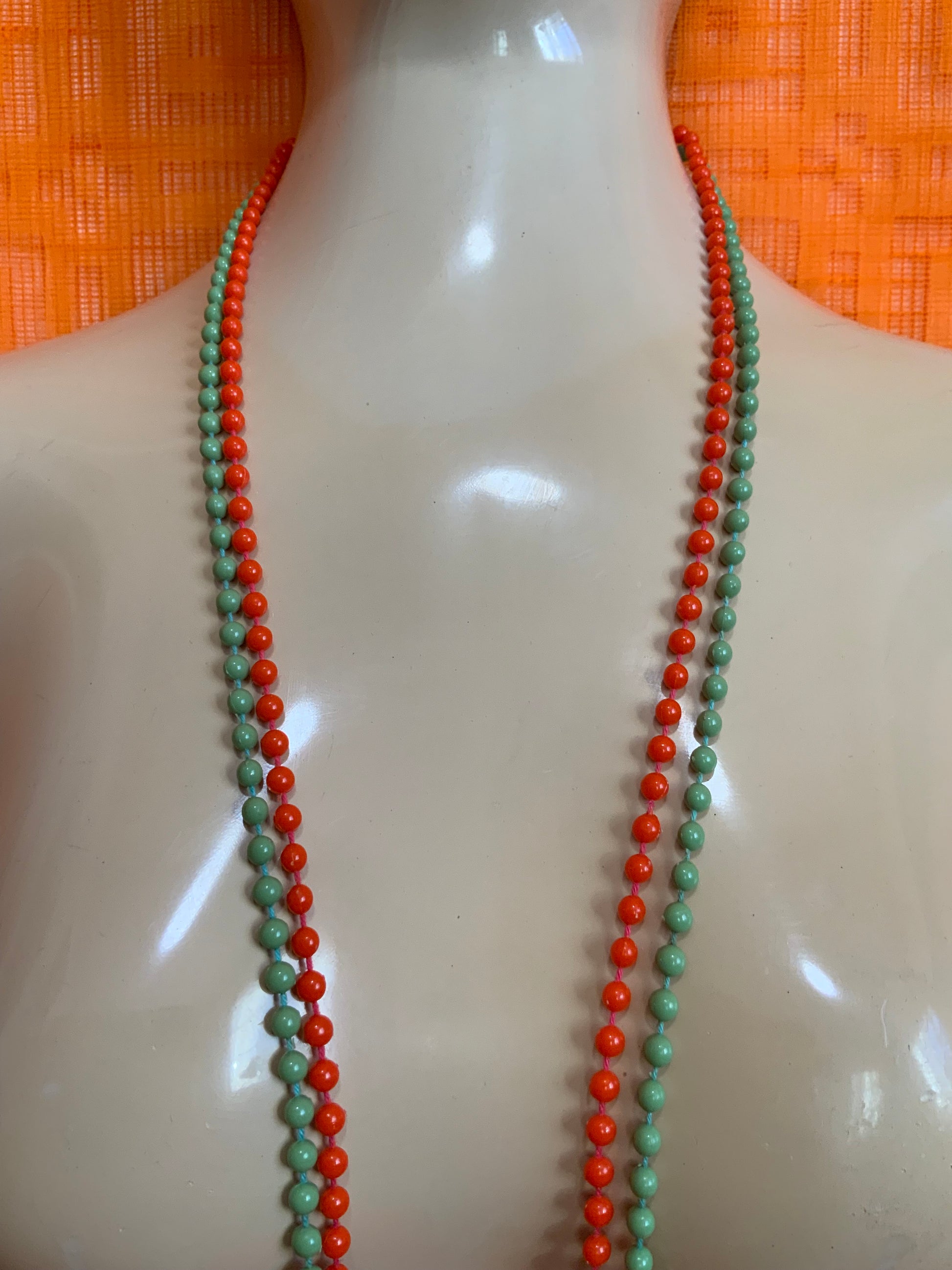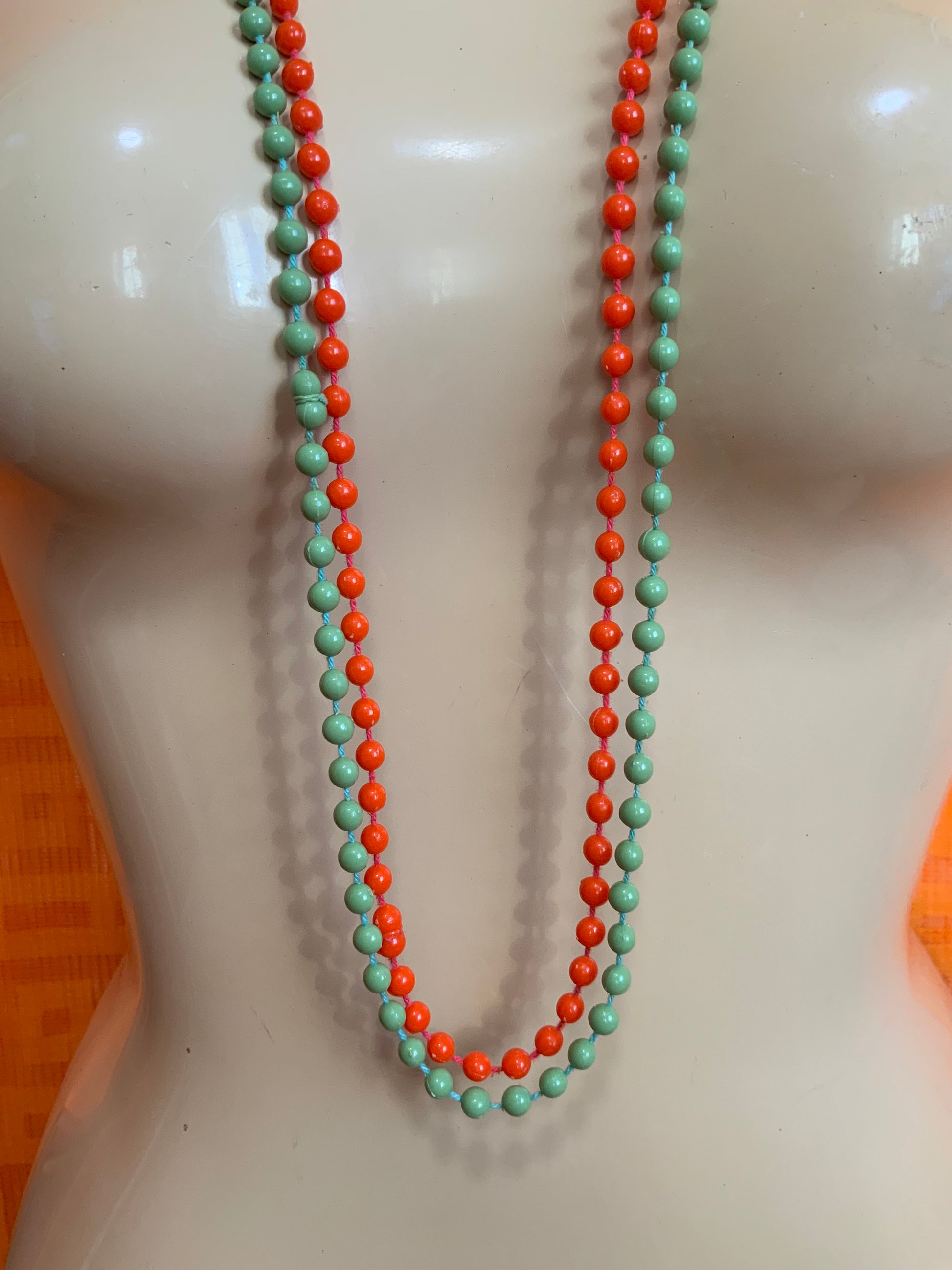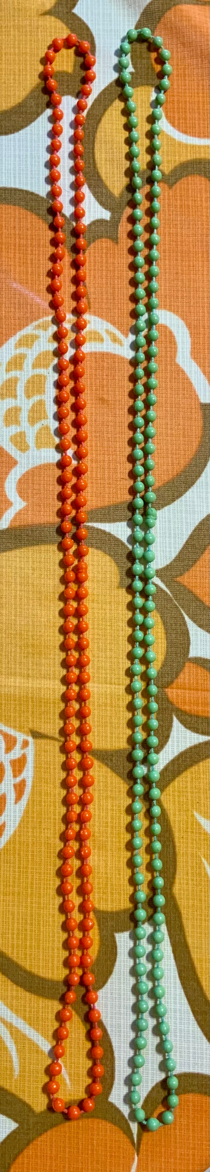 2 colliers sautoirs en petites boules plastique, excellent état.