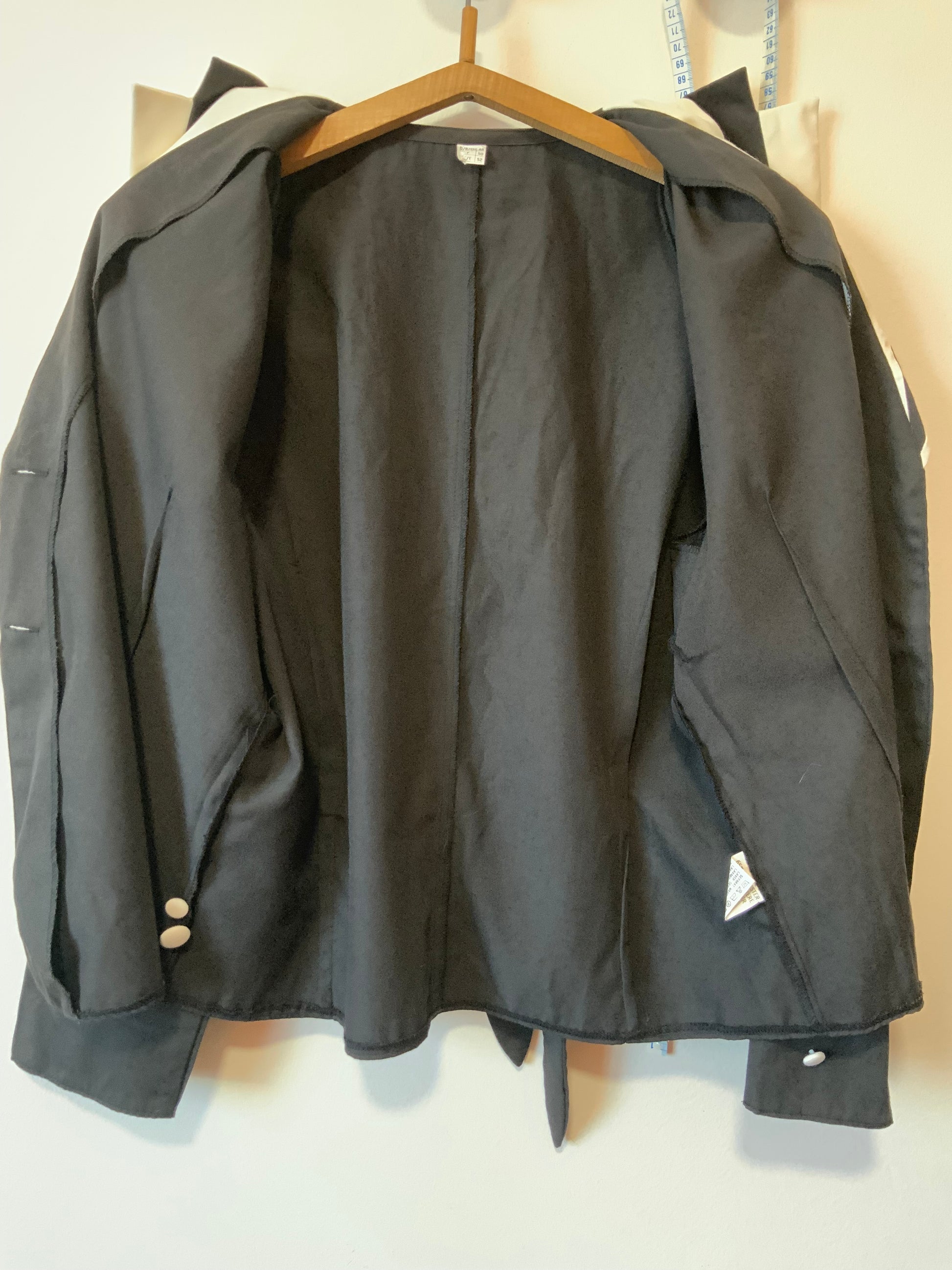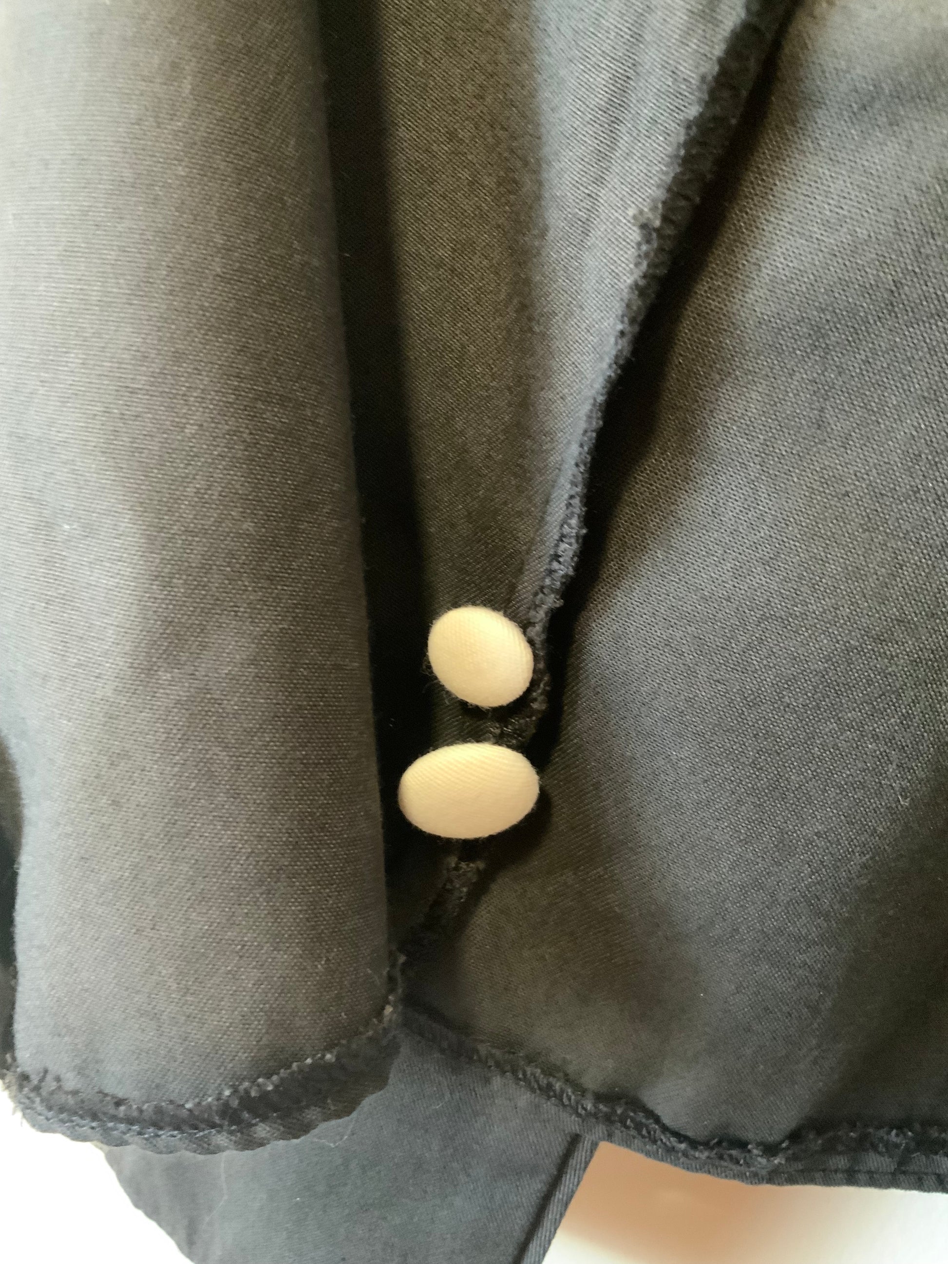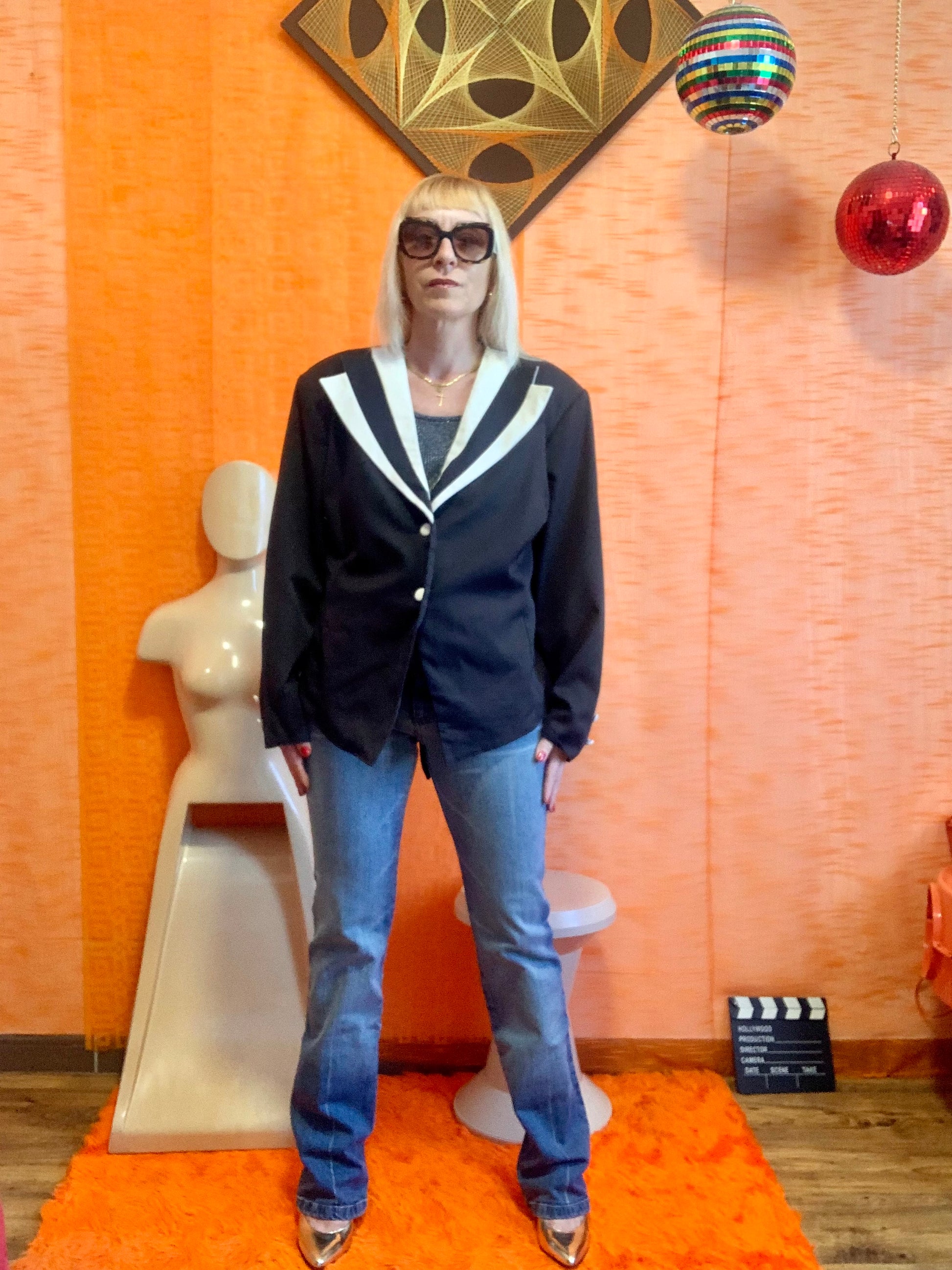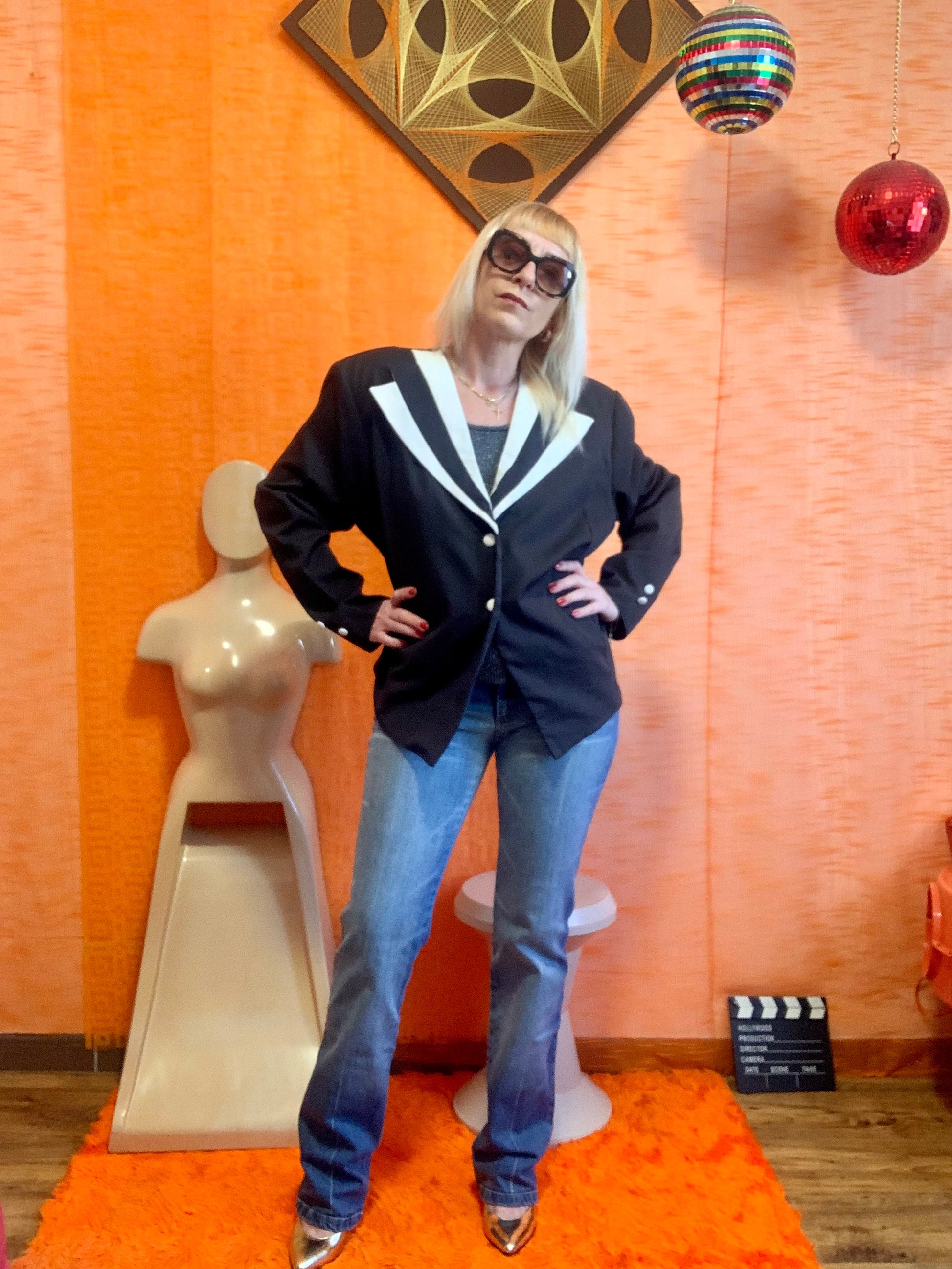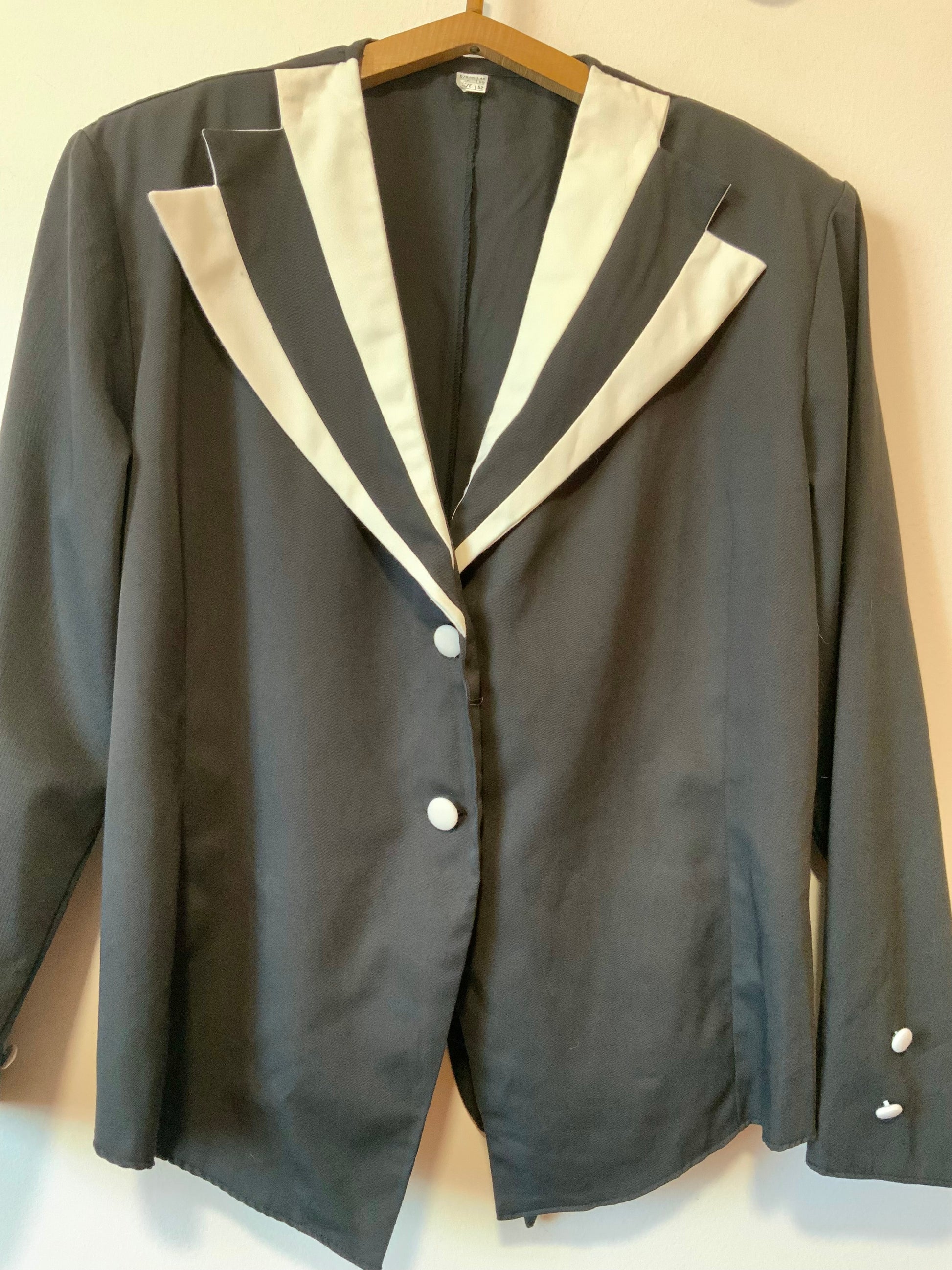 Veste Blazer Vintage France 1990 noire blanche - épaules à volume avec épaulettes - État excellent, 100% polyester + 2 boutons de rechange - Très stylée avec lien pour ajuster sa taille au dos.