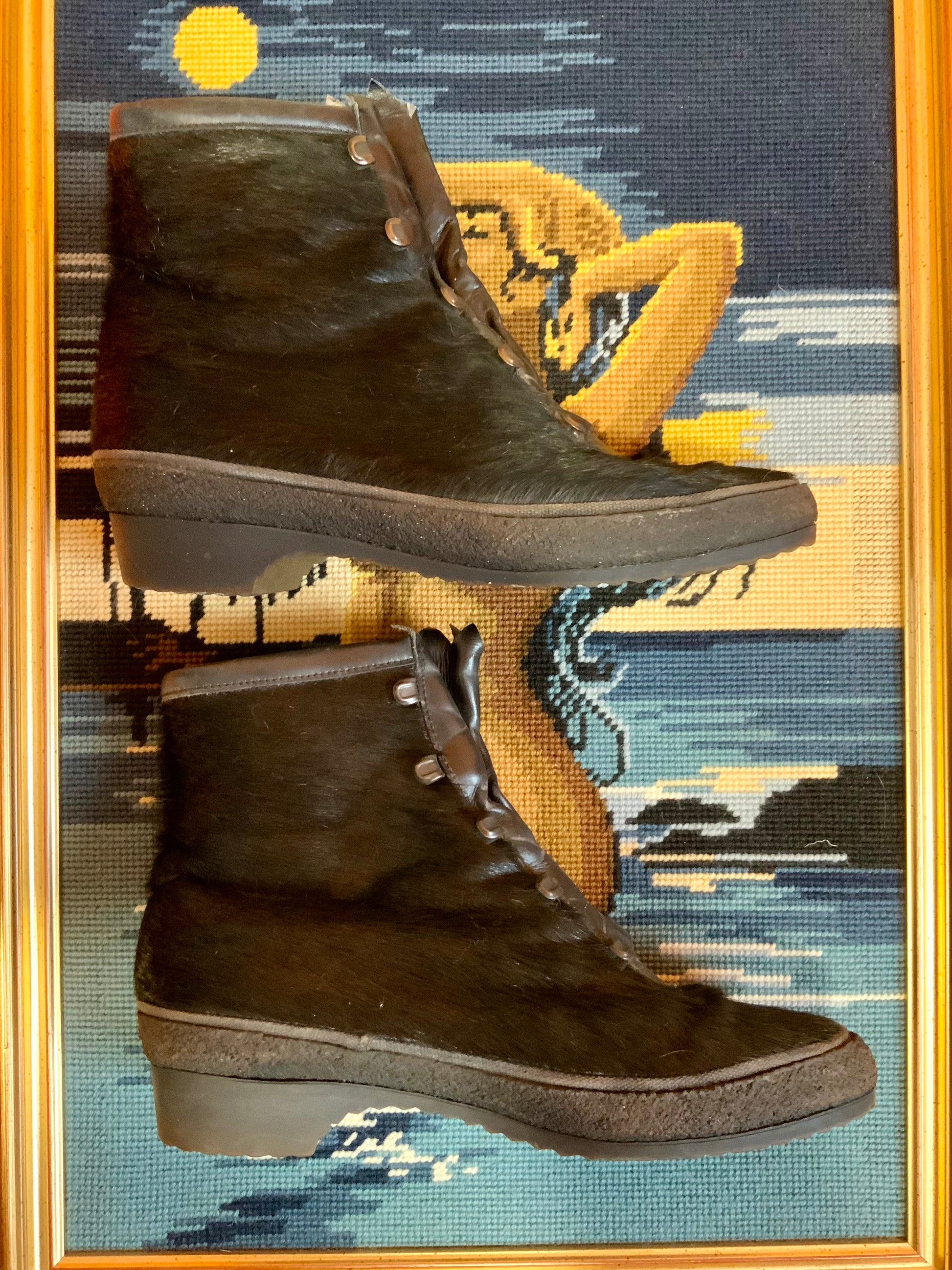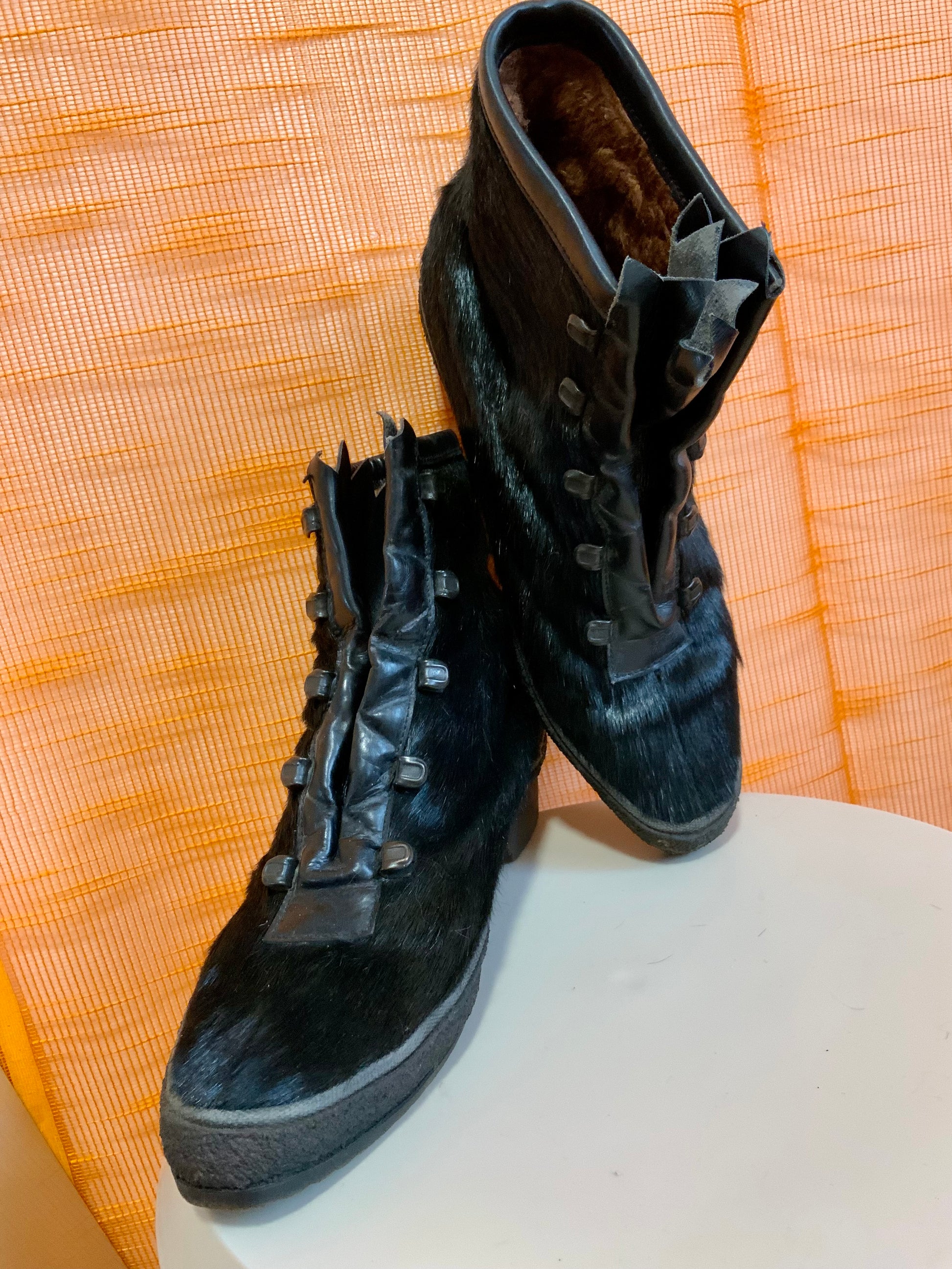Superbes bottines fourrées 1970 Vintage Très stylées jamais portées - Cuir et Fourrure poils courts noirs - Lacets à rajouter ou non car leur rendu tel que est parfait- Fourrées intérieur marron fourrure synthétique intérieure - Marque Florida Everest Made in Italy sous semelles.
