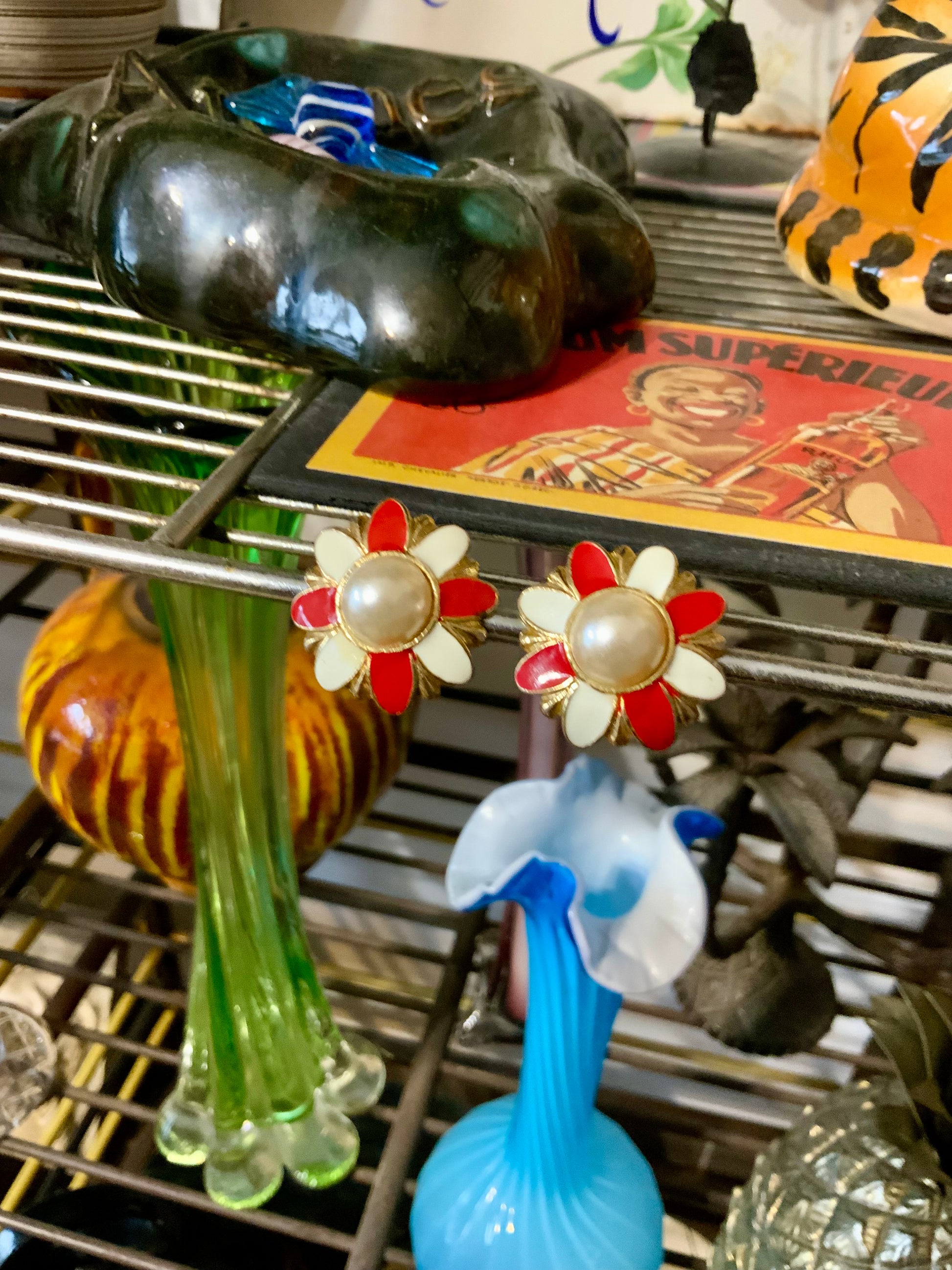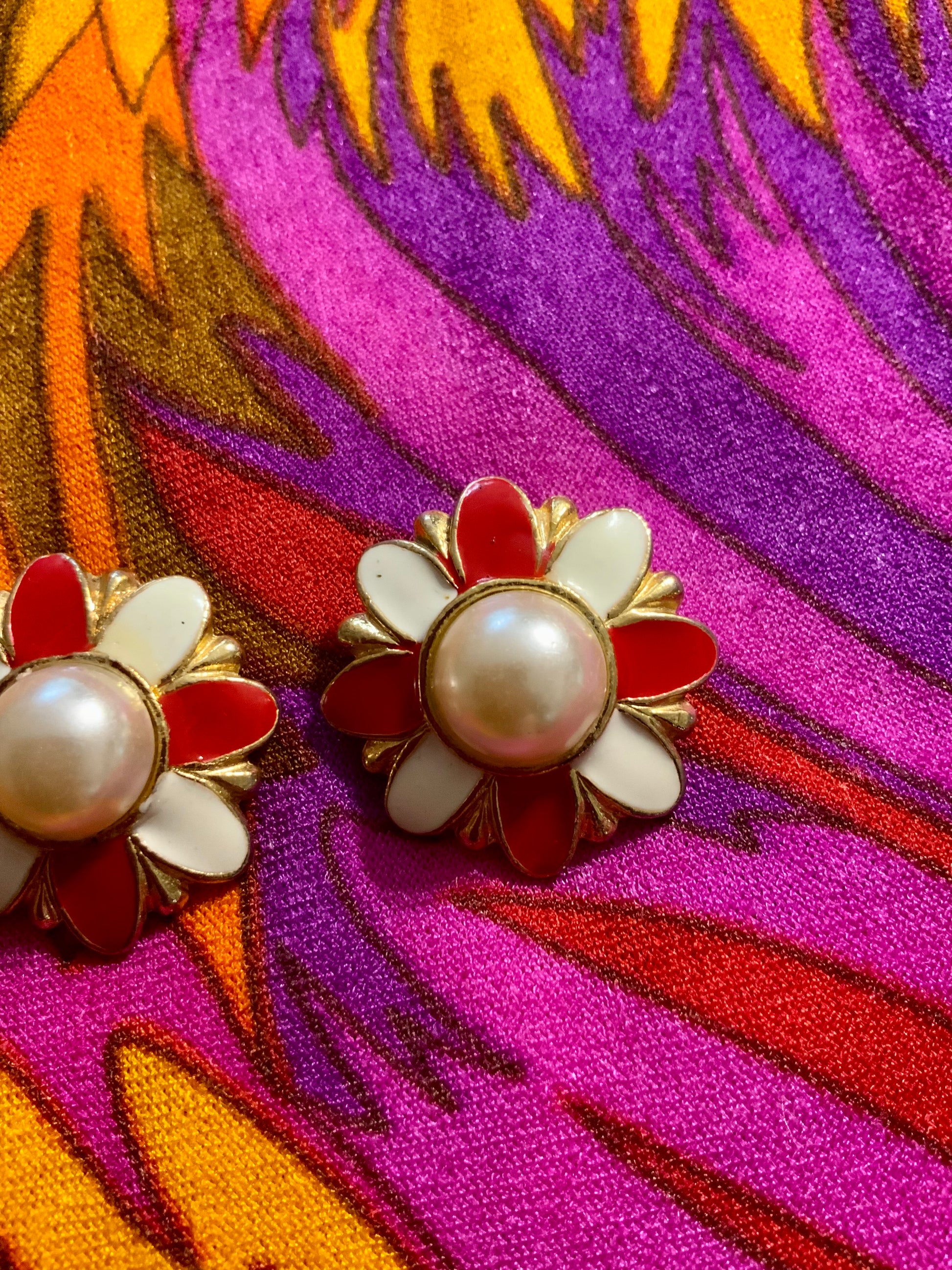 Boucles d’oreilles Fleurs Vintage 1990 Rouges blanches et métal doré - Très bon état, juste petite usure couleur derrière -