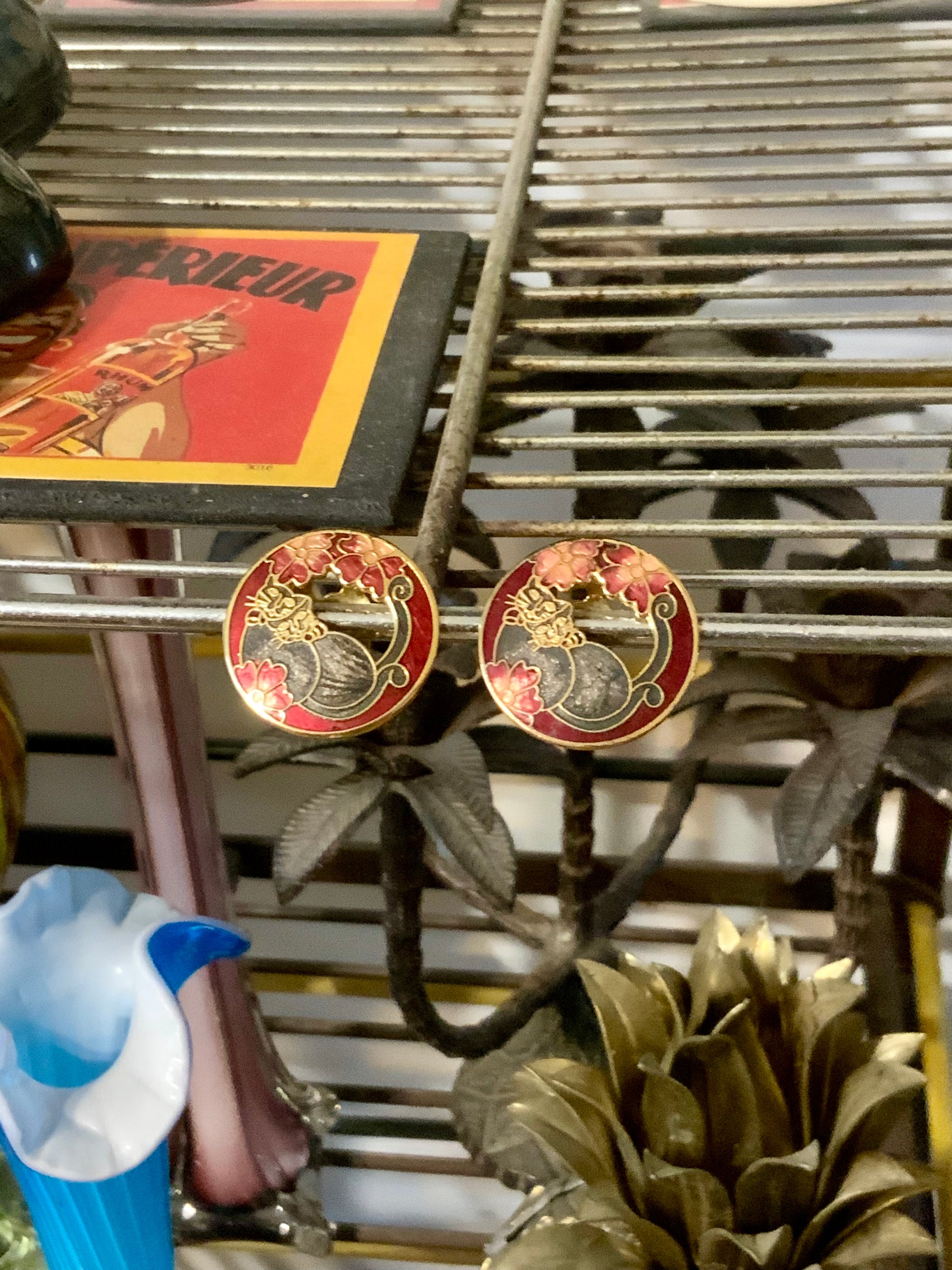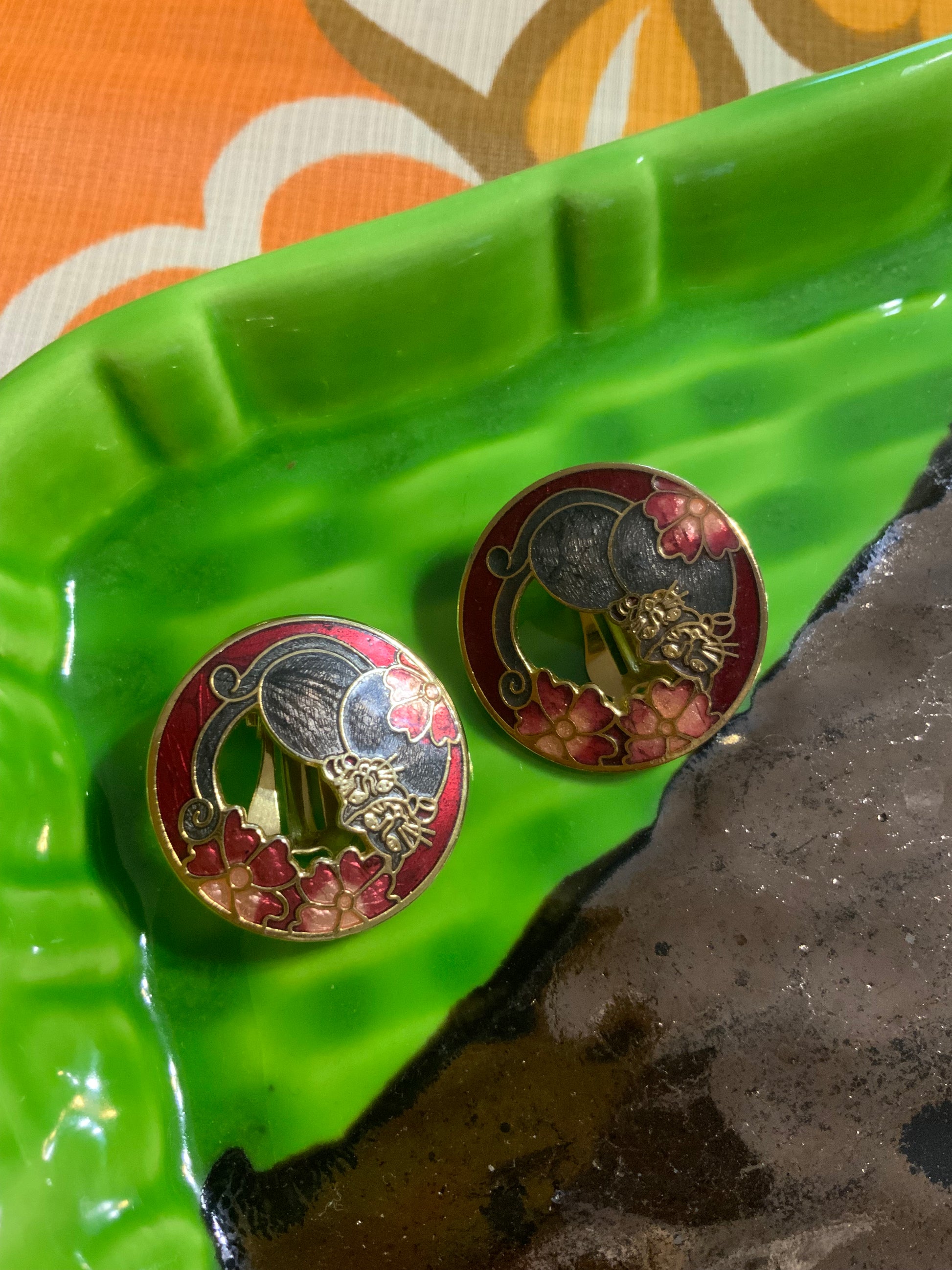 Boucles d’oreilles Cloisonnées Motifs chats et Fleurs - Vintage.