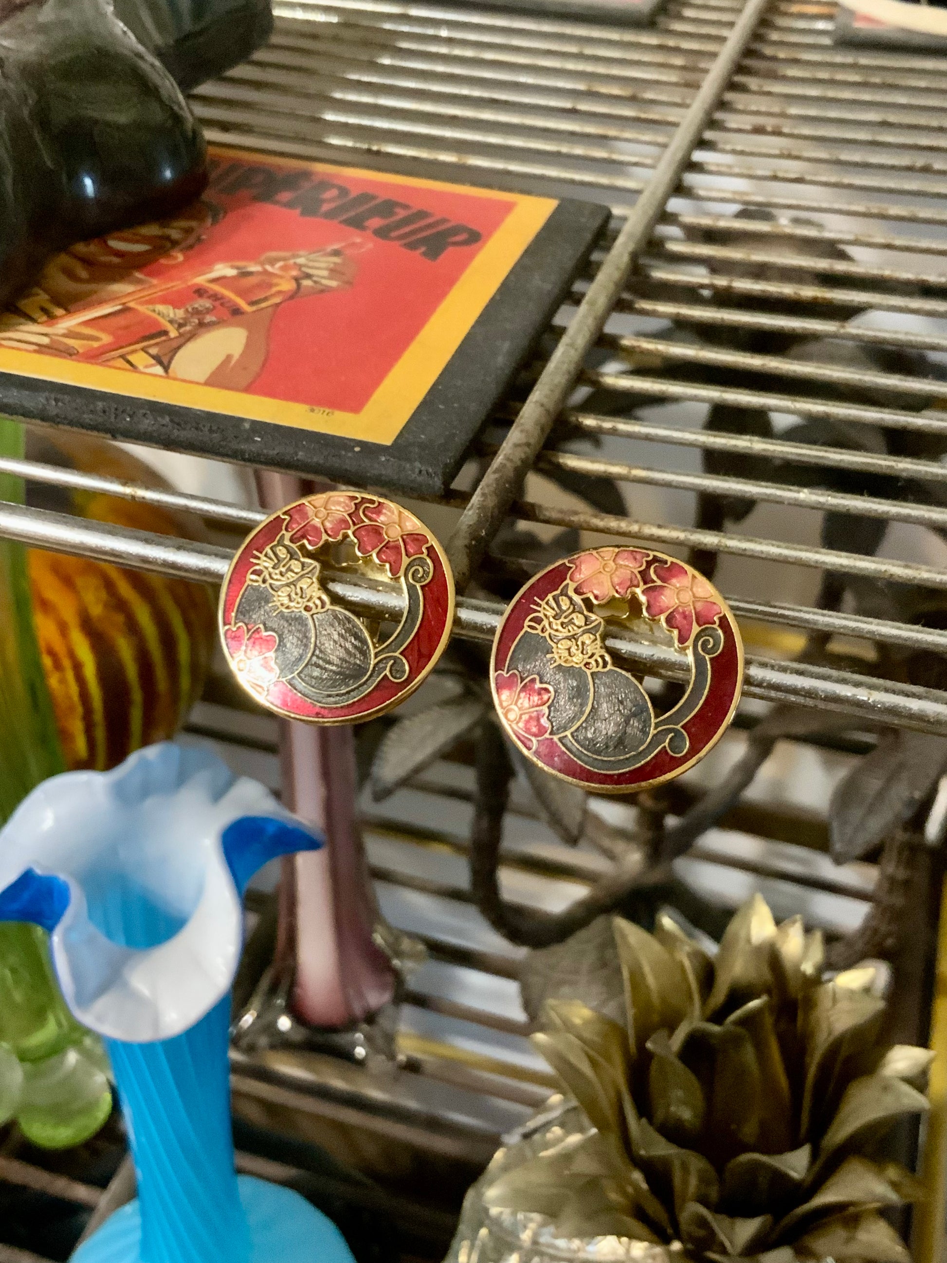 Boucles d’oreilles Cloisonnées Motifs chats et fleurs - Vintage