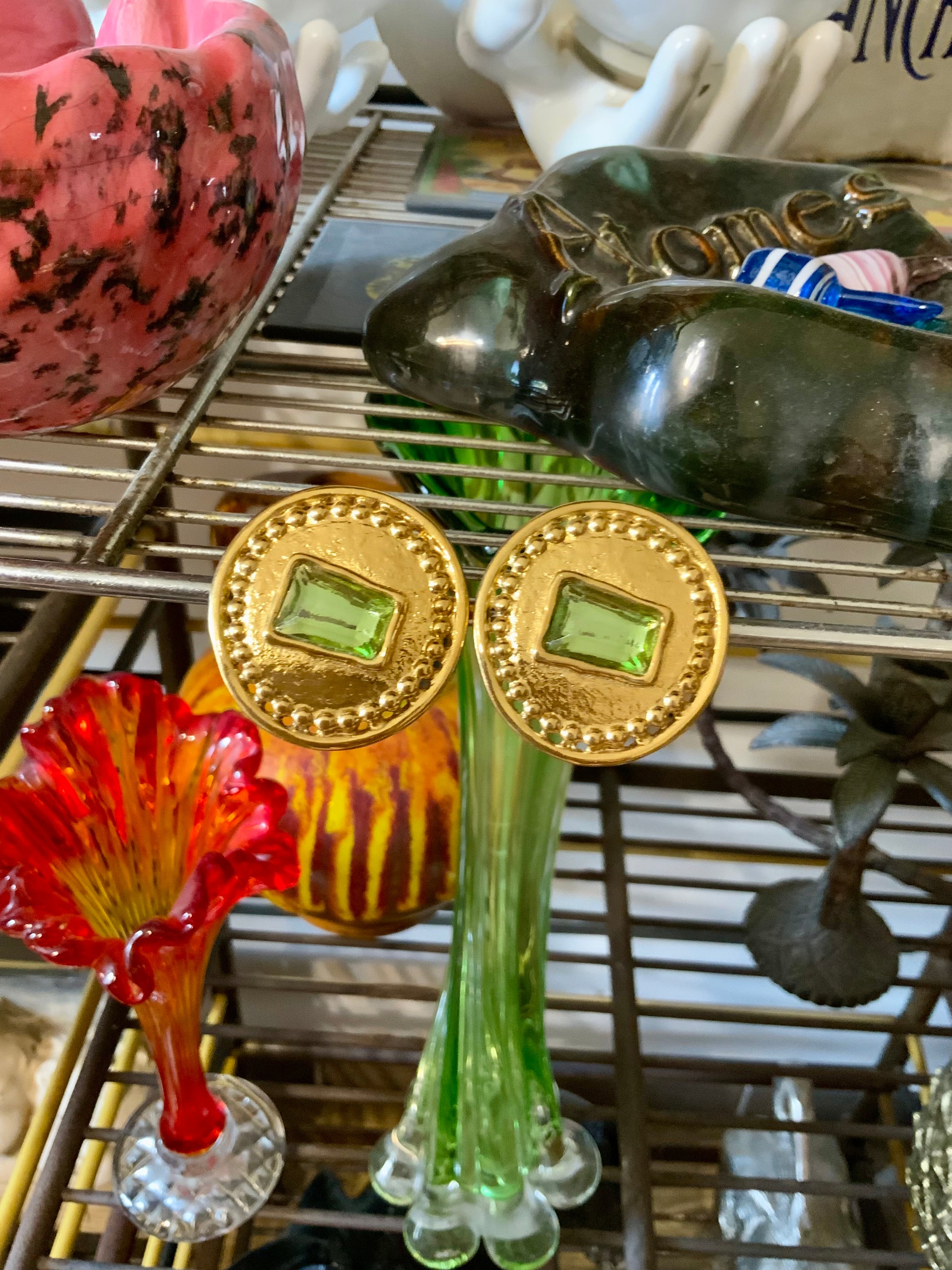Très jolies boucles d’oreilles anciennes 1990 de la maison Jean Louis Scherrer - Métal doré plaqué or et pierre de verre verte - Signatures au dos-