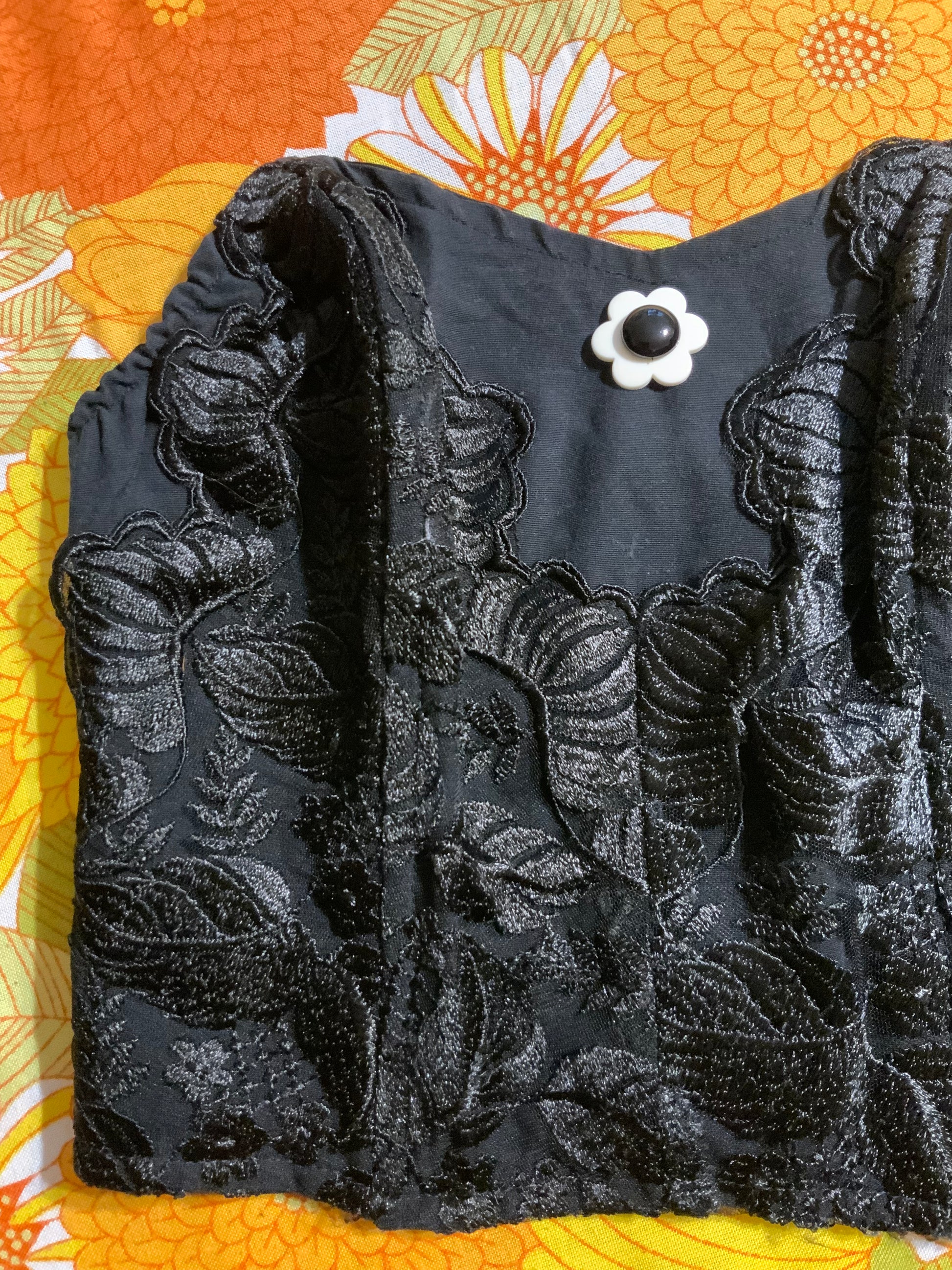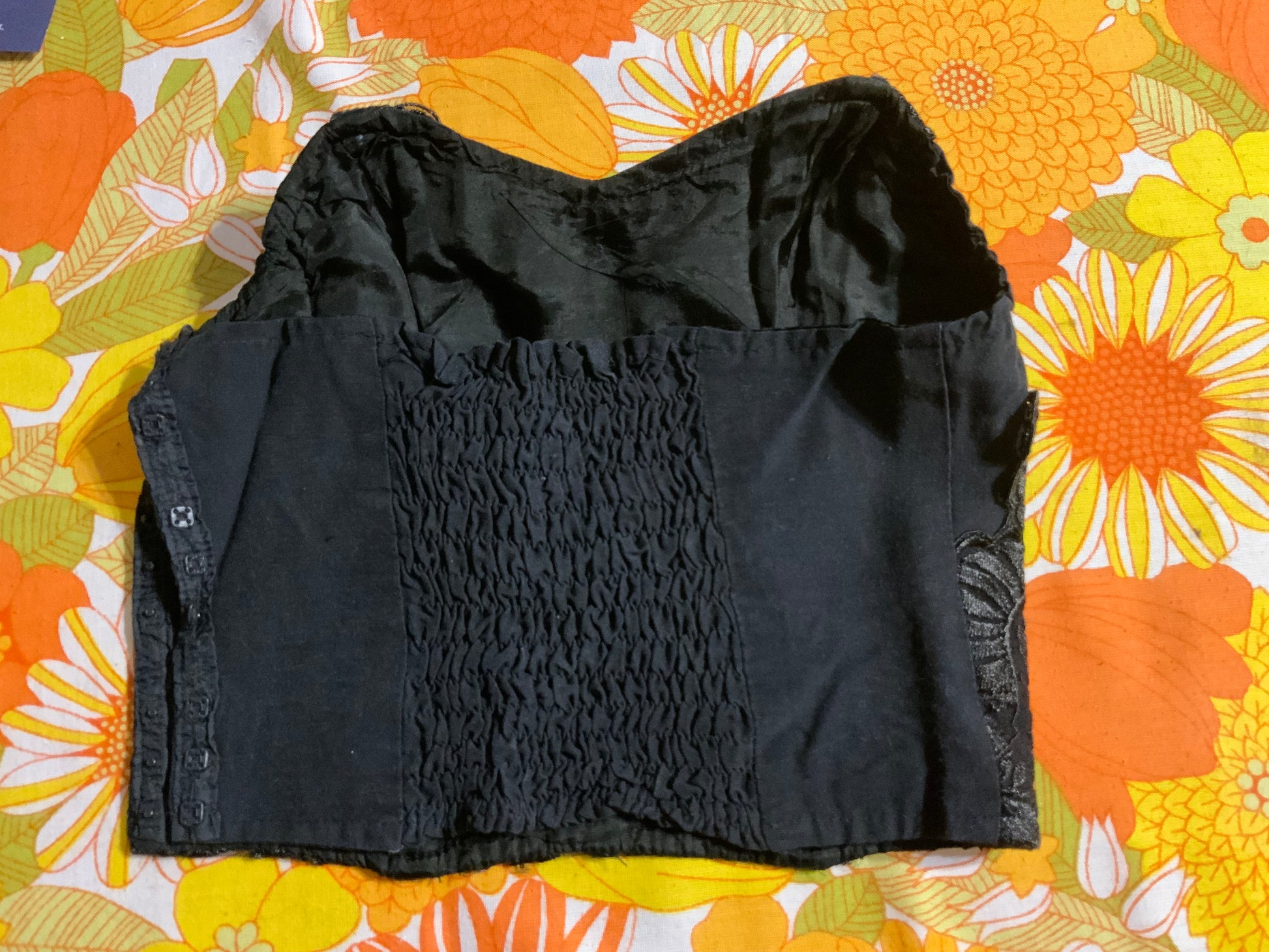 Bustier Vintage 1990 Broderies et fleur plastique - Modele Perle avec pressions plastiques sur le côté - Noir avec baleines et dos Smocké— Excellent état.