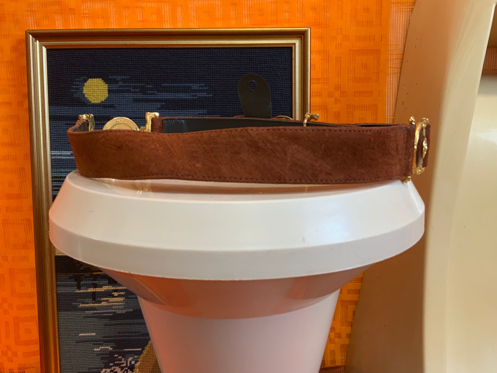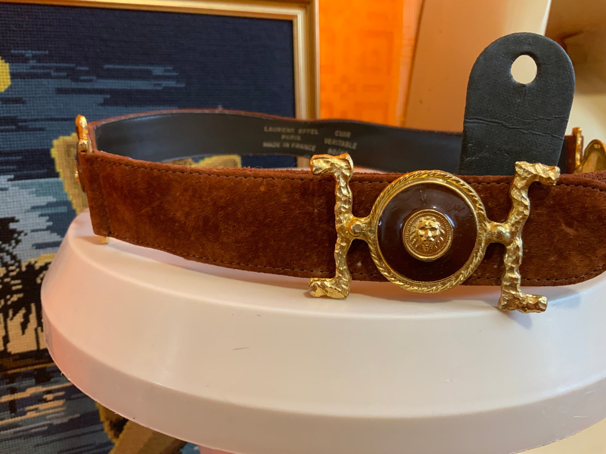 Tres belle ceinture en daim marron et boucles métal dorées Lions Made in France Vintage Laurent Effel, Neuve Stock de magasin.