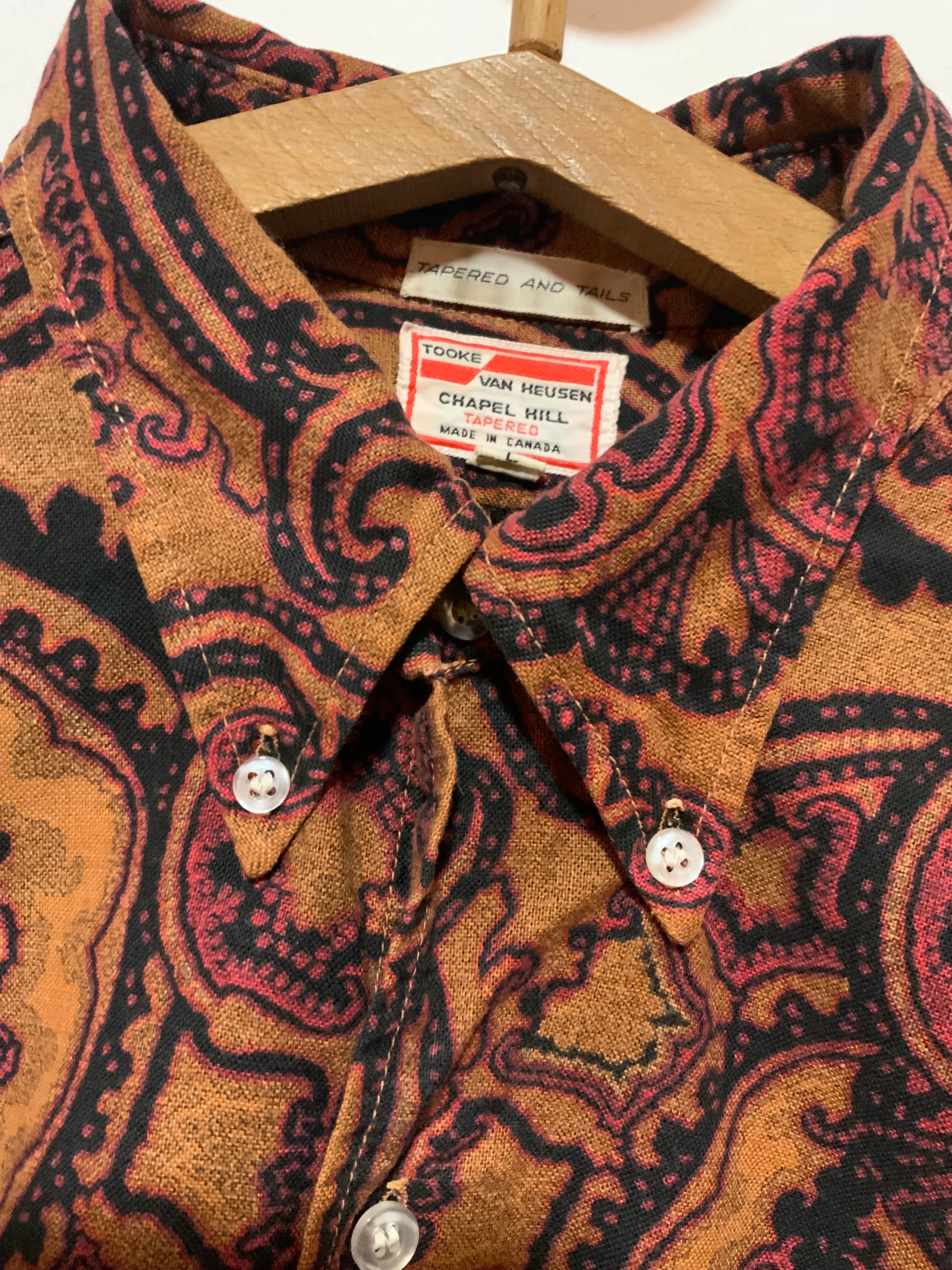 Chemise Canadienne Vintage - Made in Canada Motifs proche du paisley Couleurs moutarde et fuchsia rouge- Forme Originale.