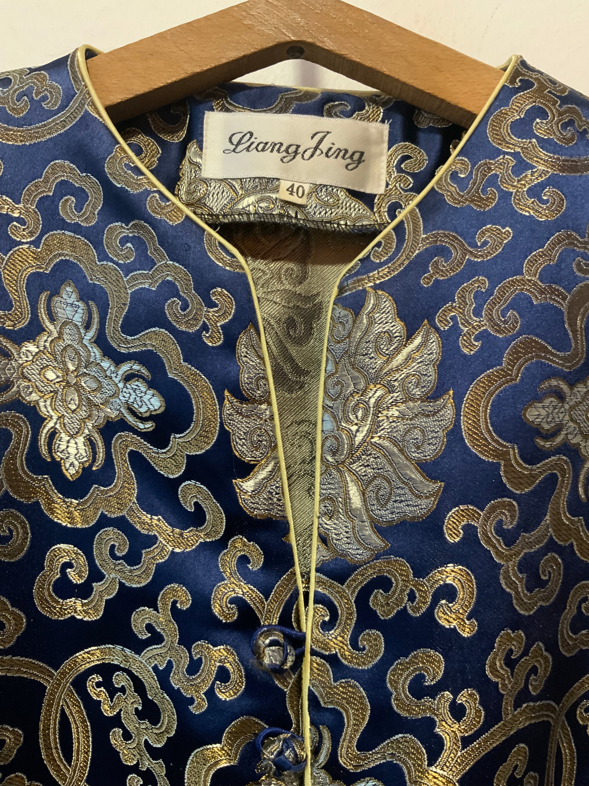 Chemise en pure soie Chinoise Vintage Motifs dorés sur fond Bleu Marque Liang Jing.