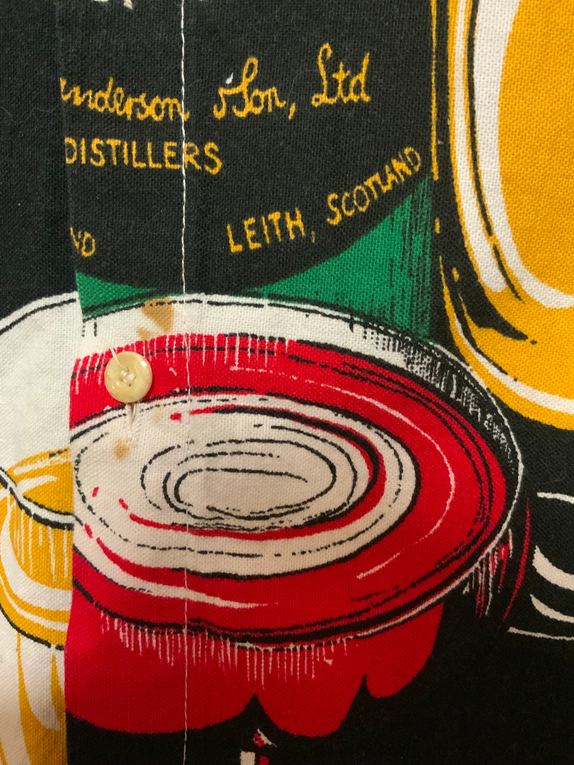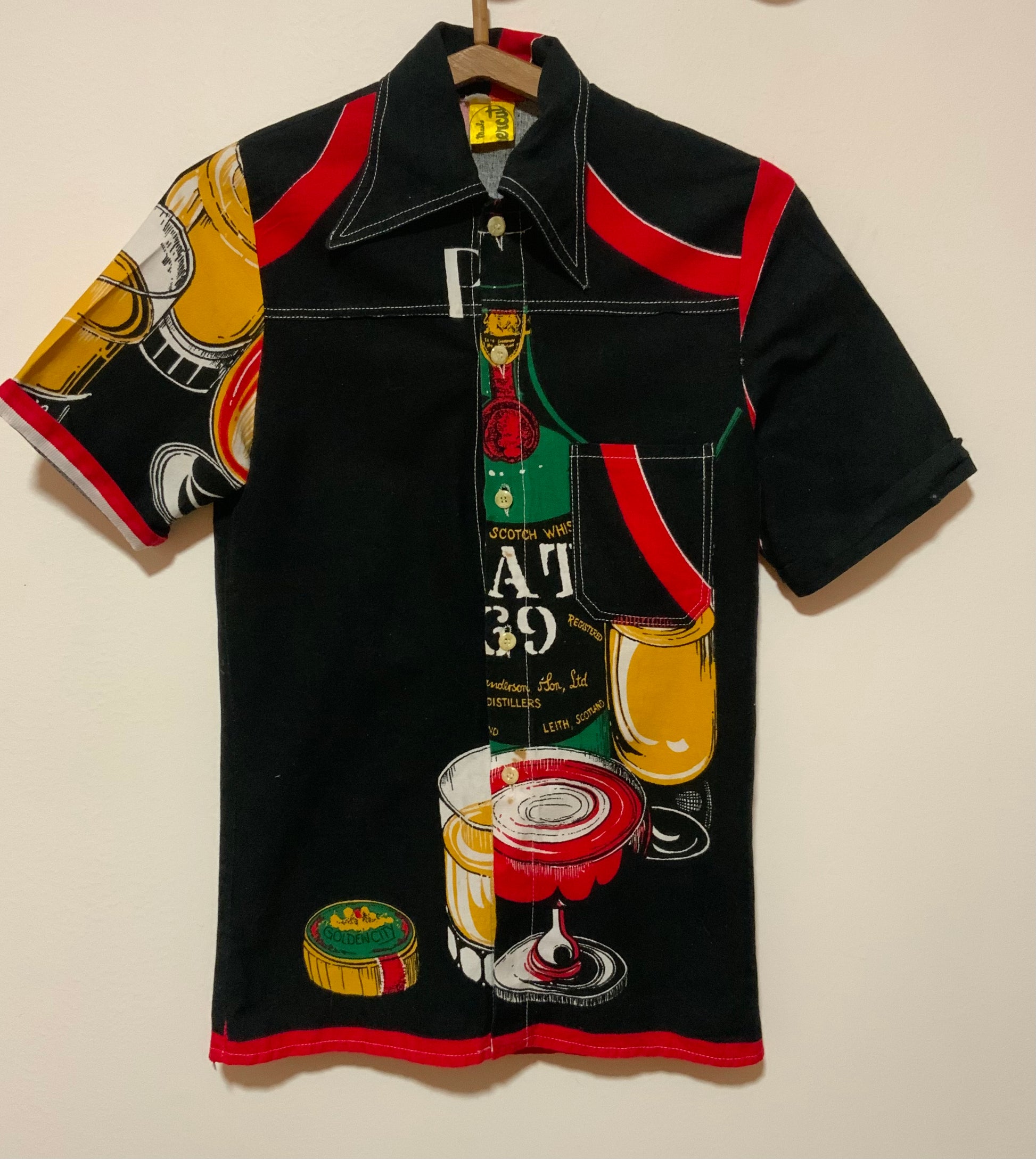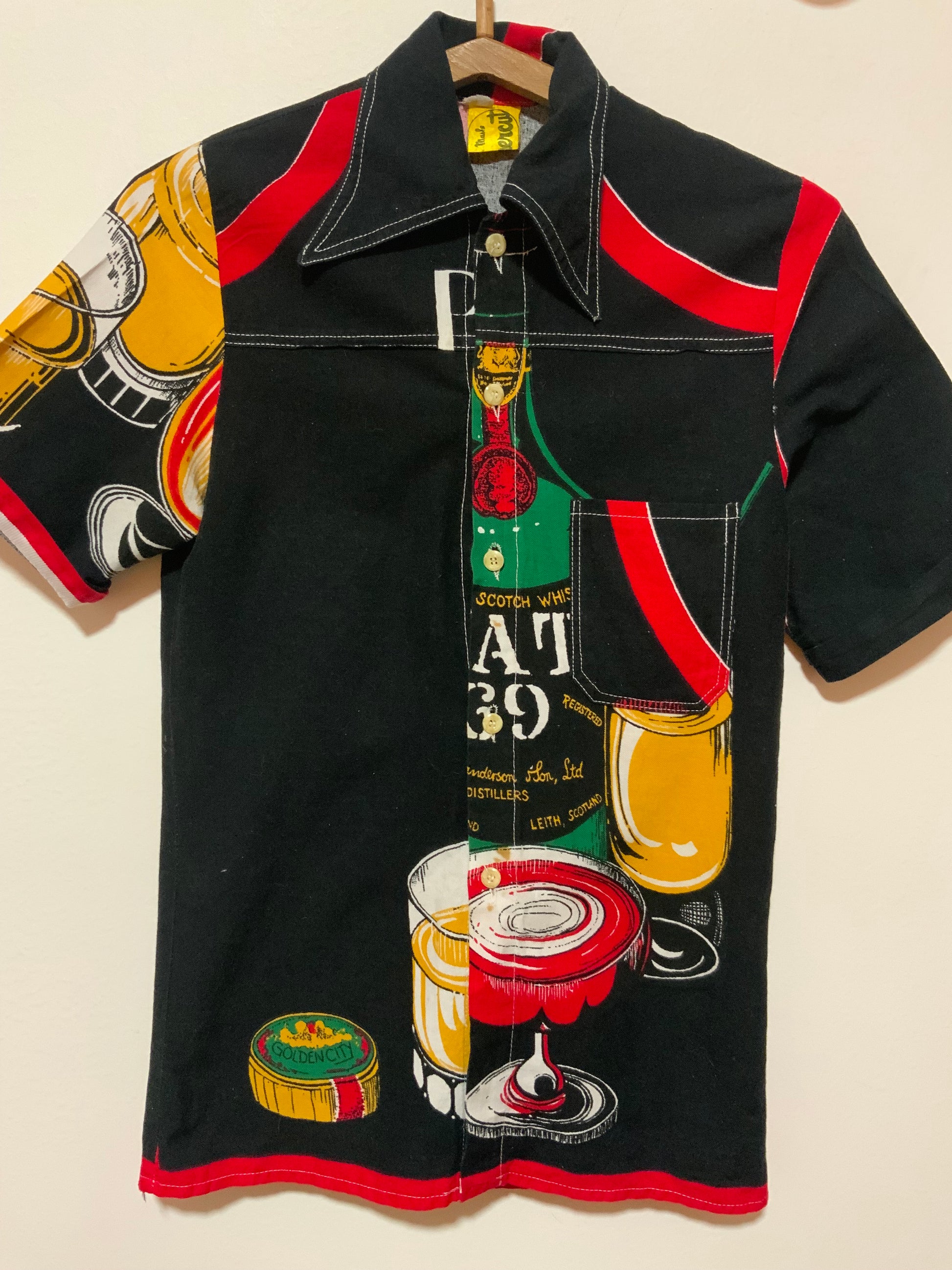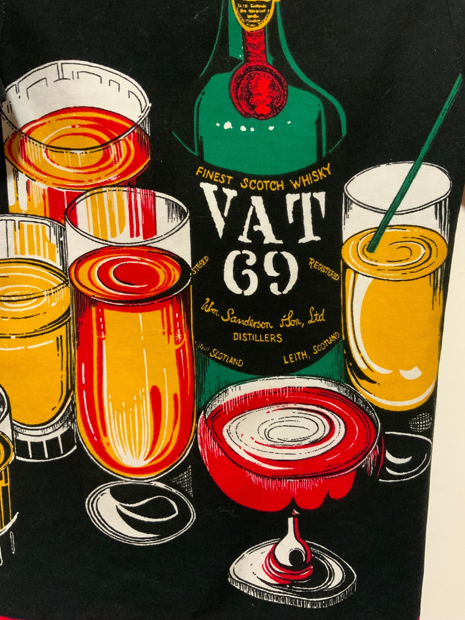 Tres belle chemise Collector col pelle à tartes Vintage 1970 Chemise publicitaire Vat 69 par la marque Uppercut Diffusion Masha - belles surpiqûres blanches et couleurs merveilleuses - 2 petites tâches voir la photo.