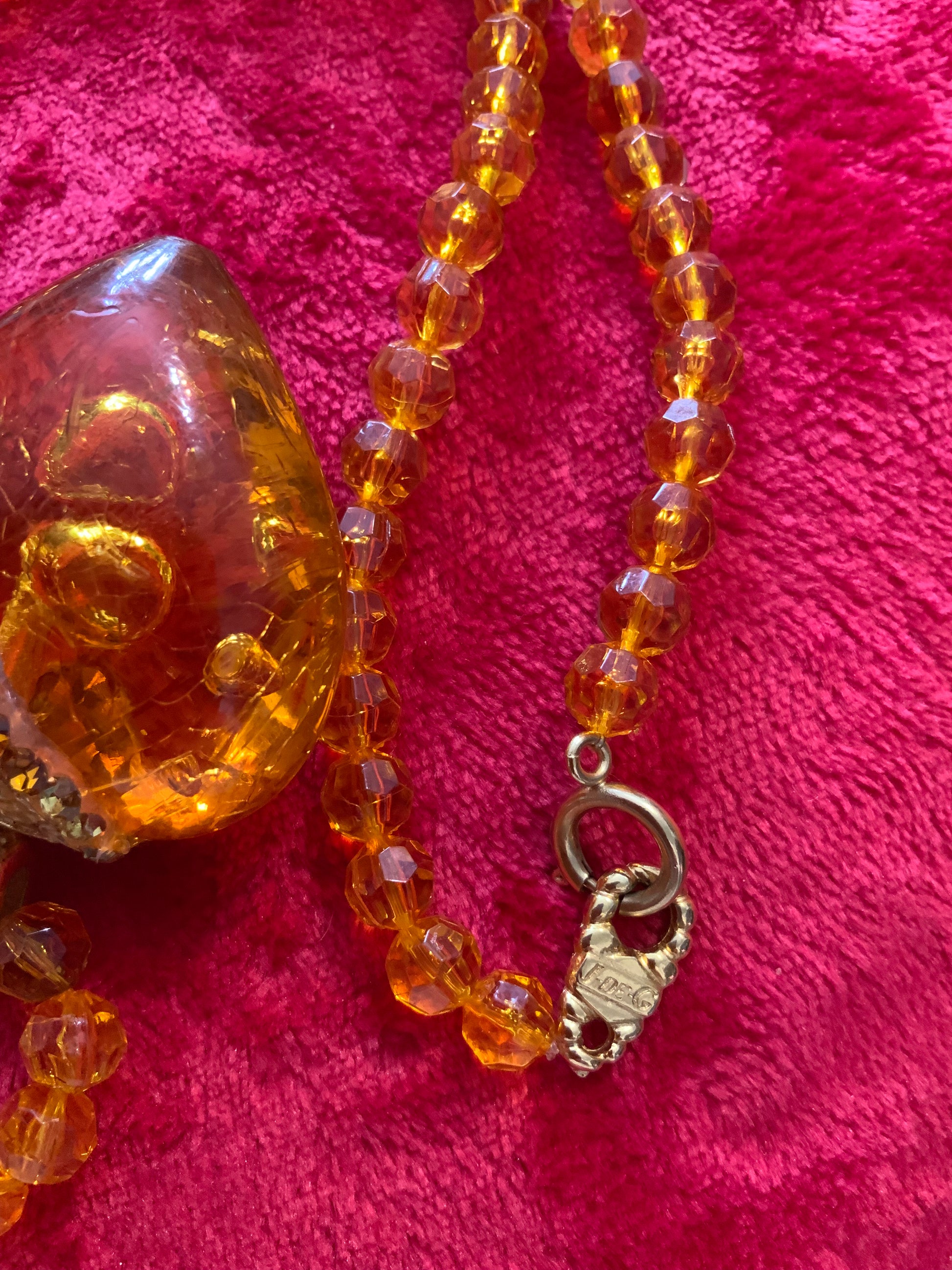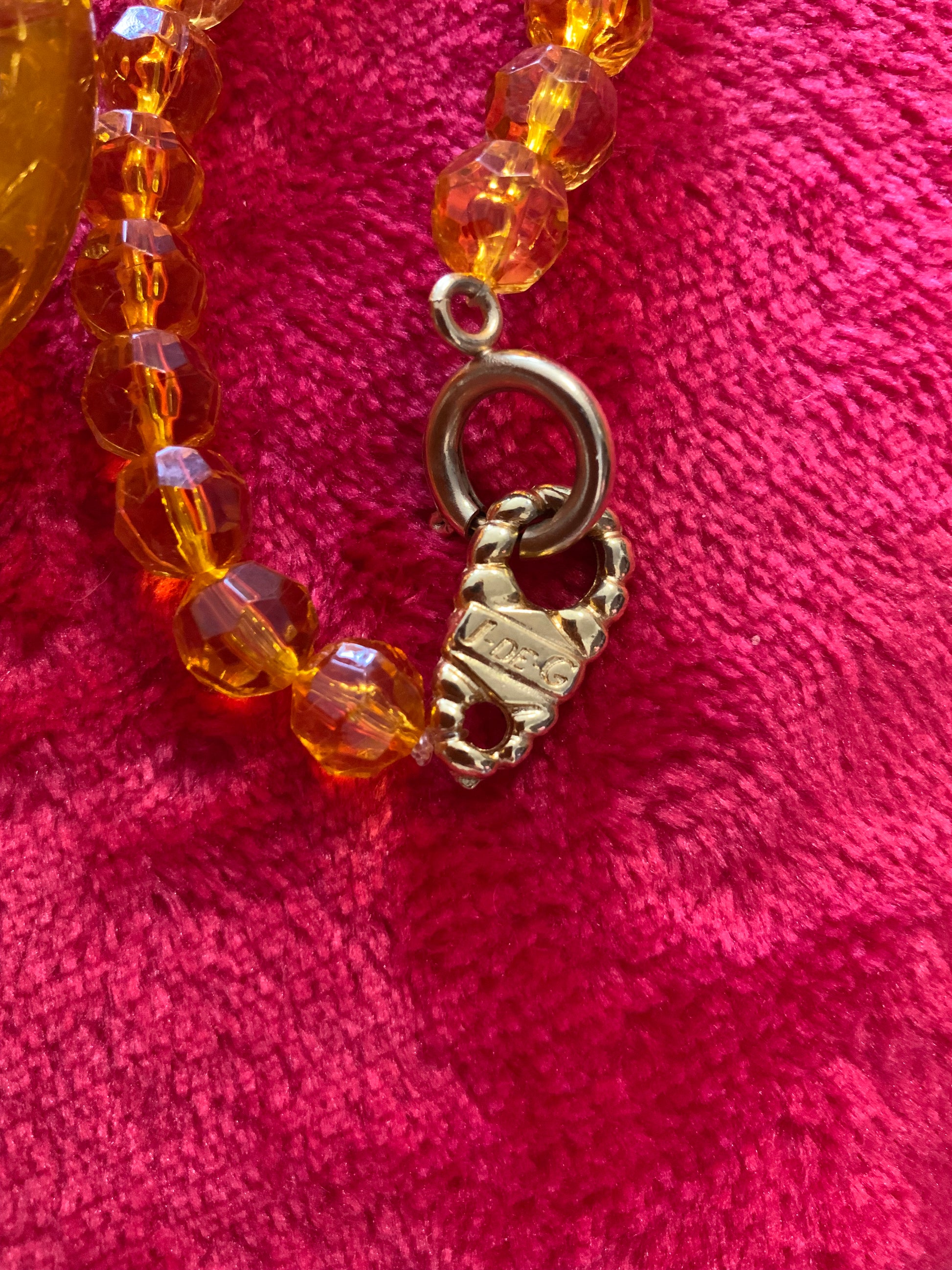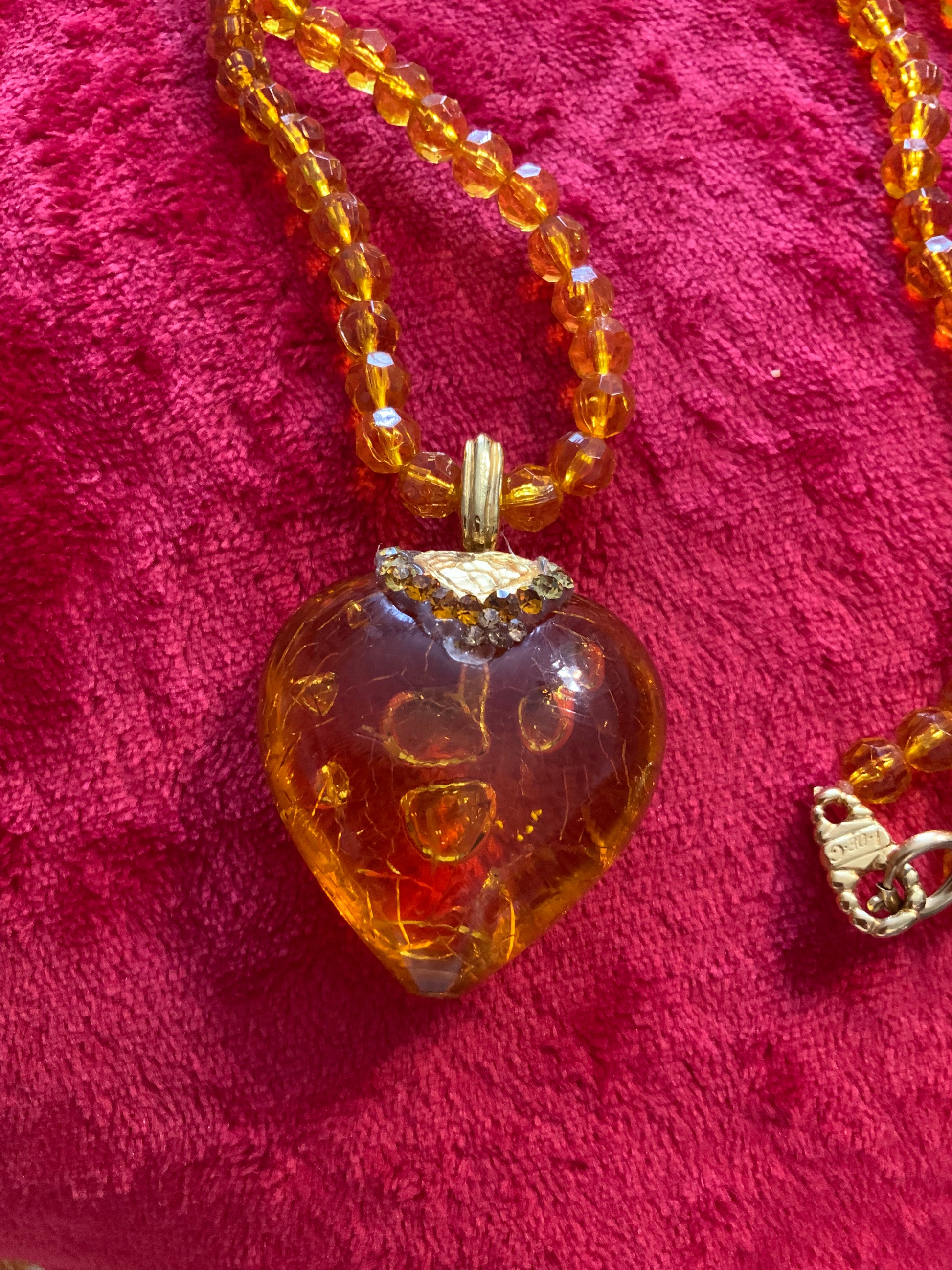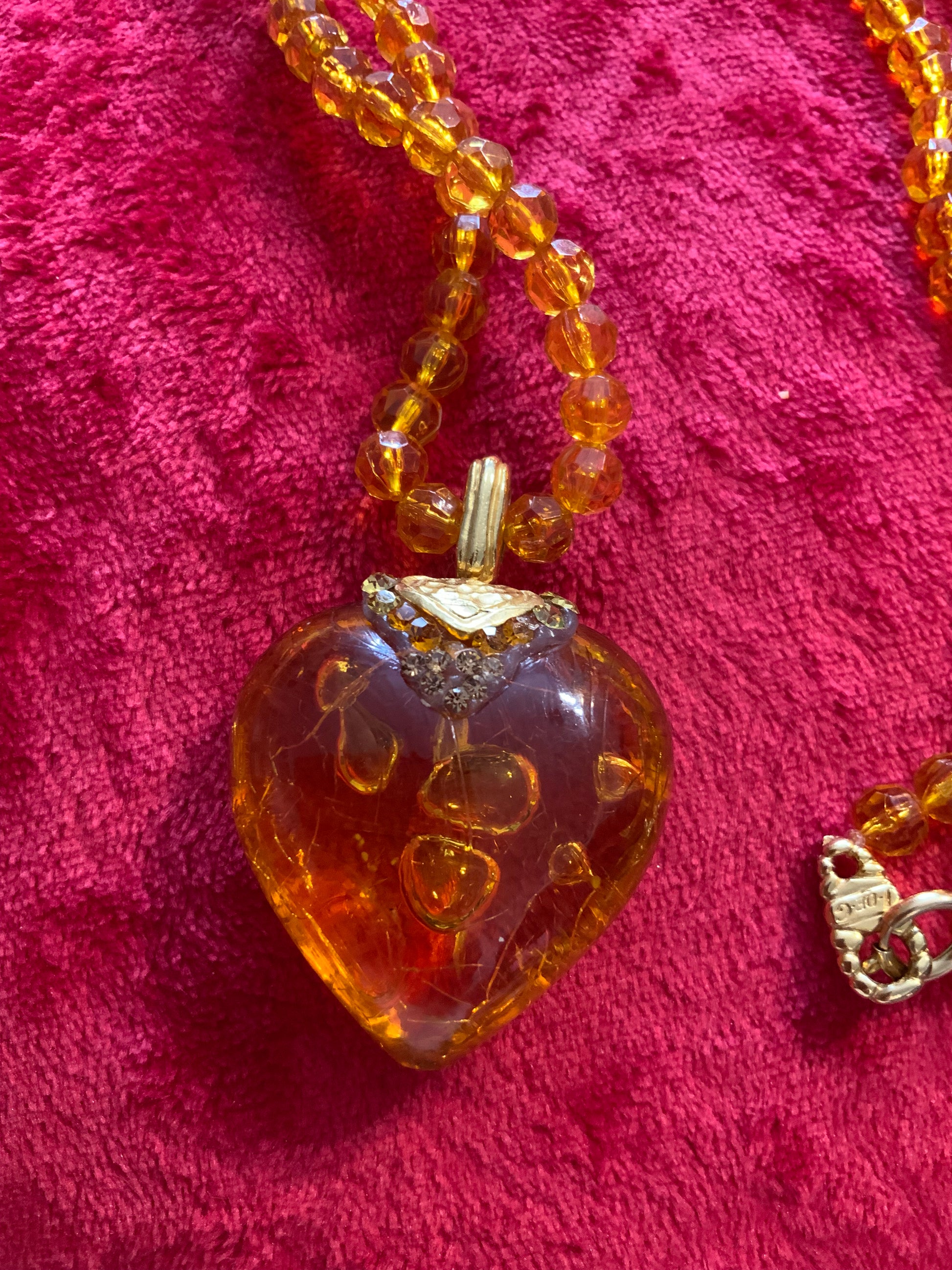 Superbe collier Coeur Jacky de G Vintage 1990 Perles et Coeur à strass jaunes en résine - Bon état a été porté - Signature plaque sur le fermoir, avec métal doré plaqué or.