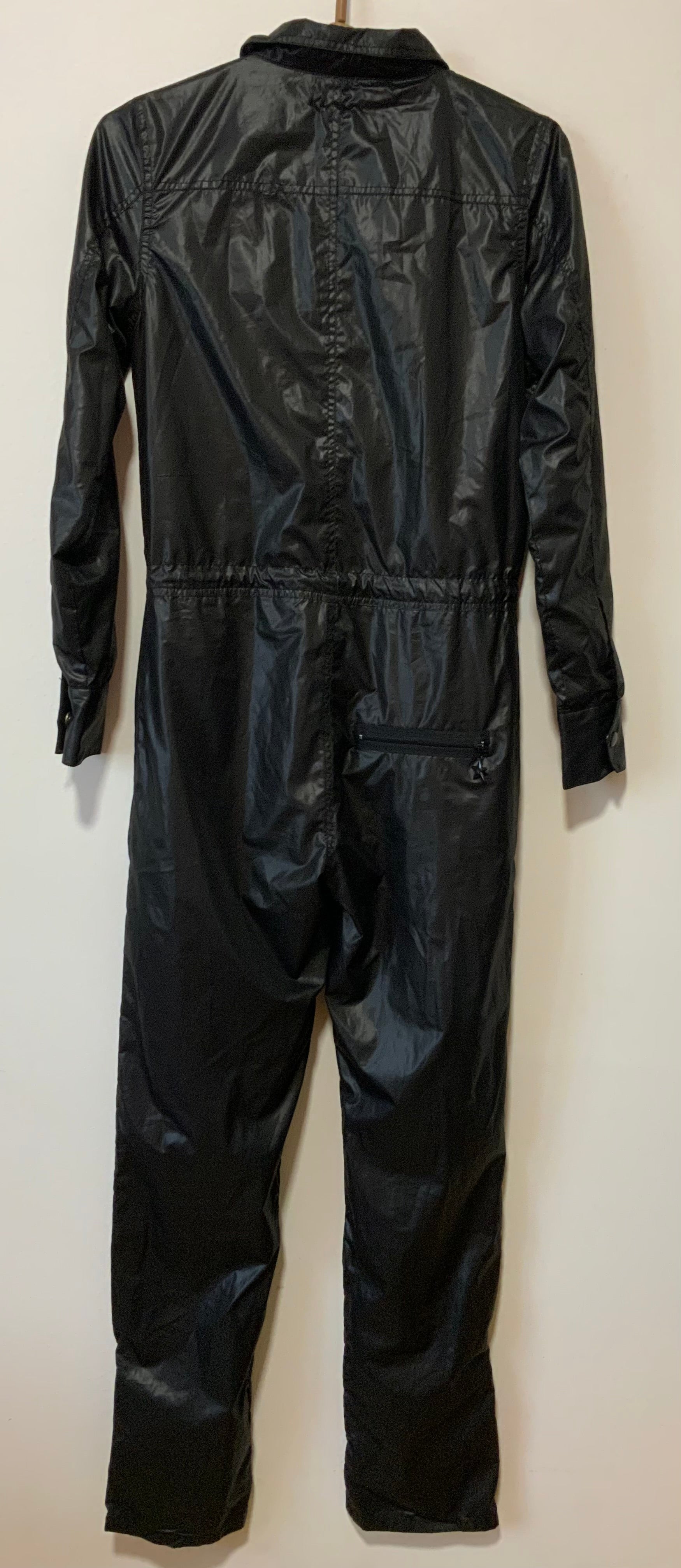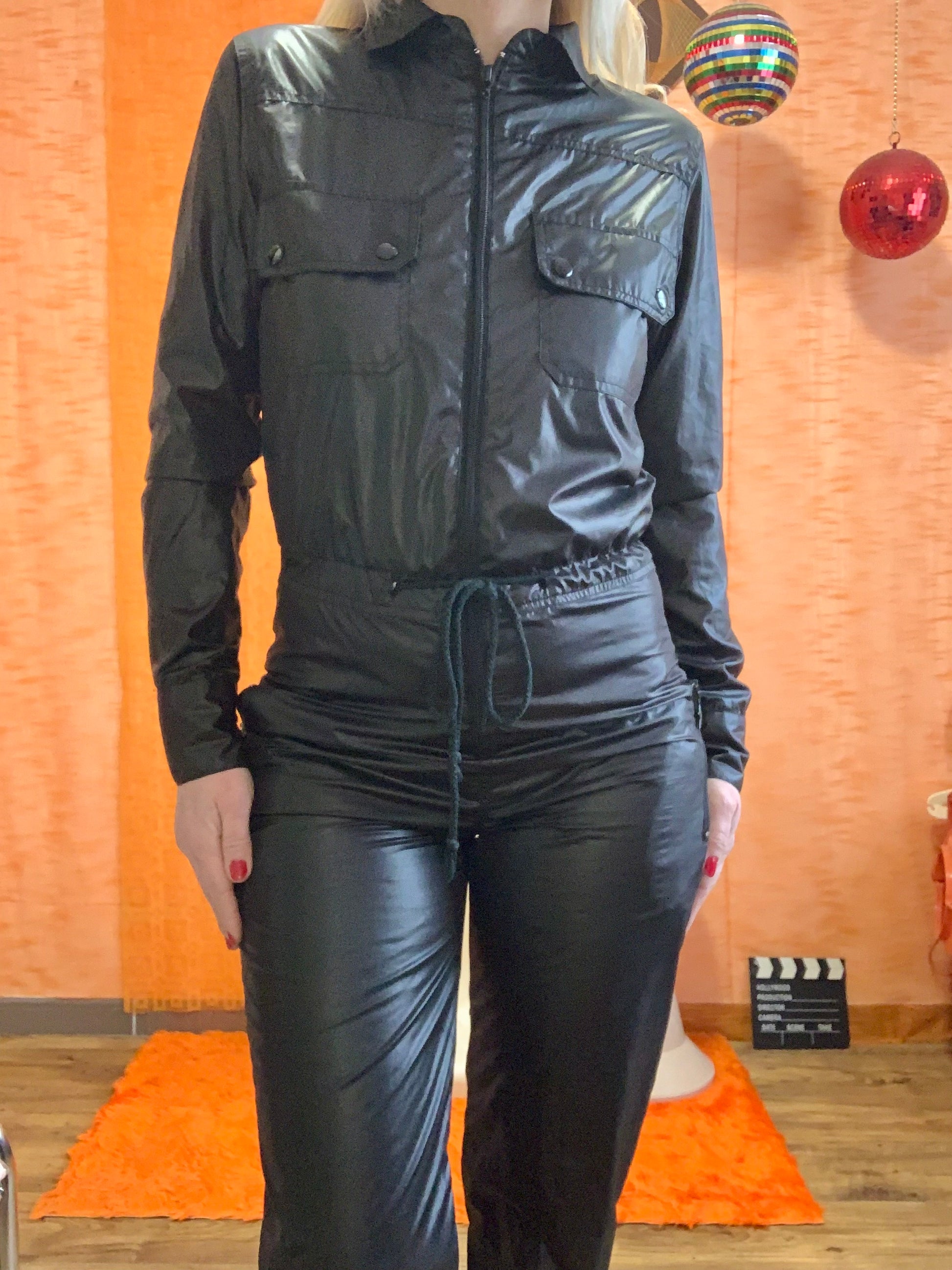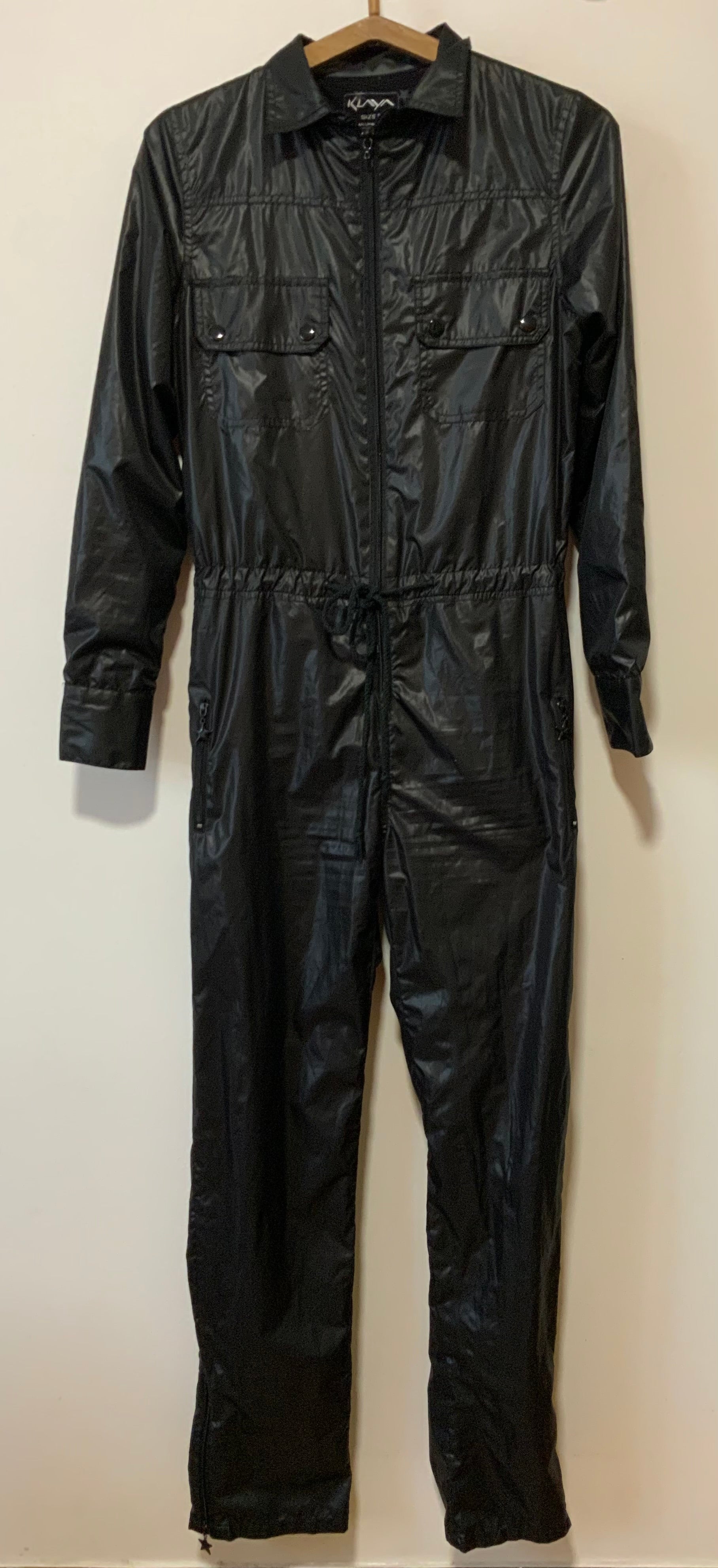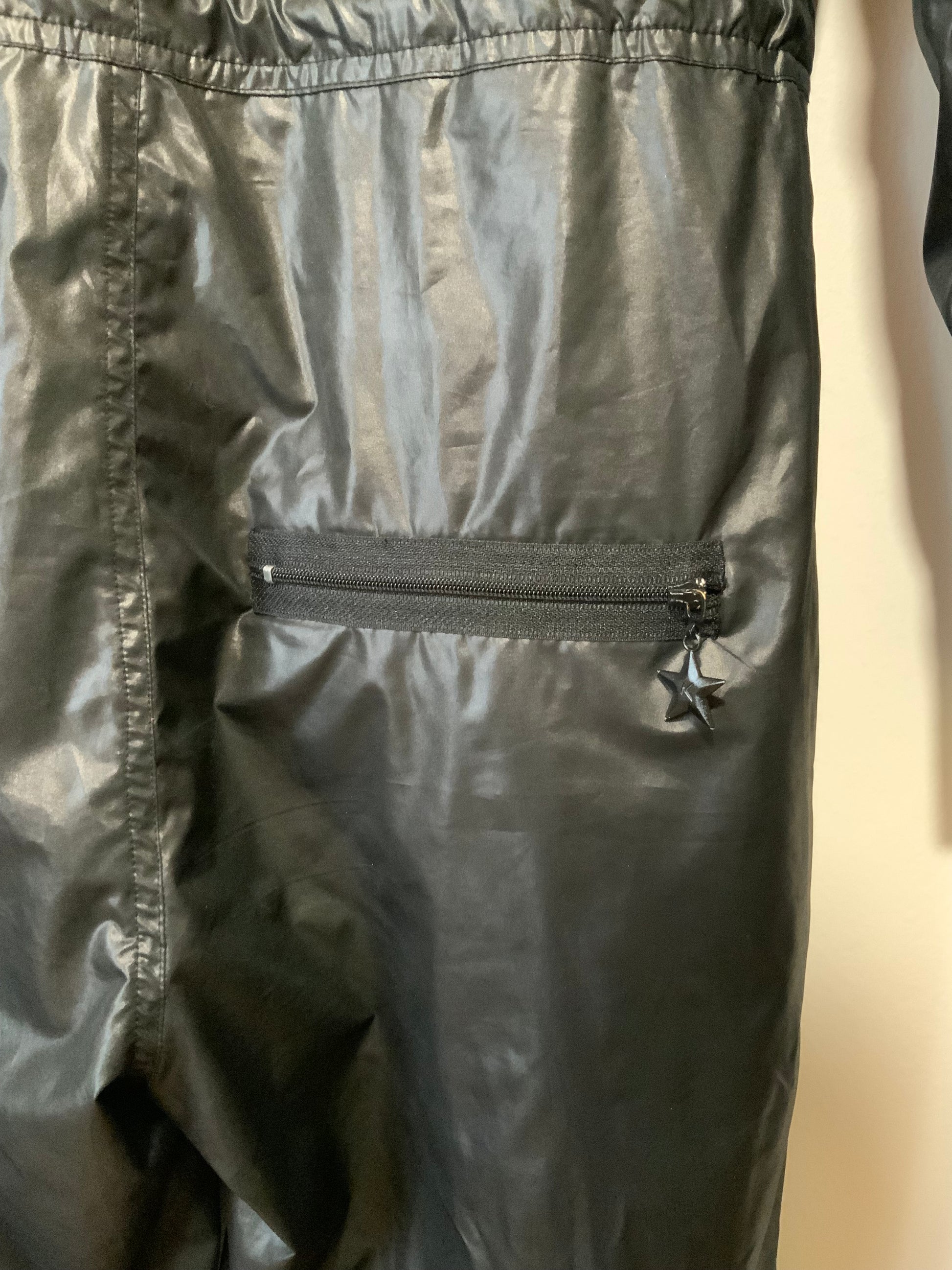 Combinaison noire en matière imperméable brillante - Motifs étoiles doublure et zips, de nombreuses poches, Manque juste la tirette du zip en haut sinon son état est excellent.