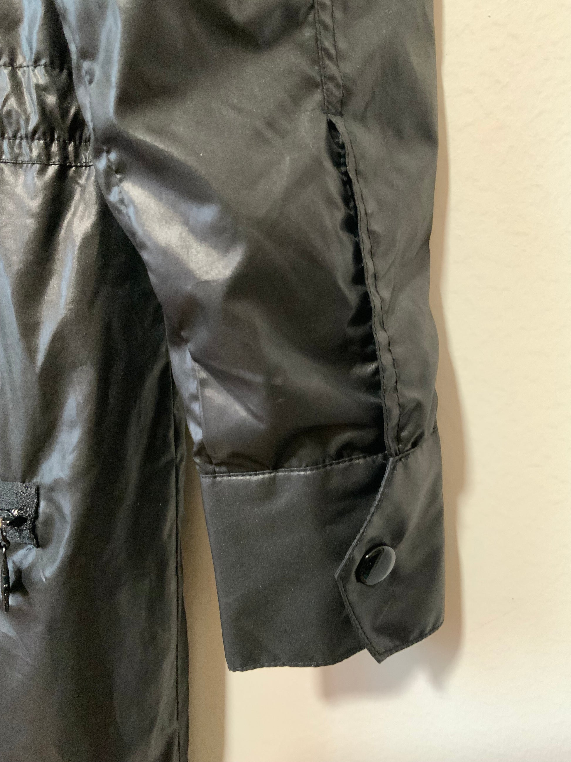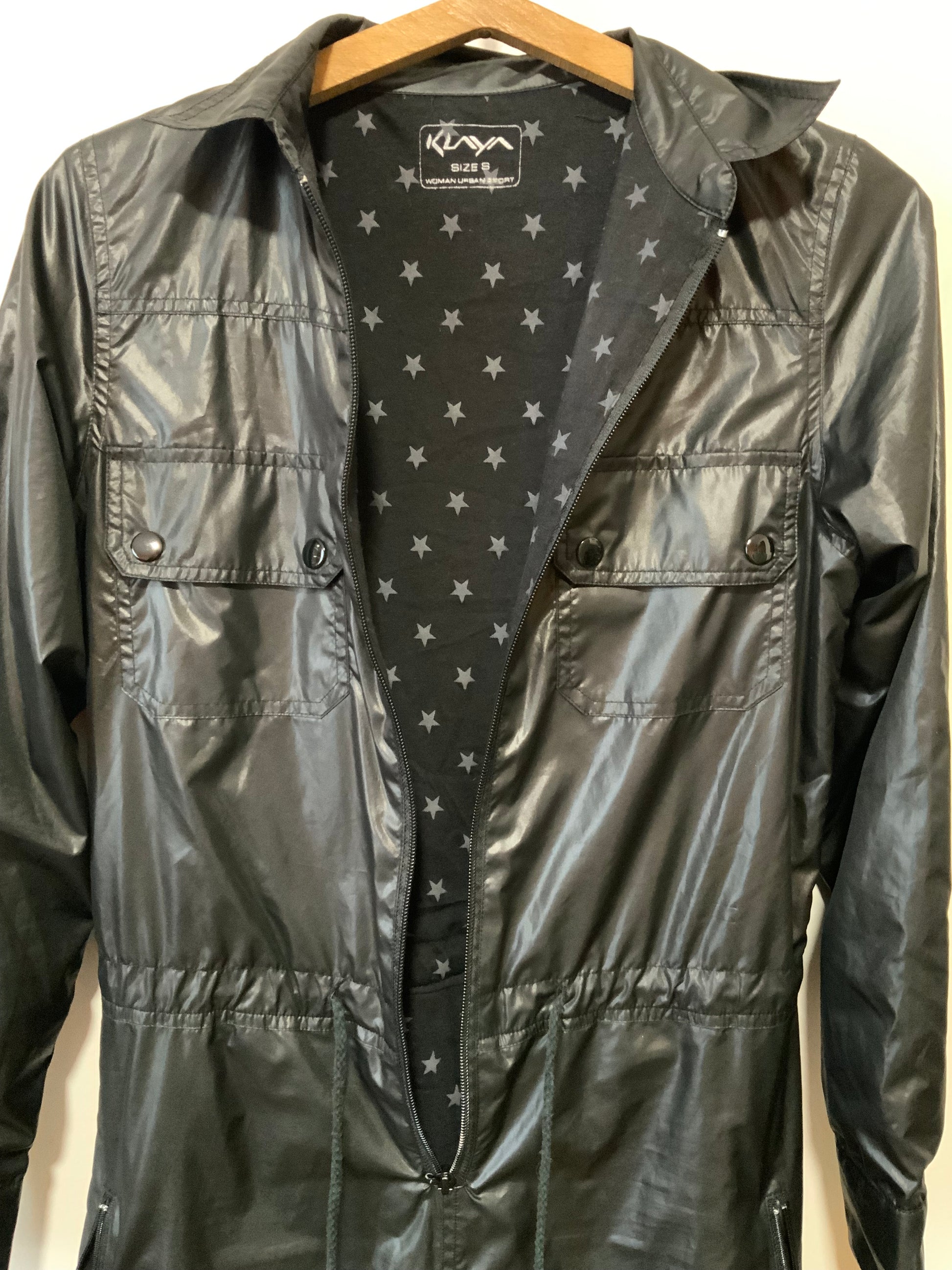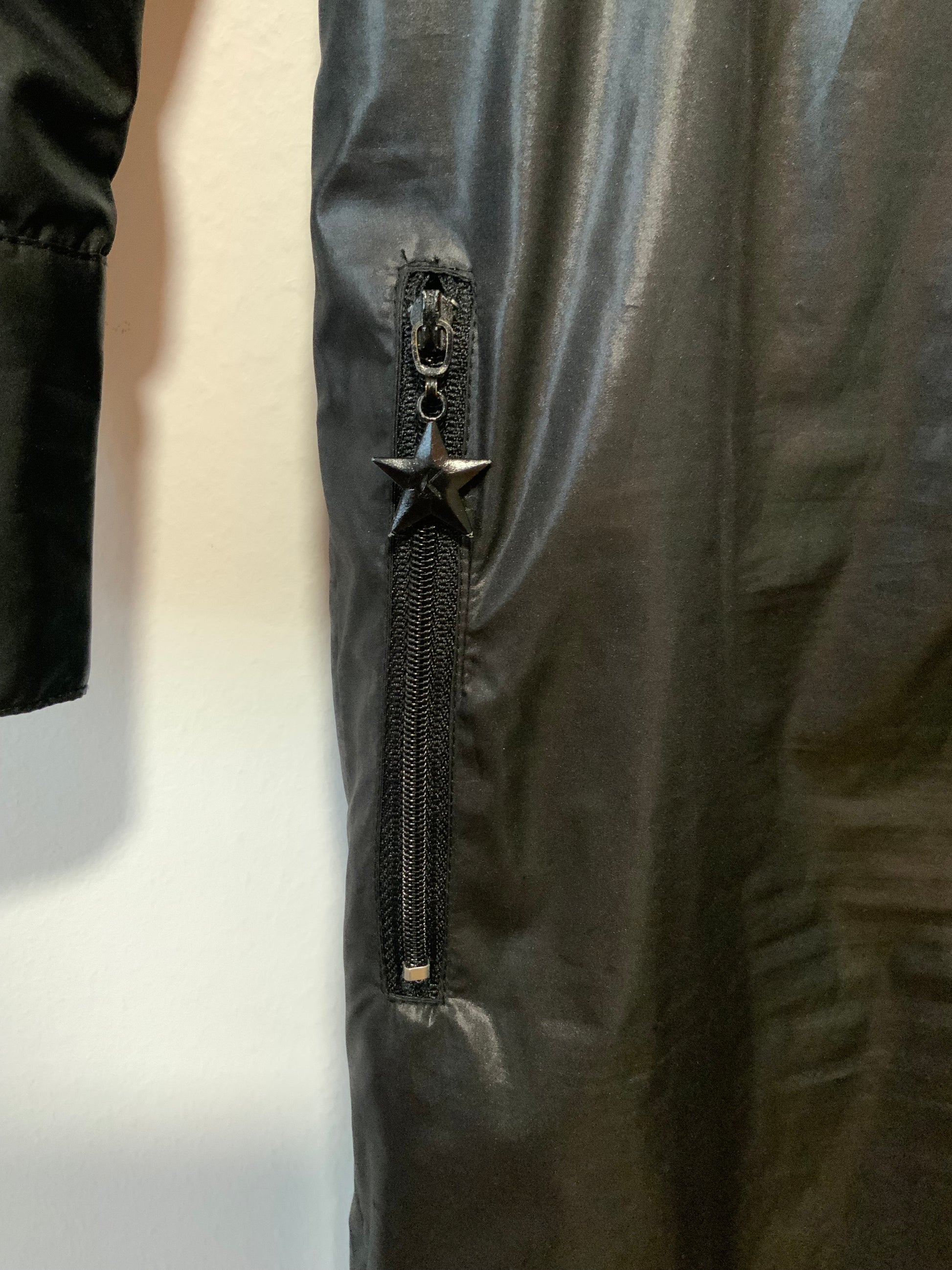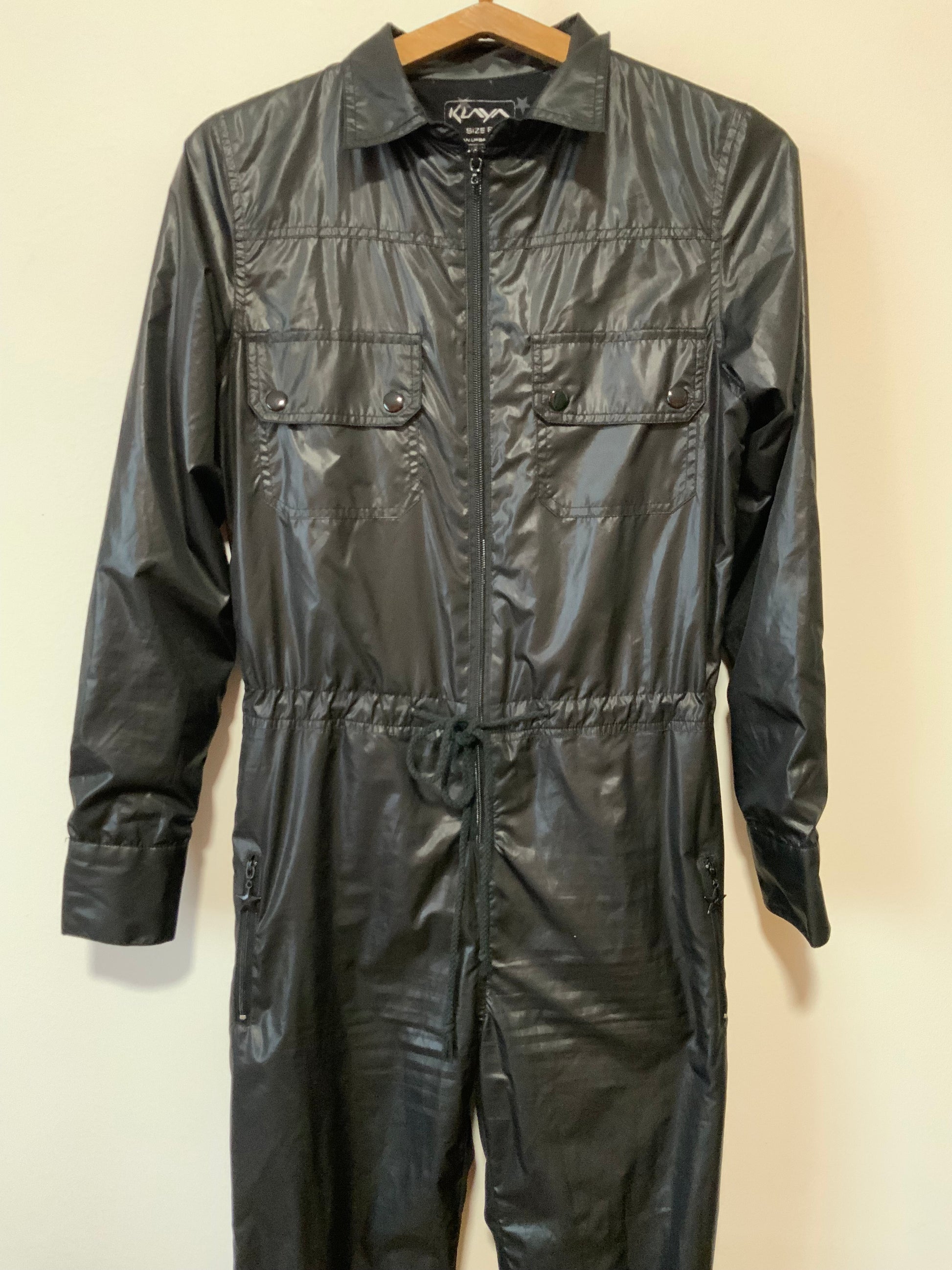 Combinaison noire en matière imperméable brillante - Motifs étoiles doublure et zips, de nombreuses poches, Manque juste la tirette du zip en haut sinon son état est excellent.