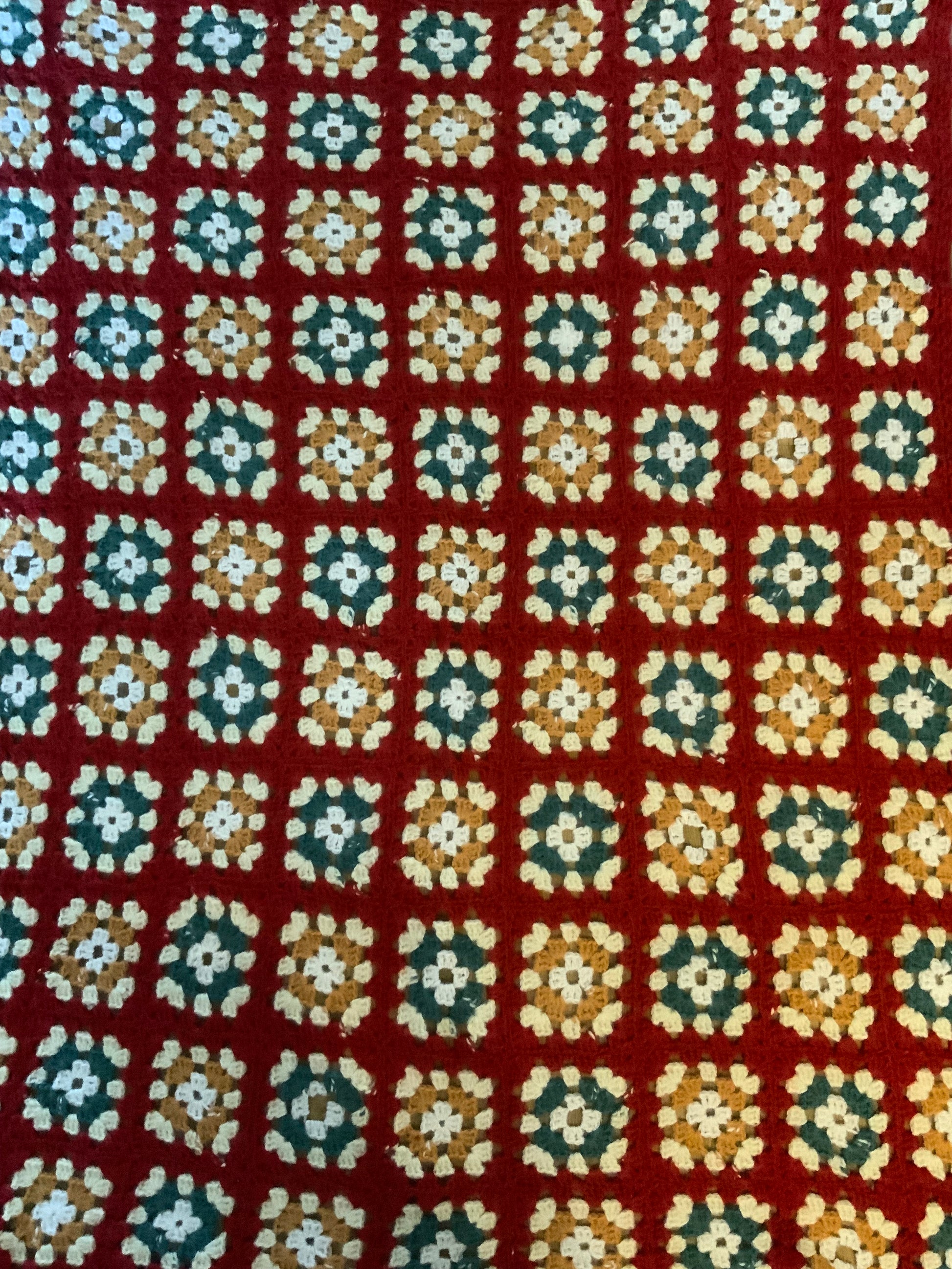 Couverture Laine au crochet Vintage 1970 - Rouge bordeaux vert moutarde et écrue - Excellent état sauf 2 petits défauts qui ne se voient pas voir la photo.