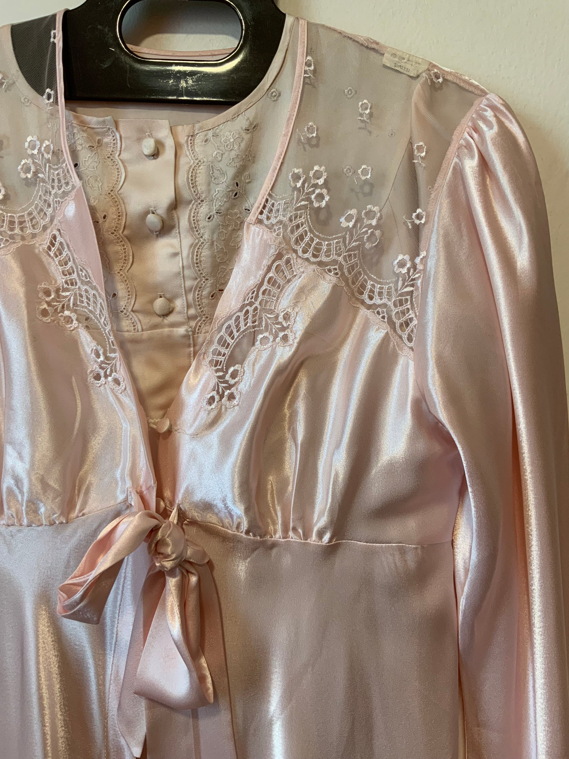 Tres bel ensemble de nuit Made in France satiné rose pâle 100% polyester en état non porté comme neuf.