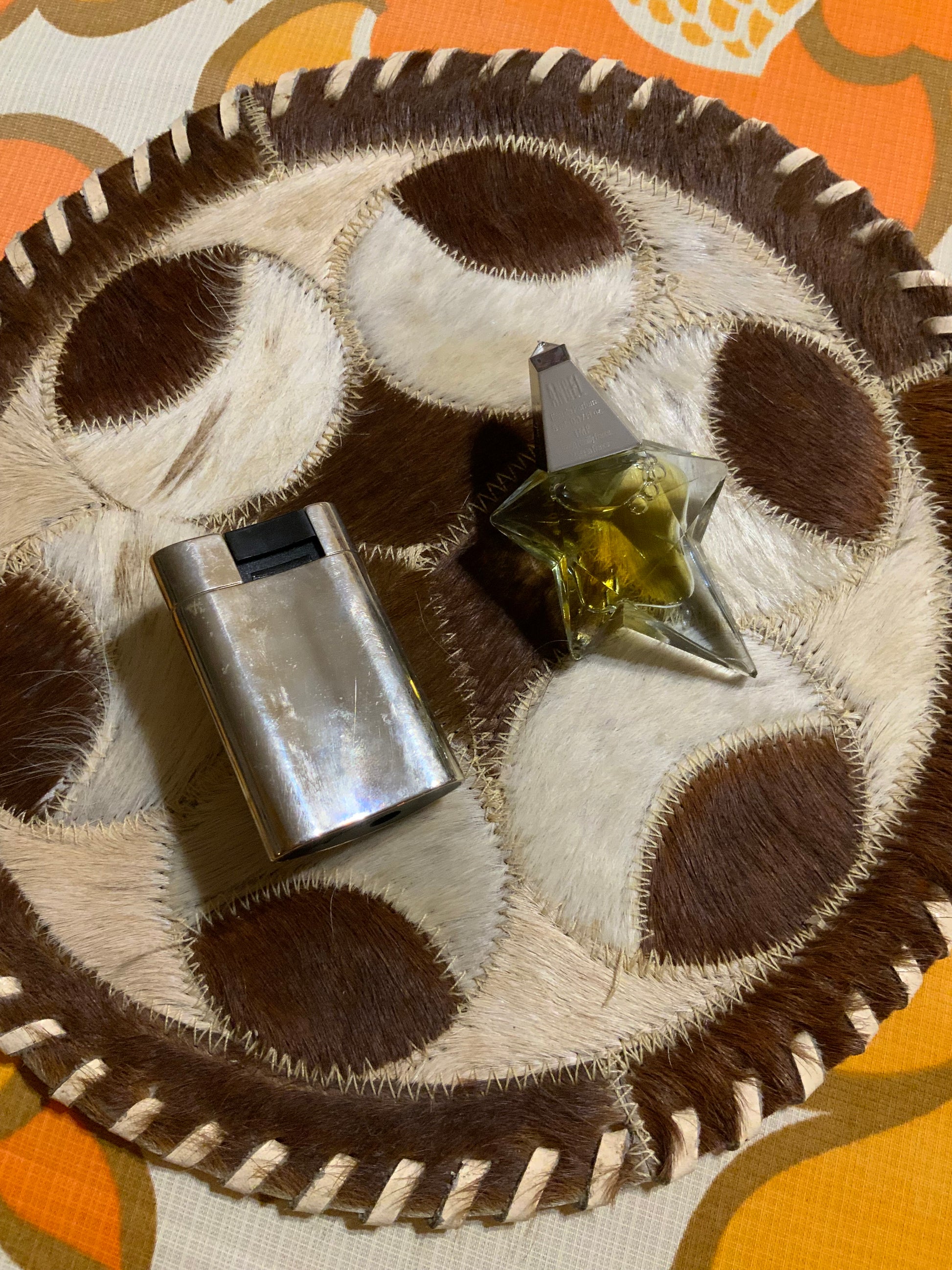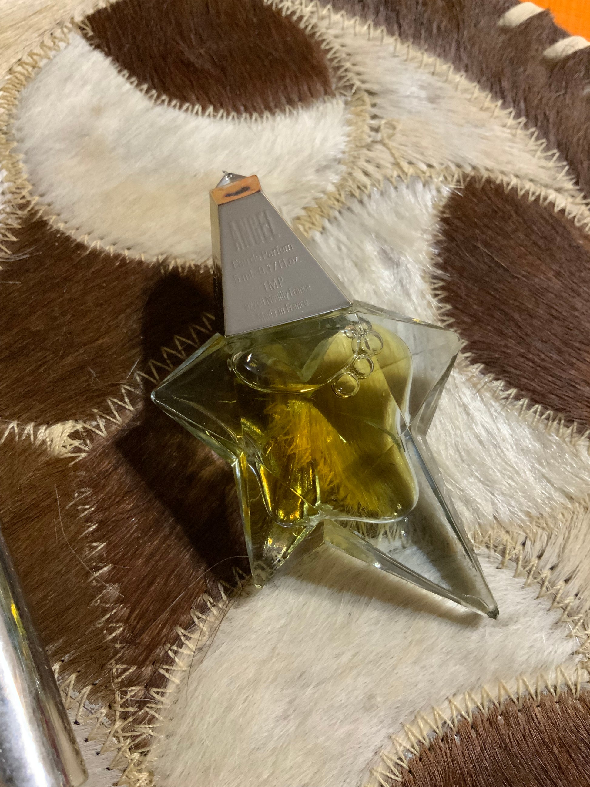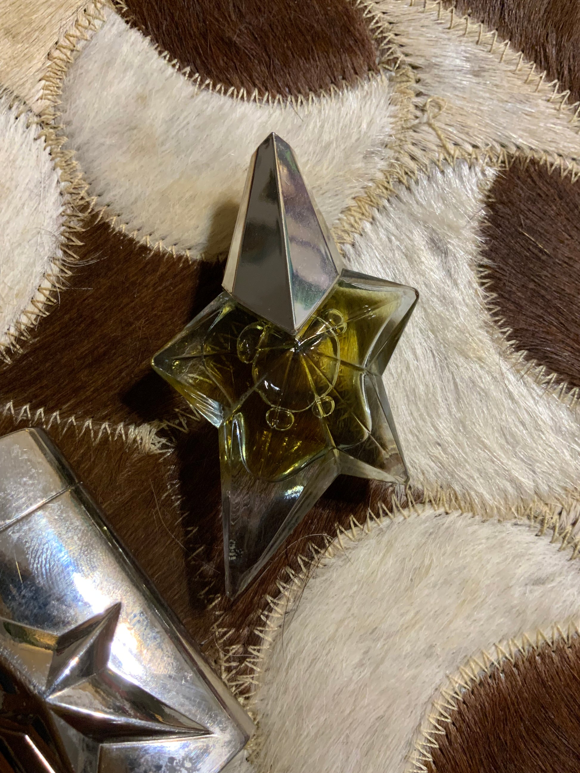 Ensemble Thierry Mugler France Le vaporisateur de sac métal argenté Hauteur 6,5 Largeur 4 centimètres - La miniature non ouverte eau de parfum 5 millilitres hauteur 7,5 Largeur 5 centimètres - Le tout en parfait état.