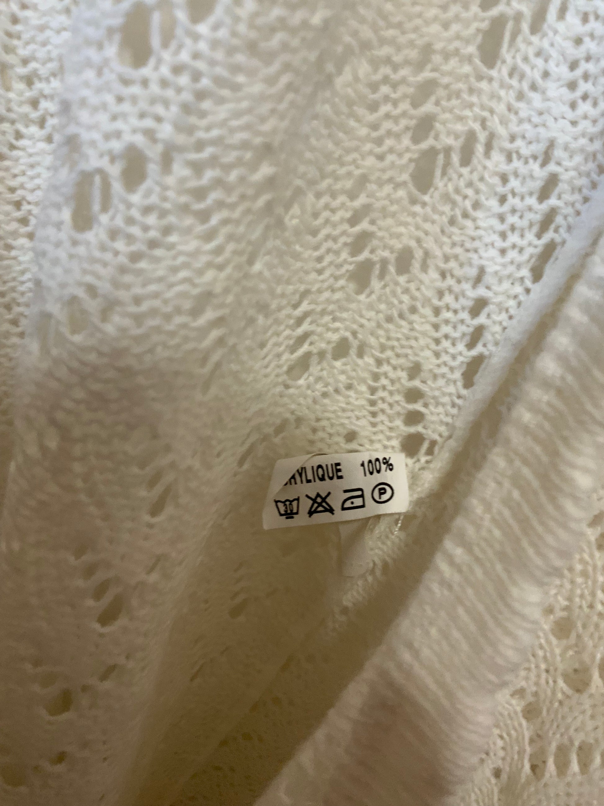 Écru - Taille unique - Ses mesures à plat = Épaules 42 Poitrine 50 Longueur 60 centimètres.