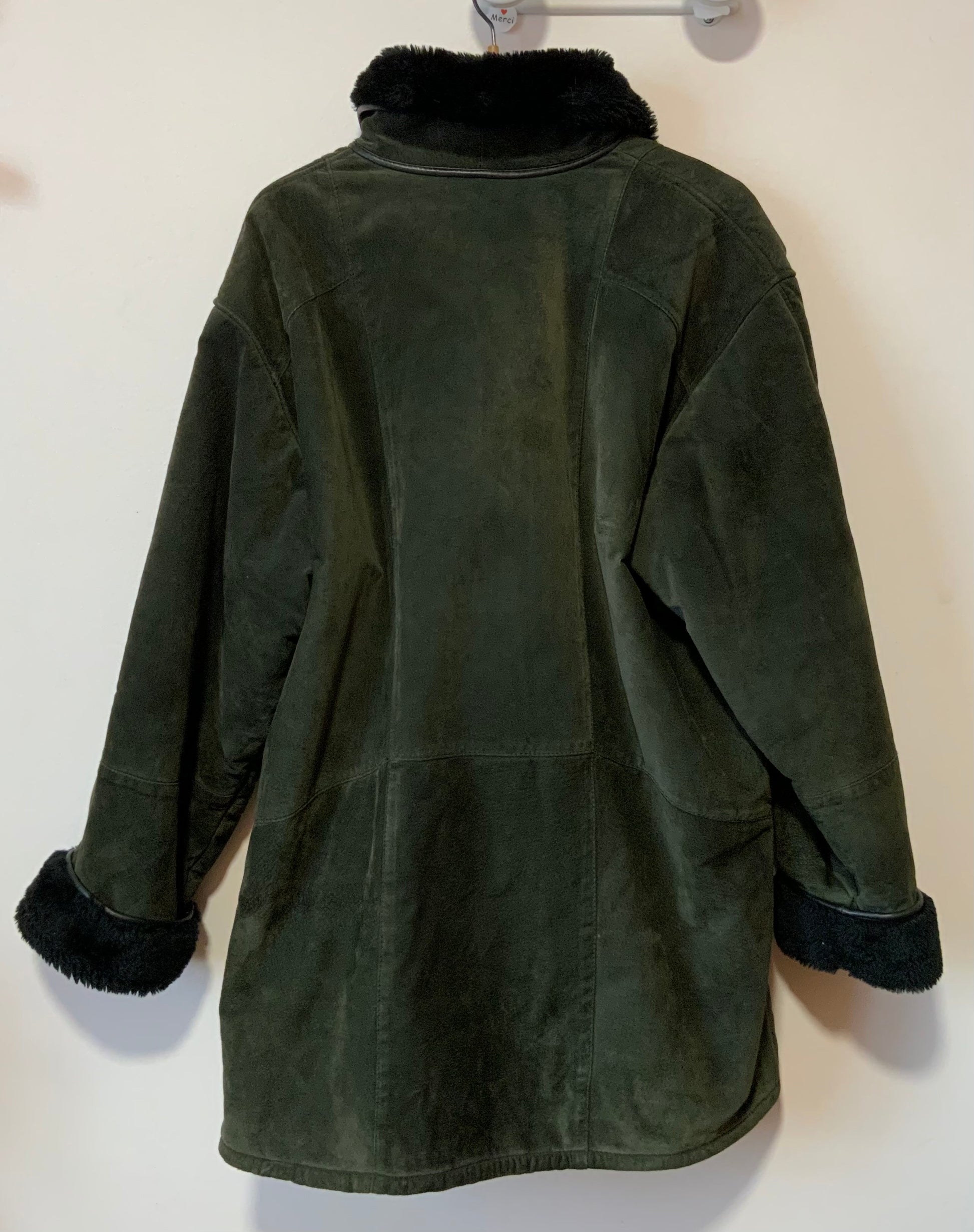 Gros manteau Vintage 1980 en daim vert foncé avec empiècements cuir Intérieur en fourrure synthétique très chaude - col bas de manches également - - Forme Large 3/4- Excellent état sauf usure des contours cuirs sur poches et devant.