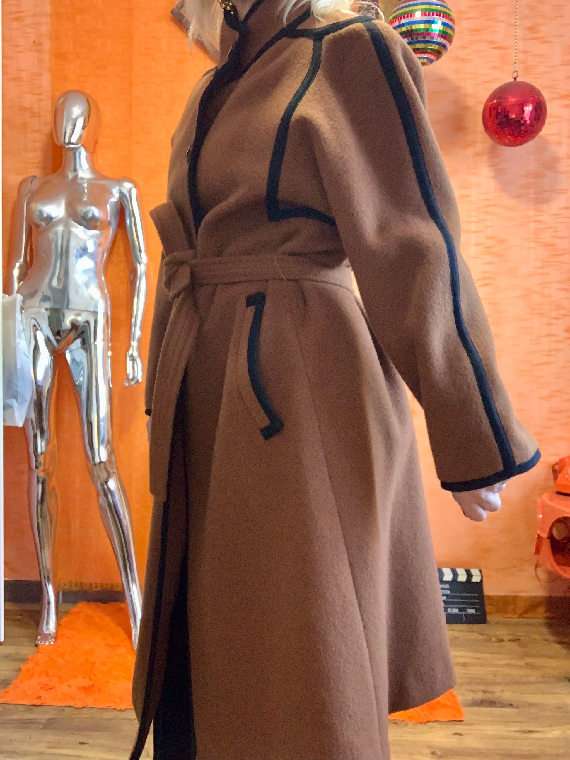 Superbe Manteau Trench en Laine 1980 couleur marron café avec grosses surpiqûres noires et boutons sublimes purs eighties- Entièrement doublé satiné marron avec poches et ceinture- Etat parfait.