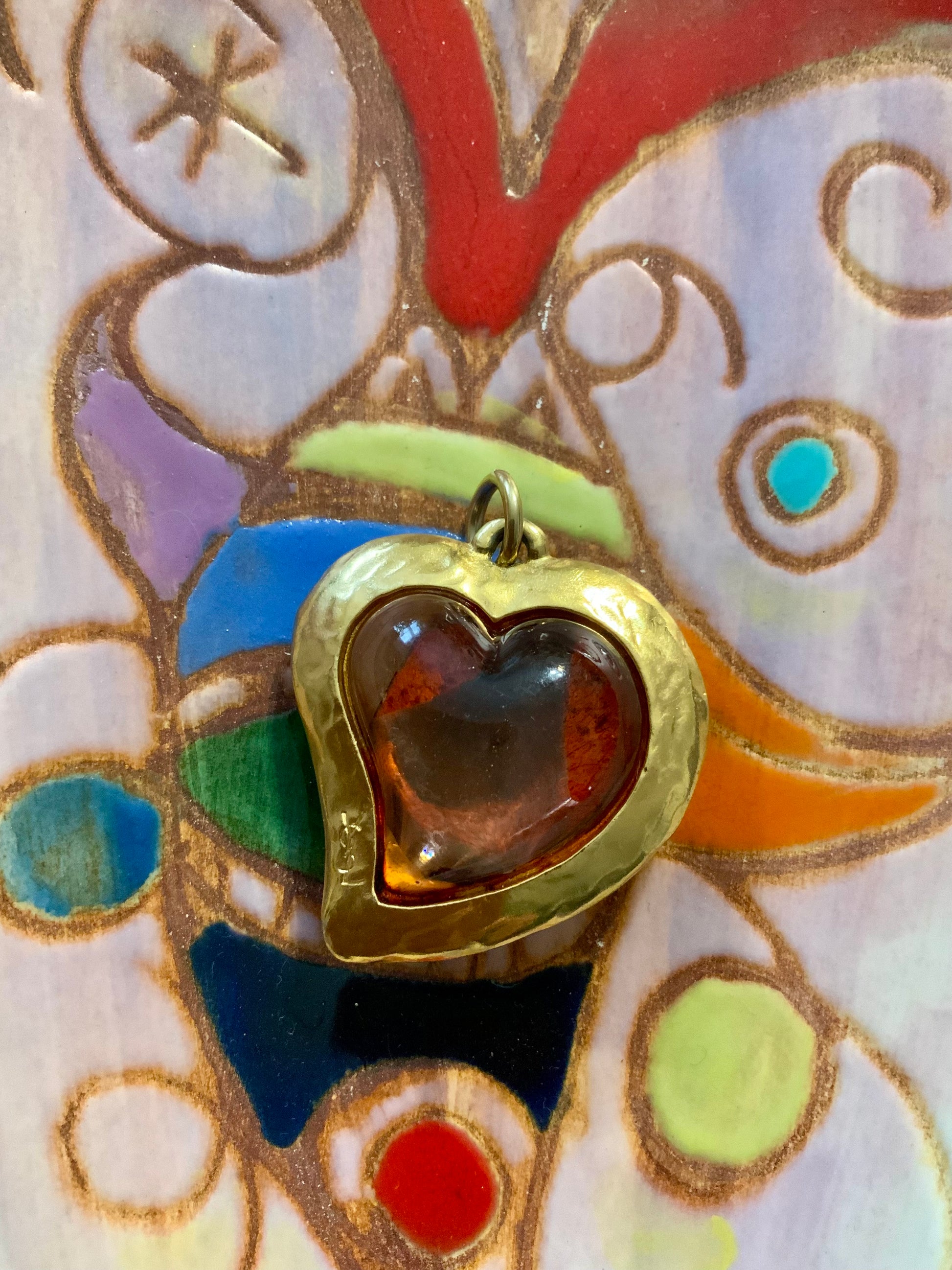 Pendentif Coeur Yves Saint Laurent Vintage en métal doré et résine centrale au relief ambrés avec une partie de pétale de rose incrustée coulée dans la résine - Signature YSL Yves Saint Laurent France Paris Luxe et intemporel.