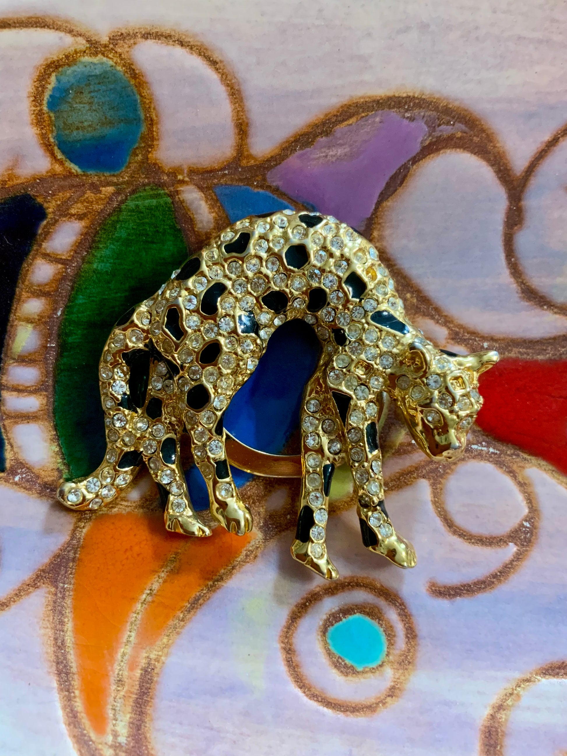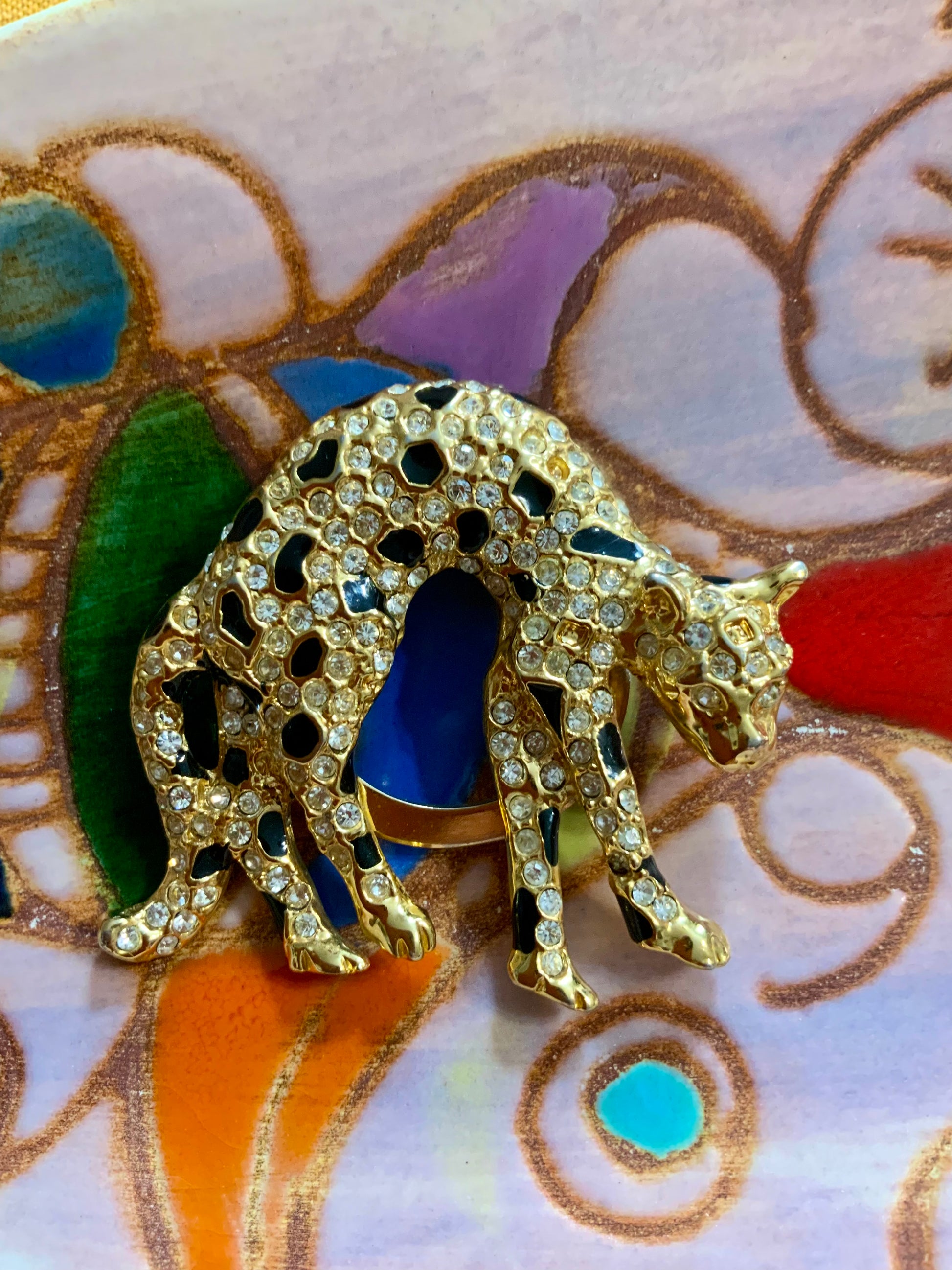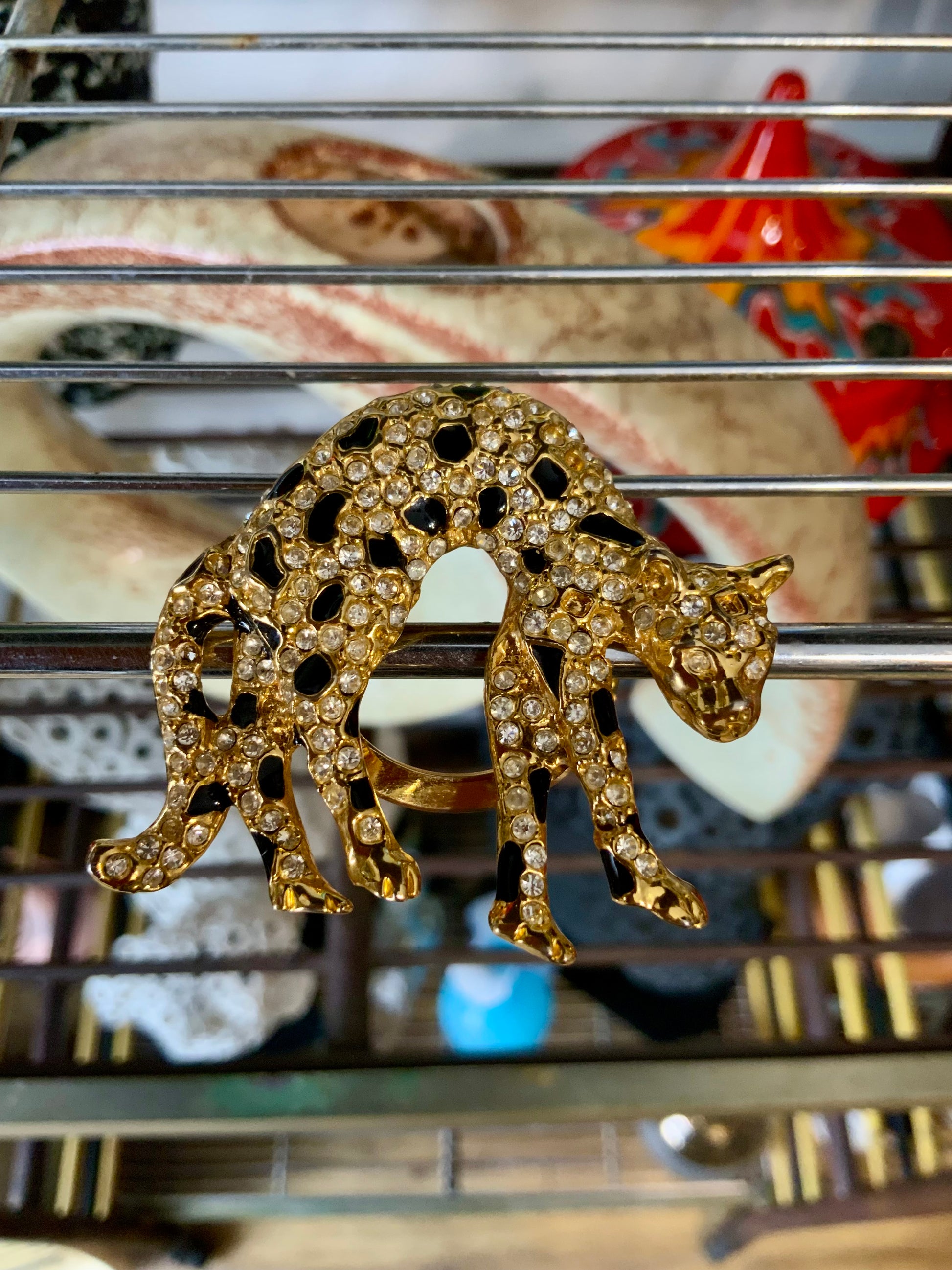 Pince a foulards Léopard Vintage Strass et métal doré - Très bon état sauf 2 petit strass manquants ne se voit absolument pas.