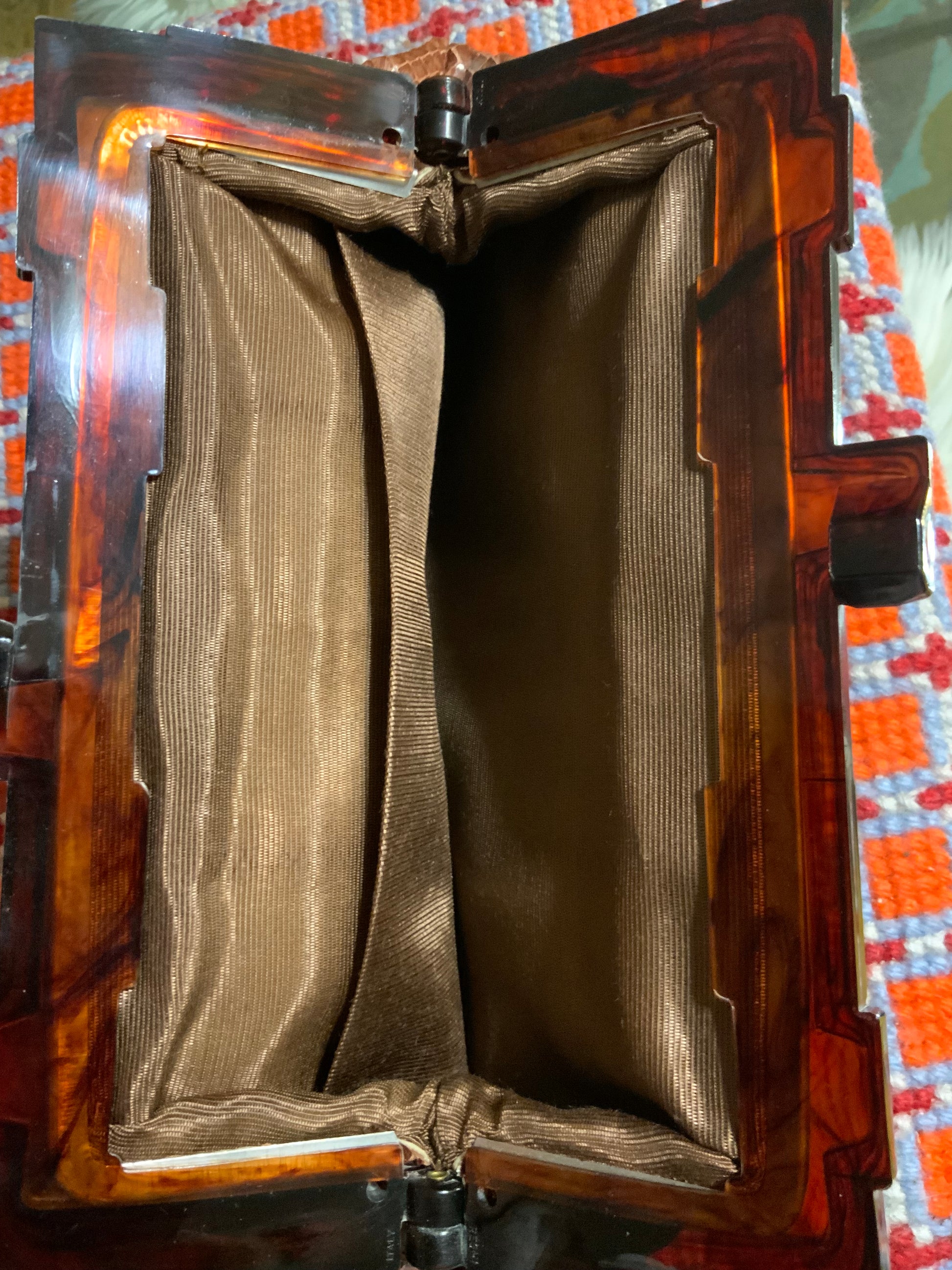 Très belle pochette cuir python Vintage 1960 Marron avec empiècement pour passage du poignet au dos, son état est excellent comme neuf y compris son Intérieur.
