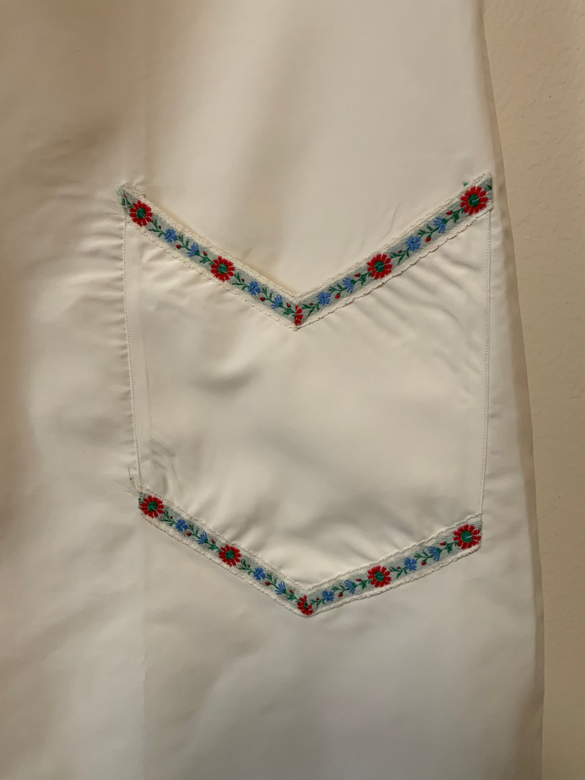 Robe Blouse en nylon blanche avec liserés à fleurs bleues rouges vertes , Boutonnée au dos avec poches De Confection Bragard dans les Vosges- état comme neuf n’a jamais été portée.
