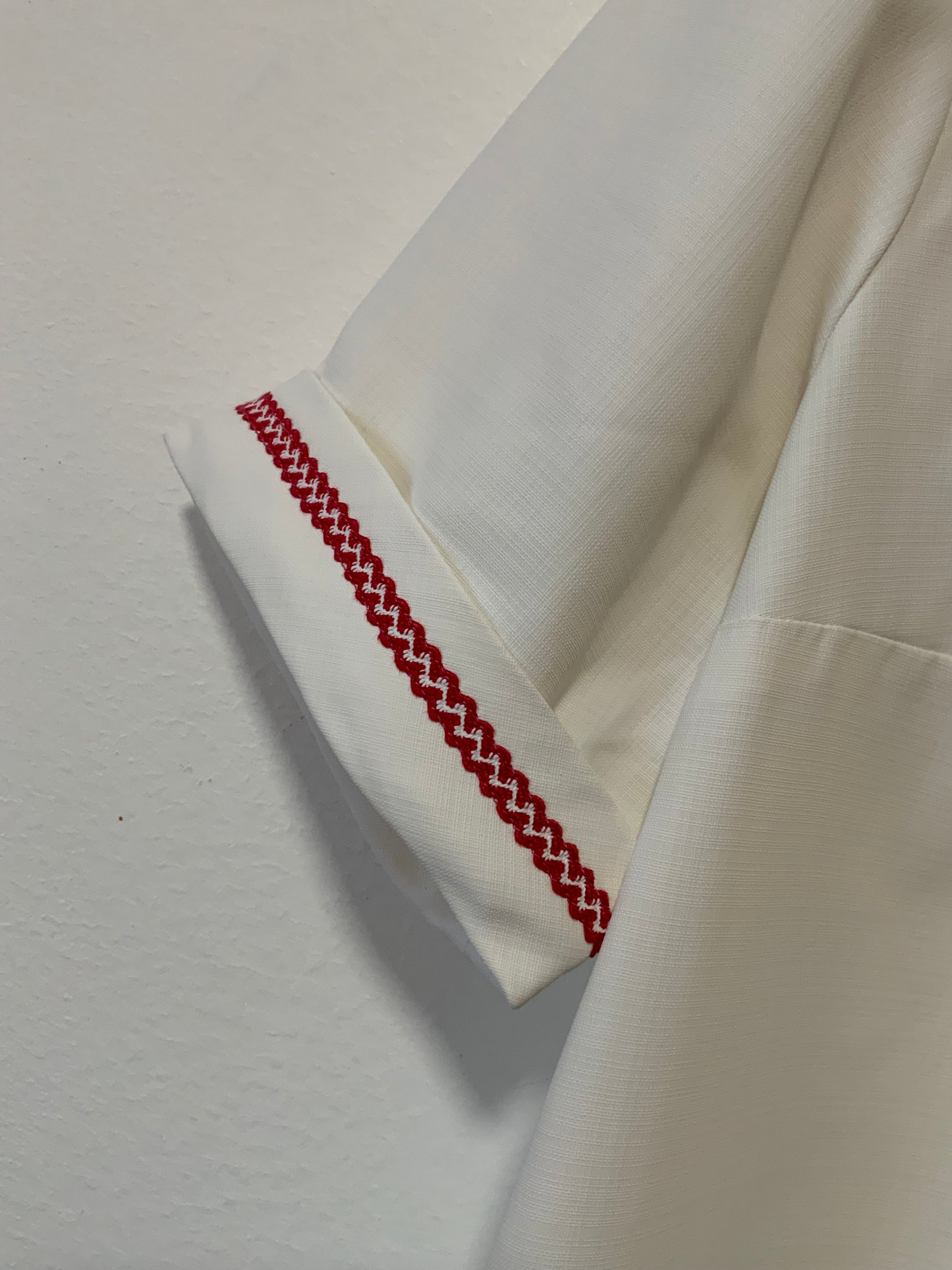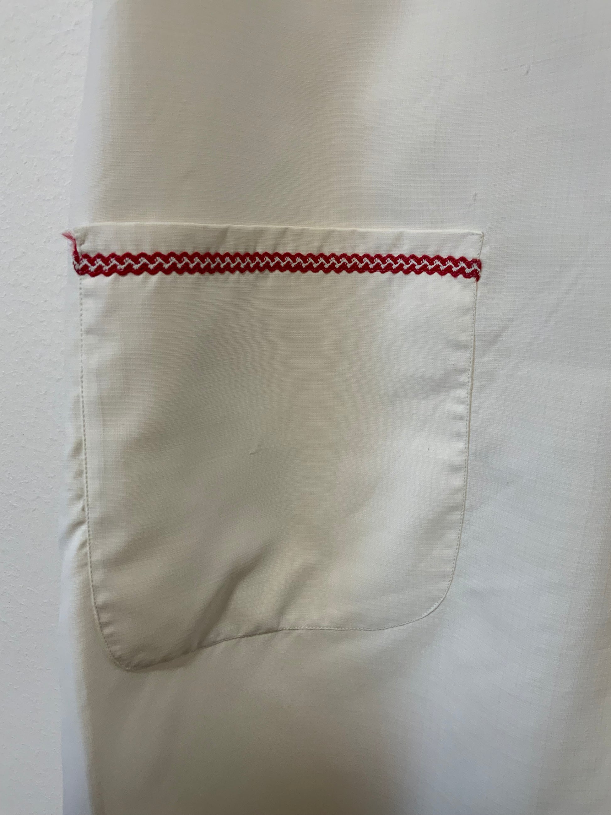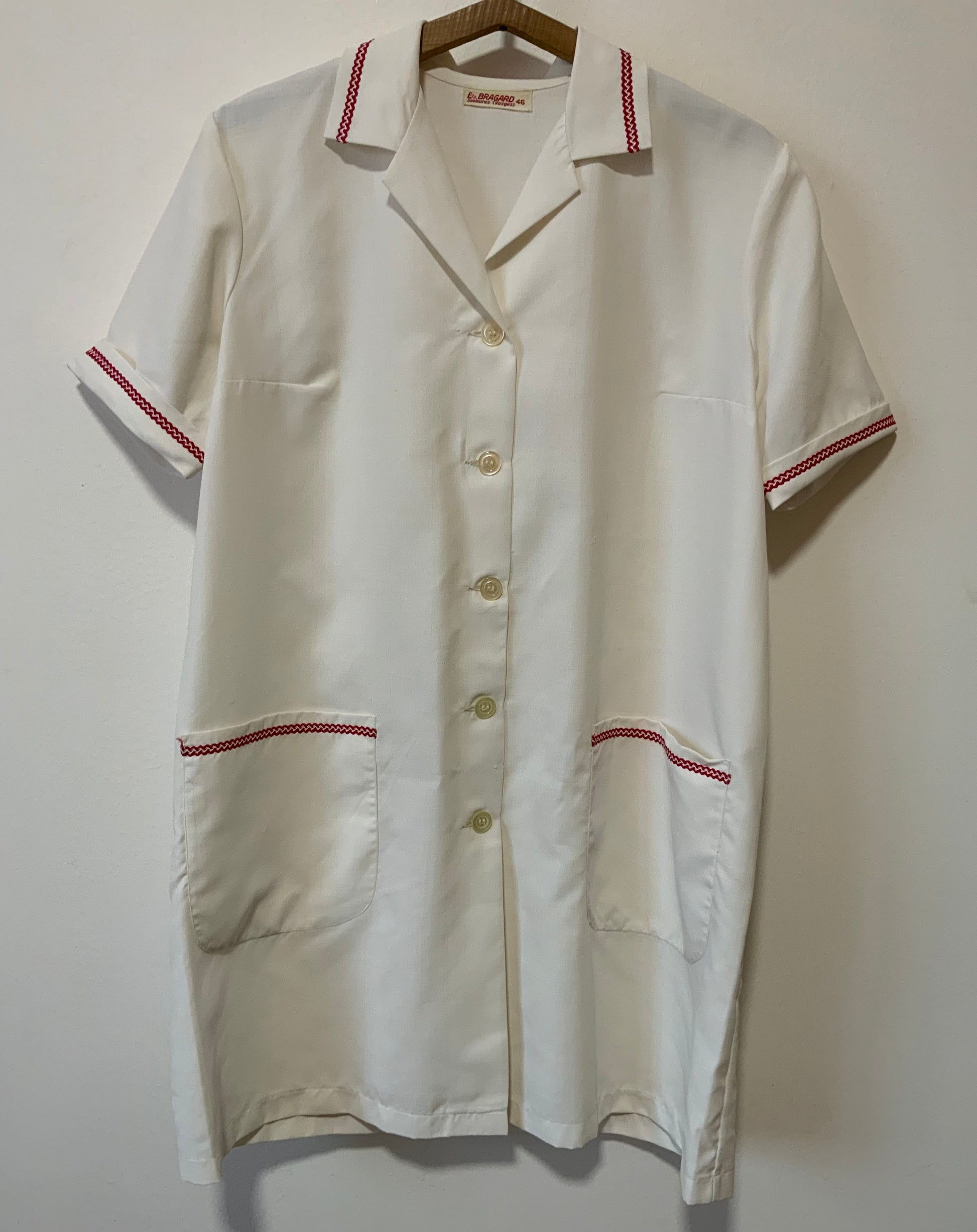Robe Blouse en nylon blanche avec liserés rouges , Boutonnée devant avec poches De Confection Bragard dans les Vosges- état comme neuf n’a jamais été portée.