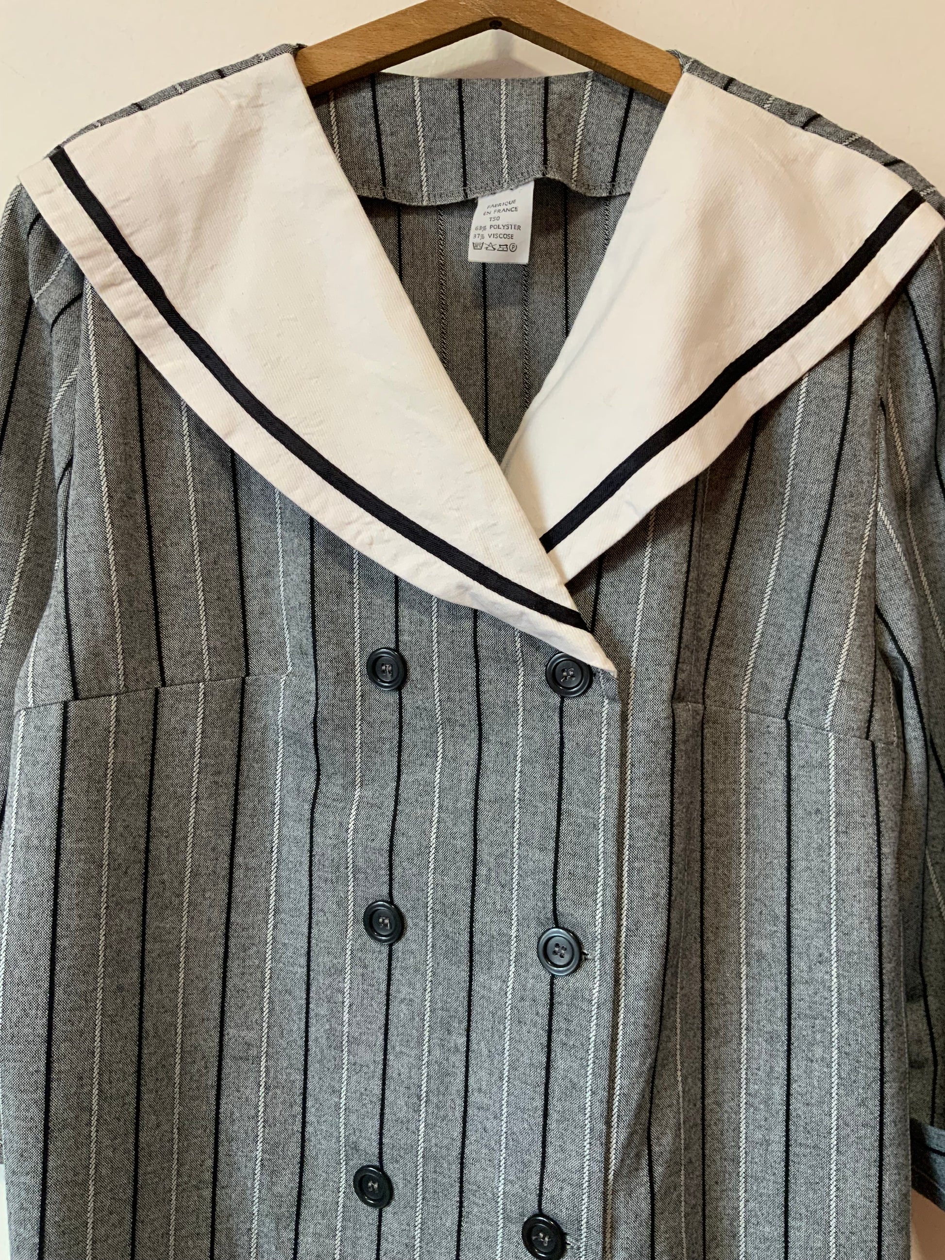 Belle Robe à rayures Boutonnée France 1980 Vintage a grand col marin - Rayures noires et blanches sur fond gris- Manches 3/4 Et col blanc en coton- Fabriquée en France 63% polyester 37% Viscose, double boutonnage- Fabriquée en France.