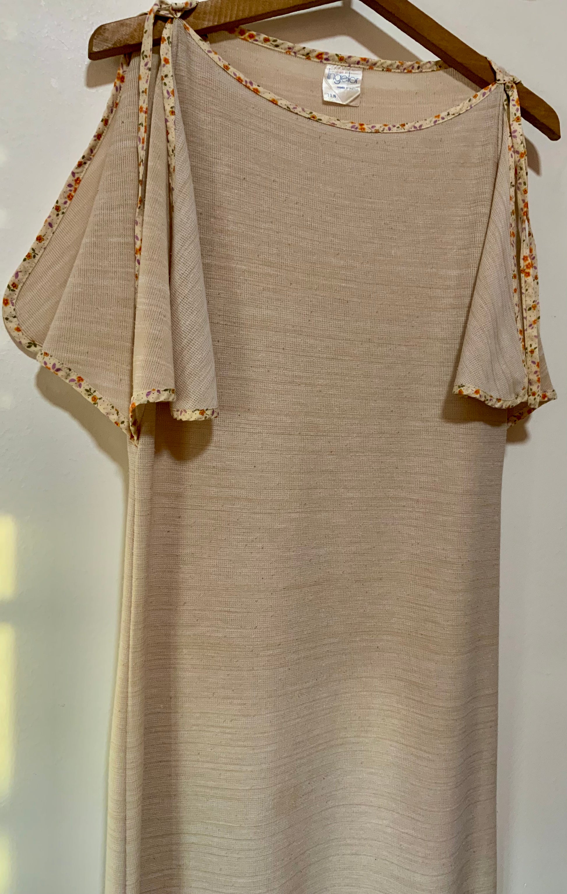 Tres belle robe longue beige avec manches papillons Vintage 1970 Motifs fleurs oranges en bordures - Très bon état - Fendue-