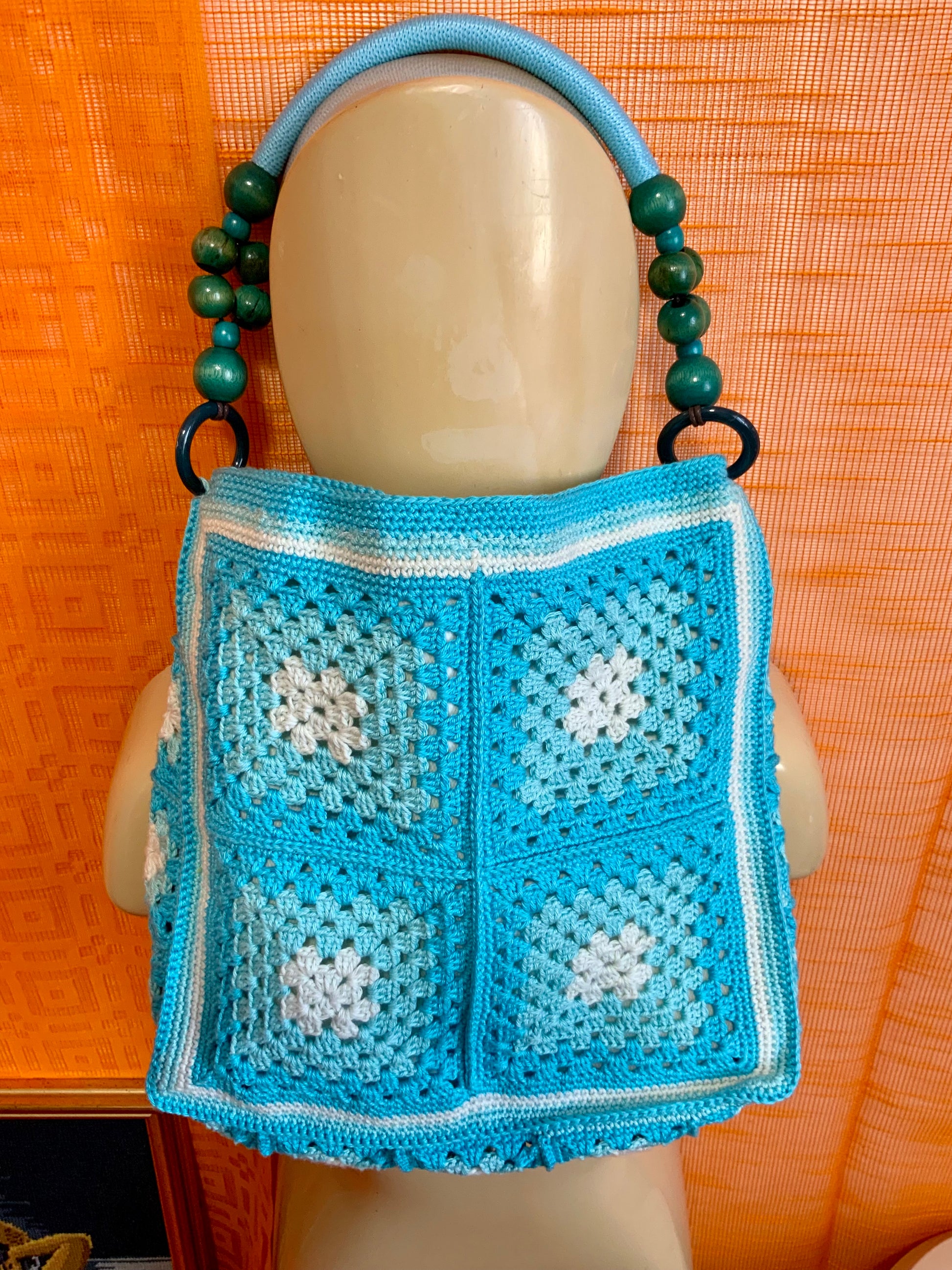Sac à main Turquoise fait main Façon Vintage en laine au crochet avec intérieur en simili cuir blanc et poignée avec perles en bois.