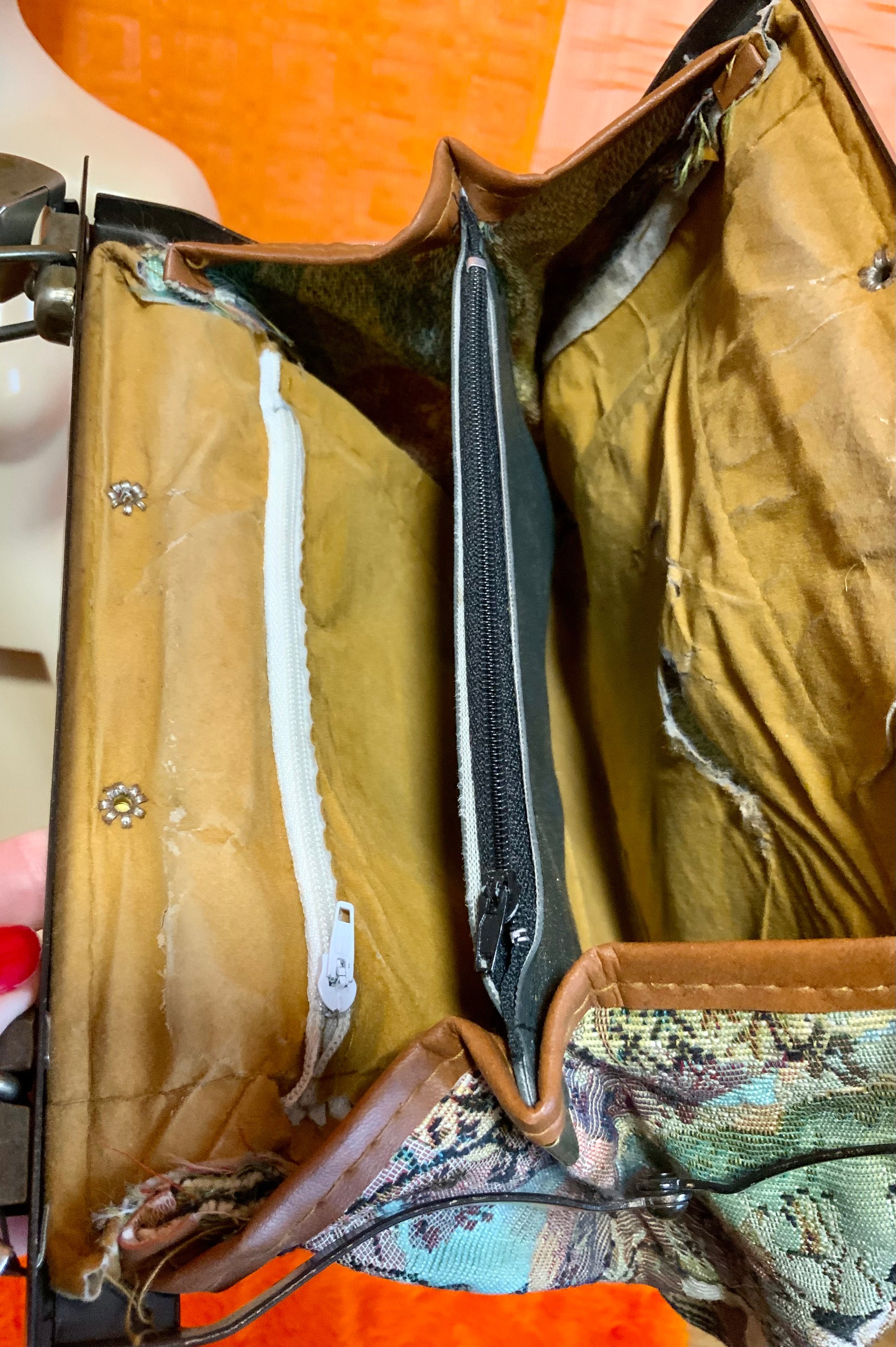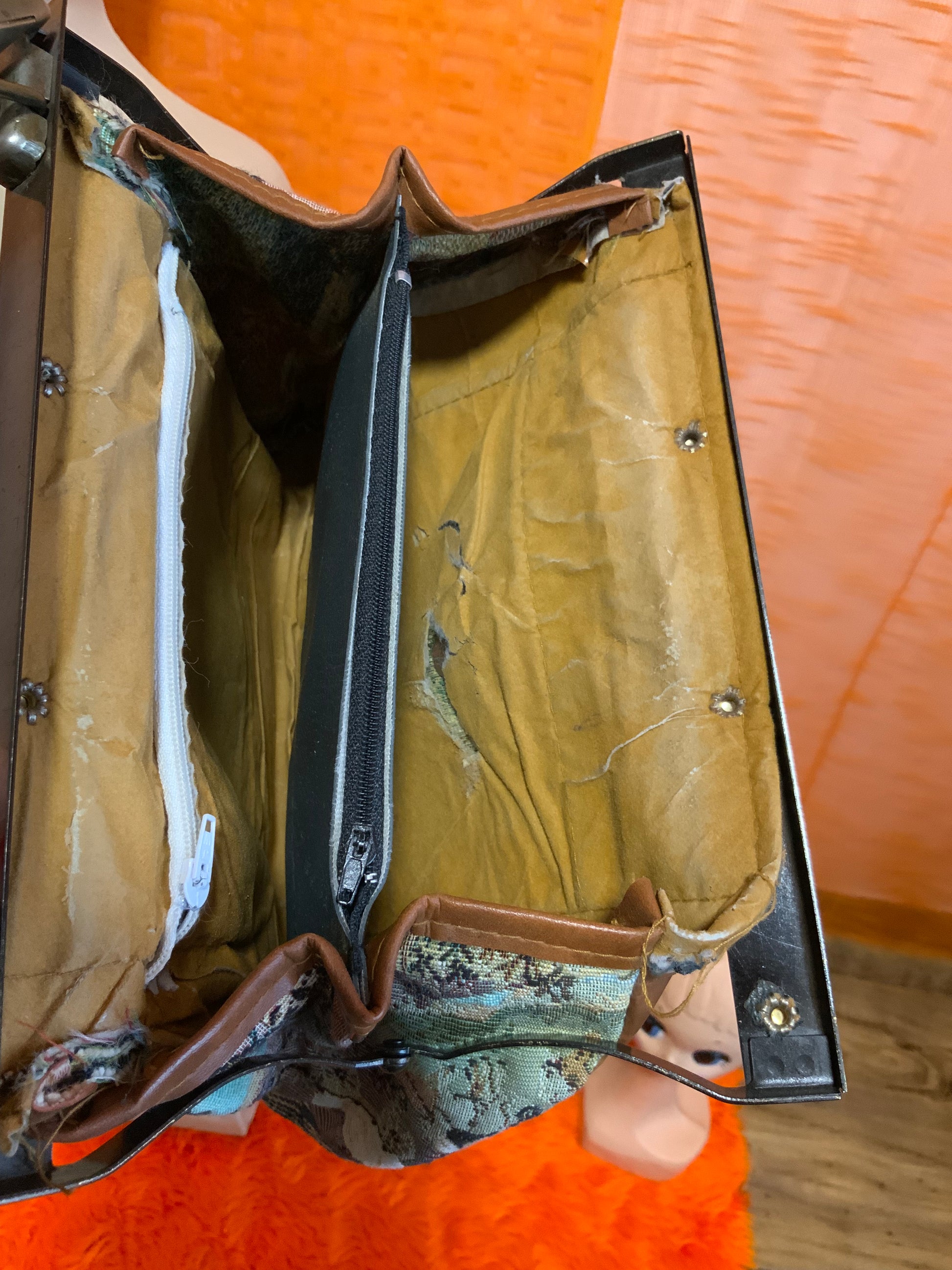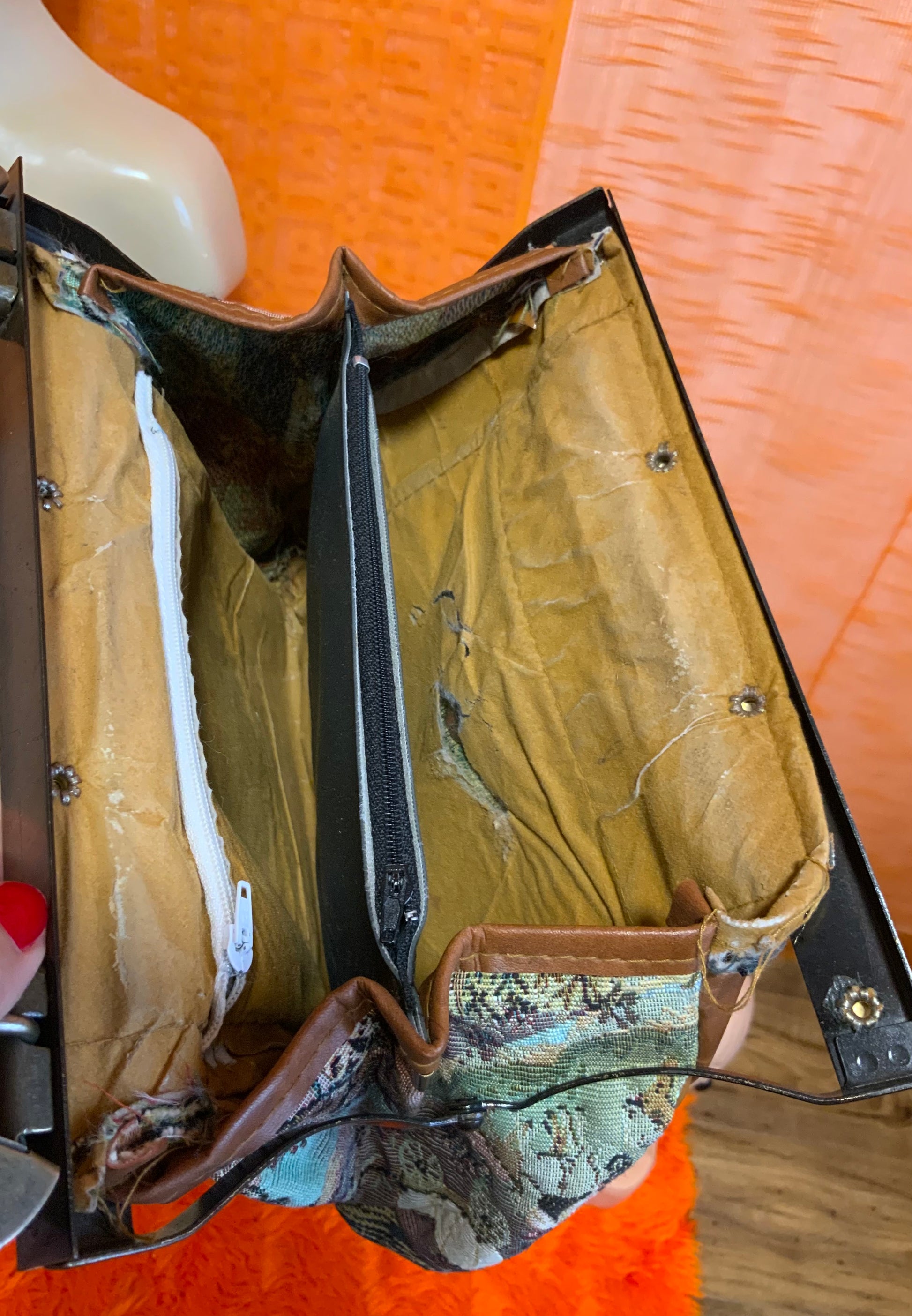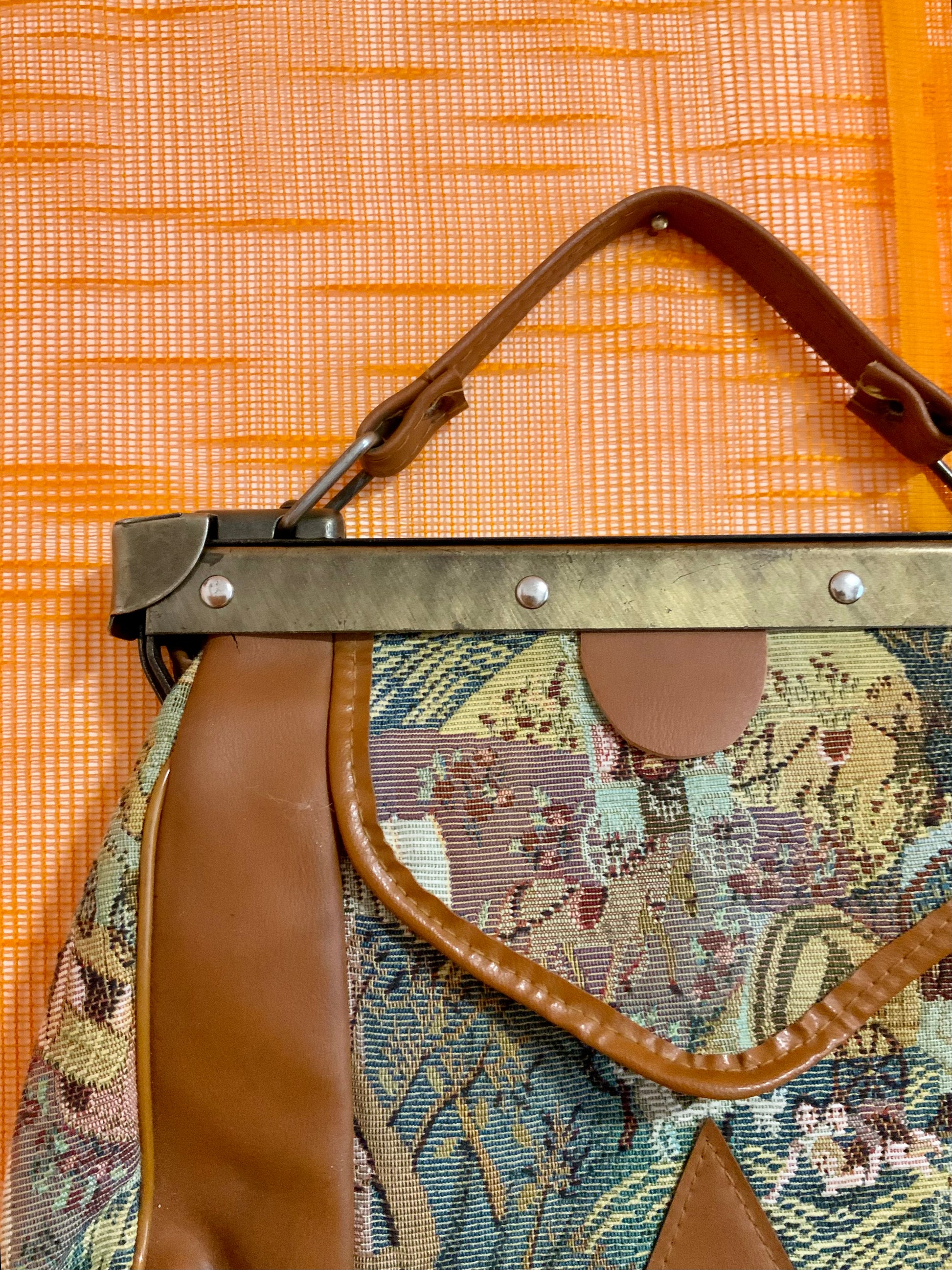 Joli sac à main motif Tapisserie Vintage 1980 - Toile, métal et empiècements cuirs.
