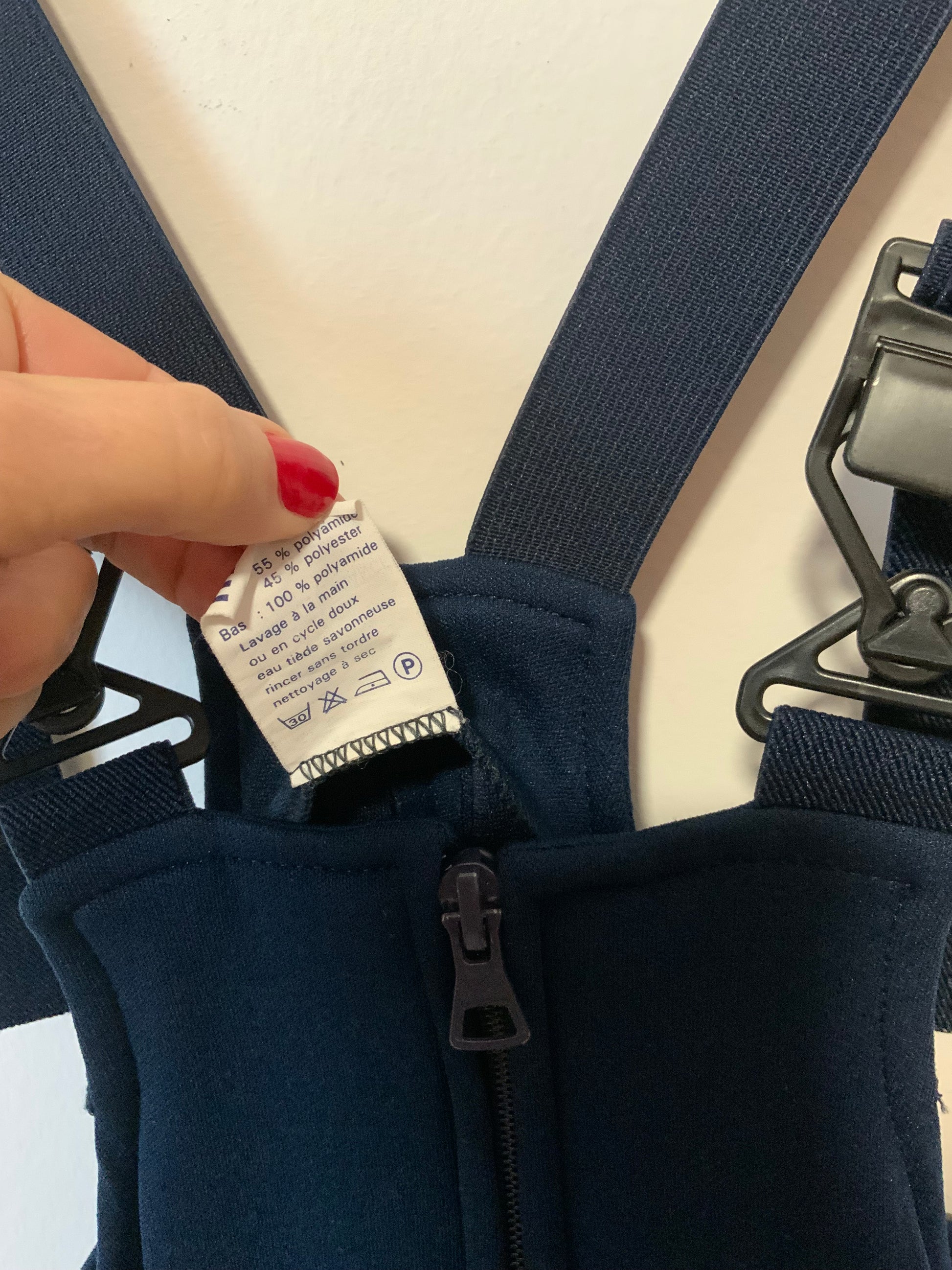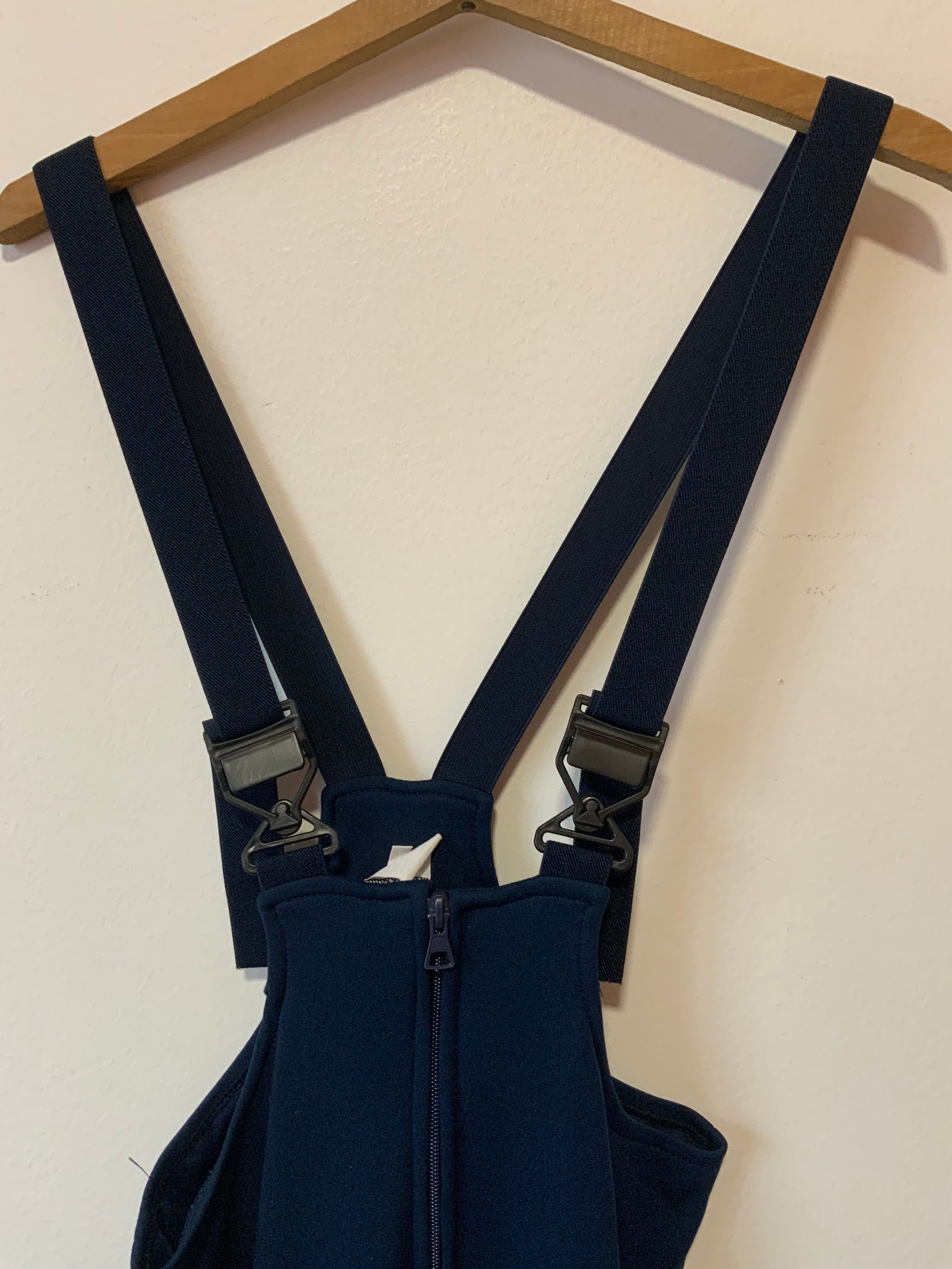 Salopette de ski Fuseau avec renforts Sports d’hiver 1970 à bretelles France Vintage 1970/1980 Marque Montval bleu marine Bon Etat à cause de l etiquette et de la fermeture qui a juste sa petite boucle de cassée en bas sinon très bon état - zippée — Très belle coupe - 100% polyamide.