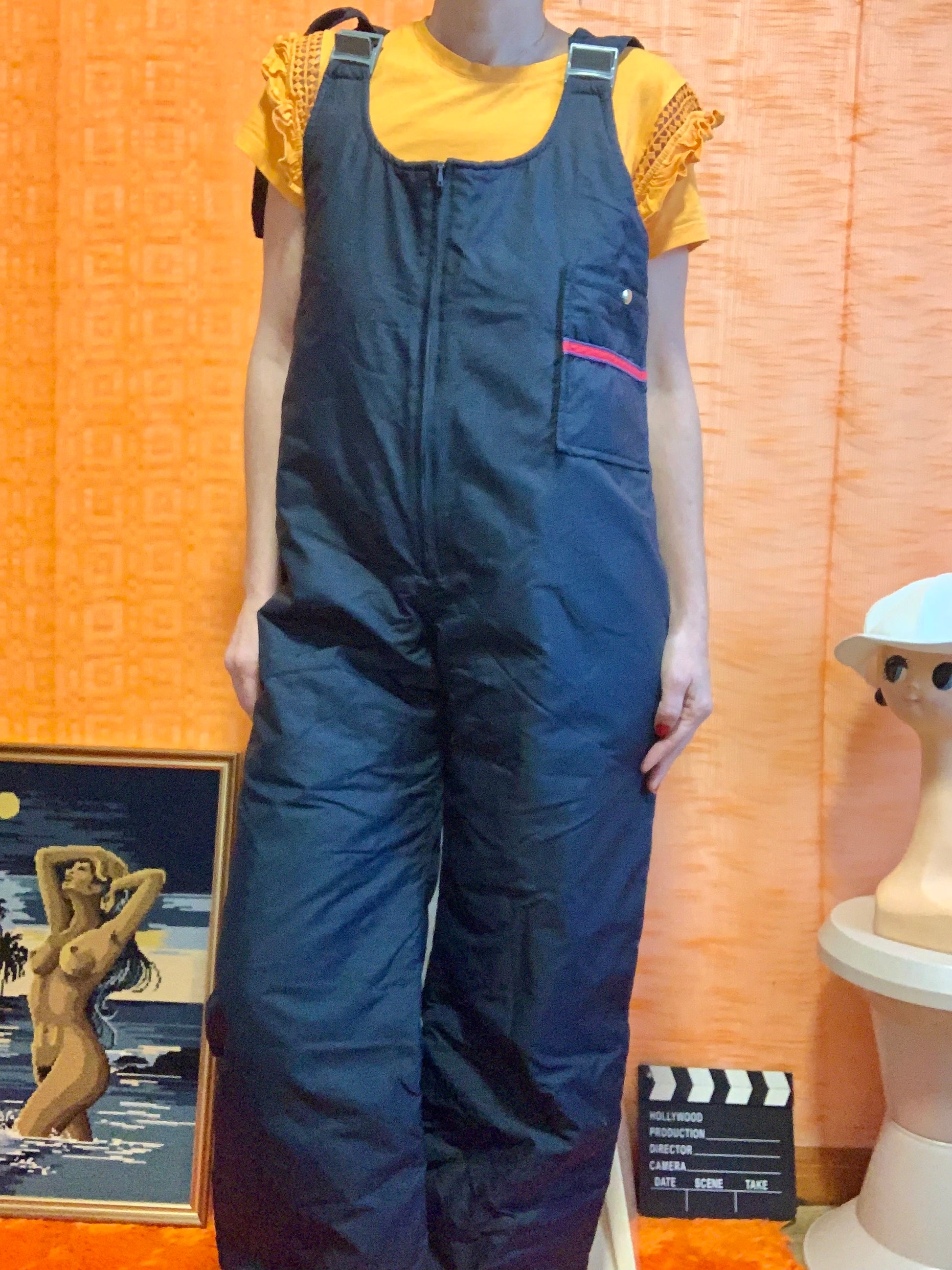Salopette de ski Sports d’hiver 1970 à bretelles France Vintage 1980 Couleur Bleu marine - Très Bon Etat, poche rouge et zippée devant Fabriquée en France, Modèle Fabrice 100% polyamide.