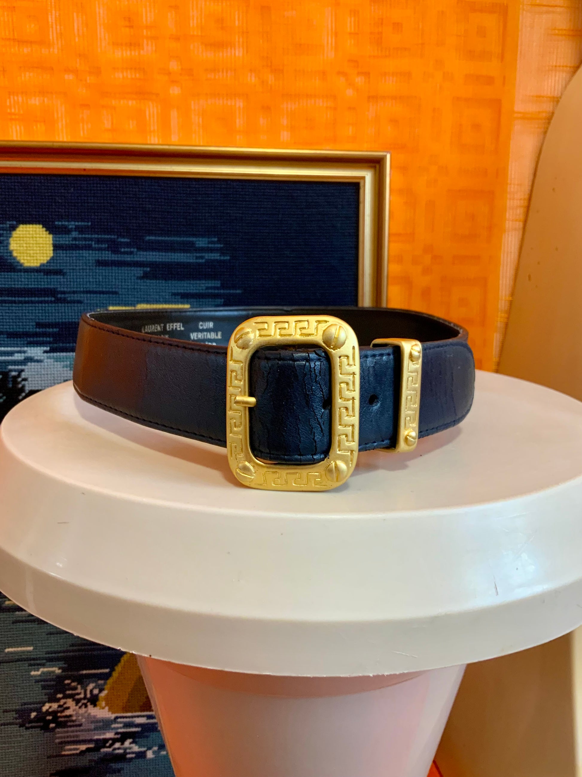 Ceinture cuir bleu marine boucles métal dorées Made in France Vintage Laurent Effel, Stock de magasin-