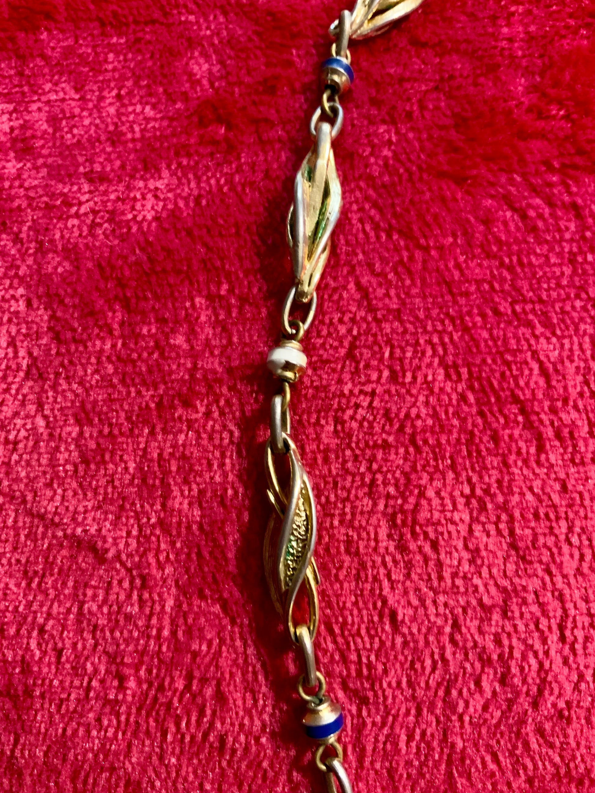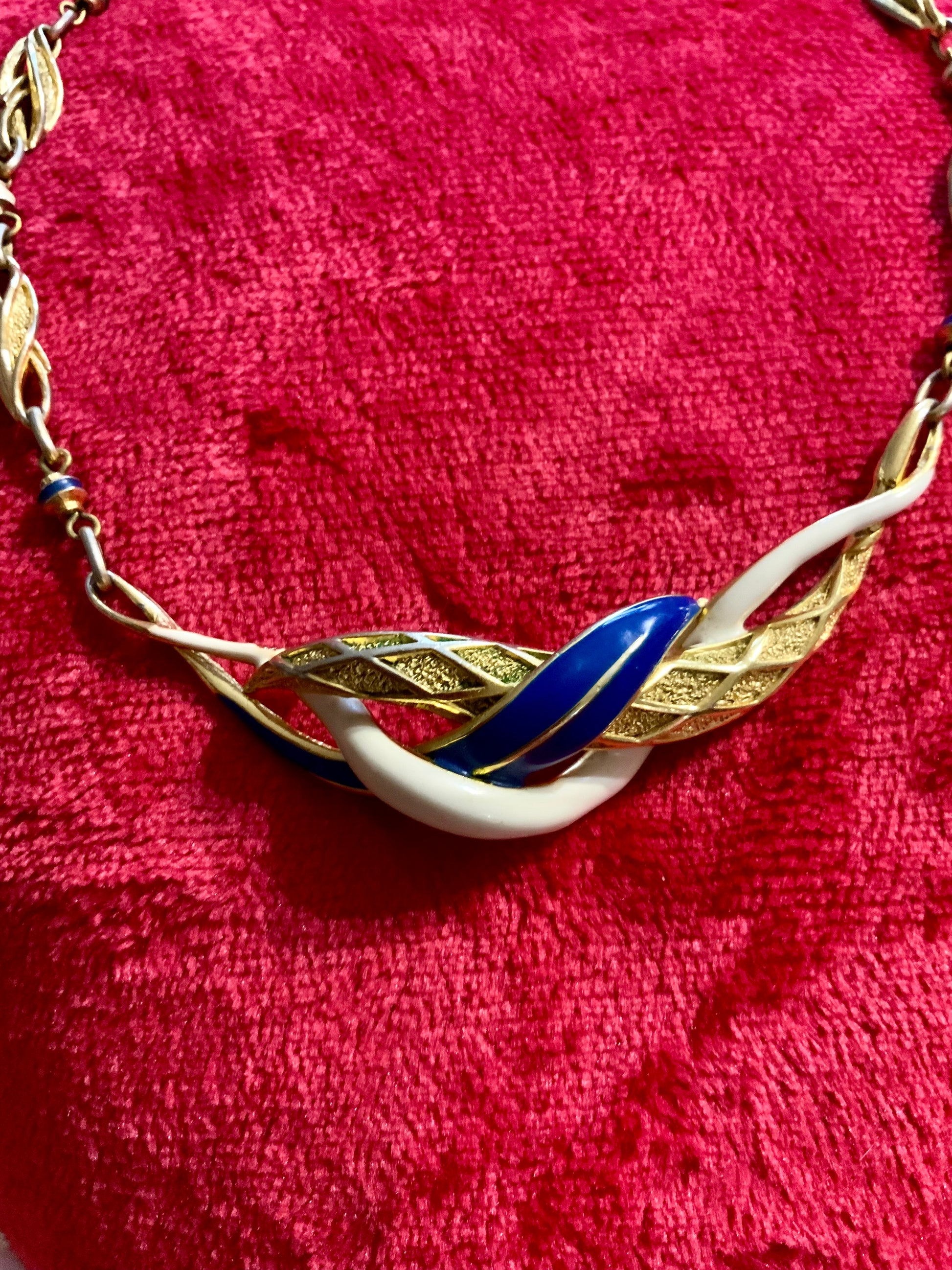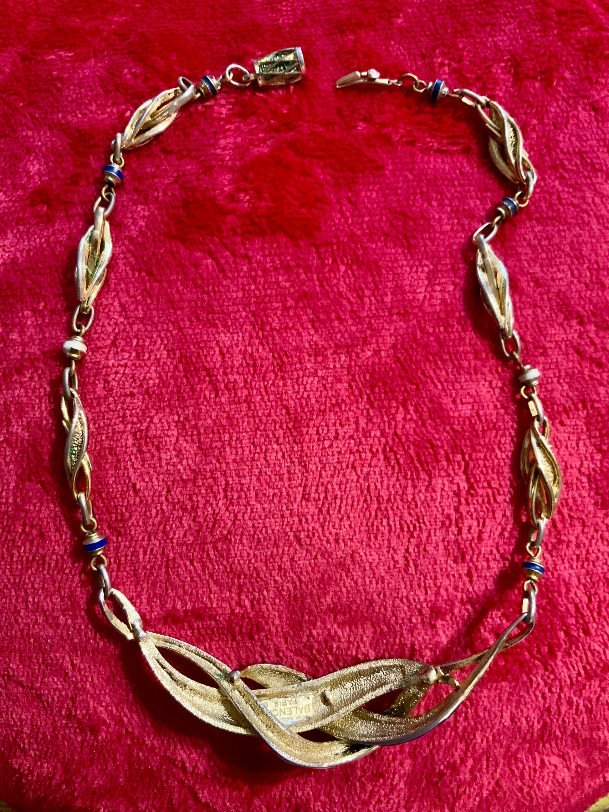 Magnifique Collier très Chic de la maison Balenciaga - Très bon état en métal doré Plaqué or et métal peint blanc et bleu - Et mailles fantaisies - Vintage 1980-90’ avec très beau fermoir - Signature au dos - Il est sublime malgré une très très légère usure de sa couleur qui ne se voit que de très près.