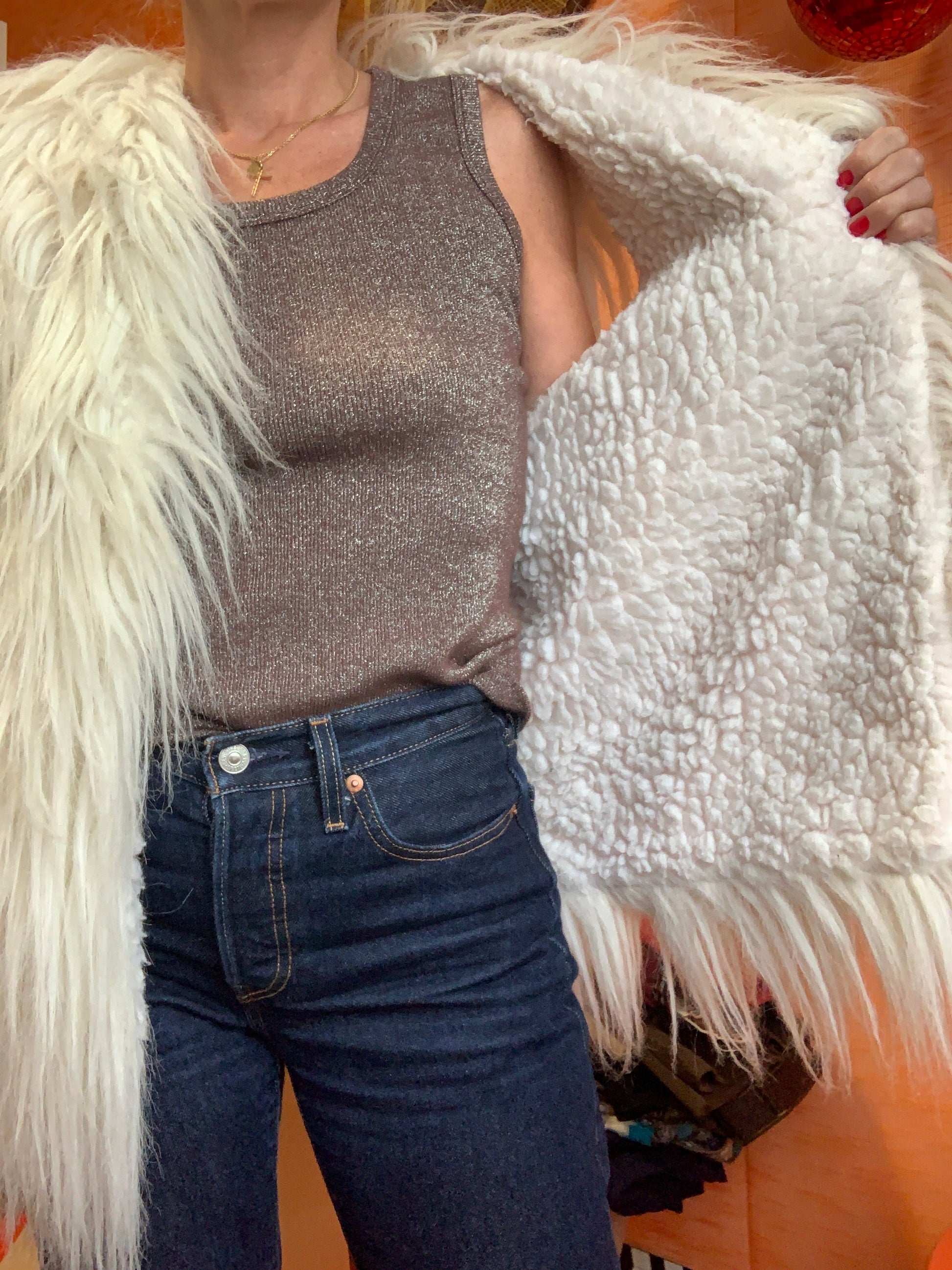 Sublime gilet sans manche à longue fourrure synthétique Vintage 1970/80 France
