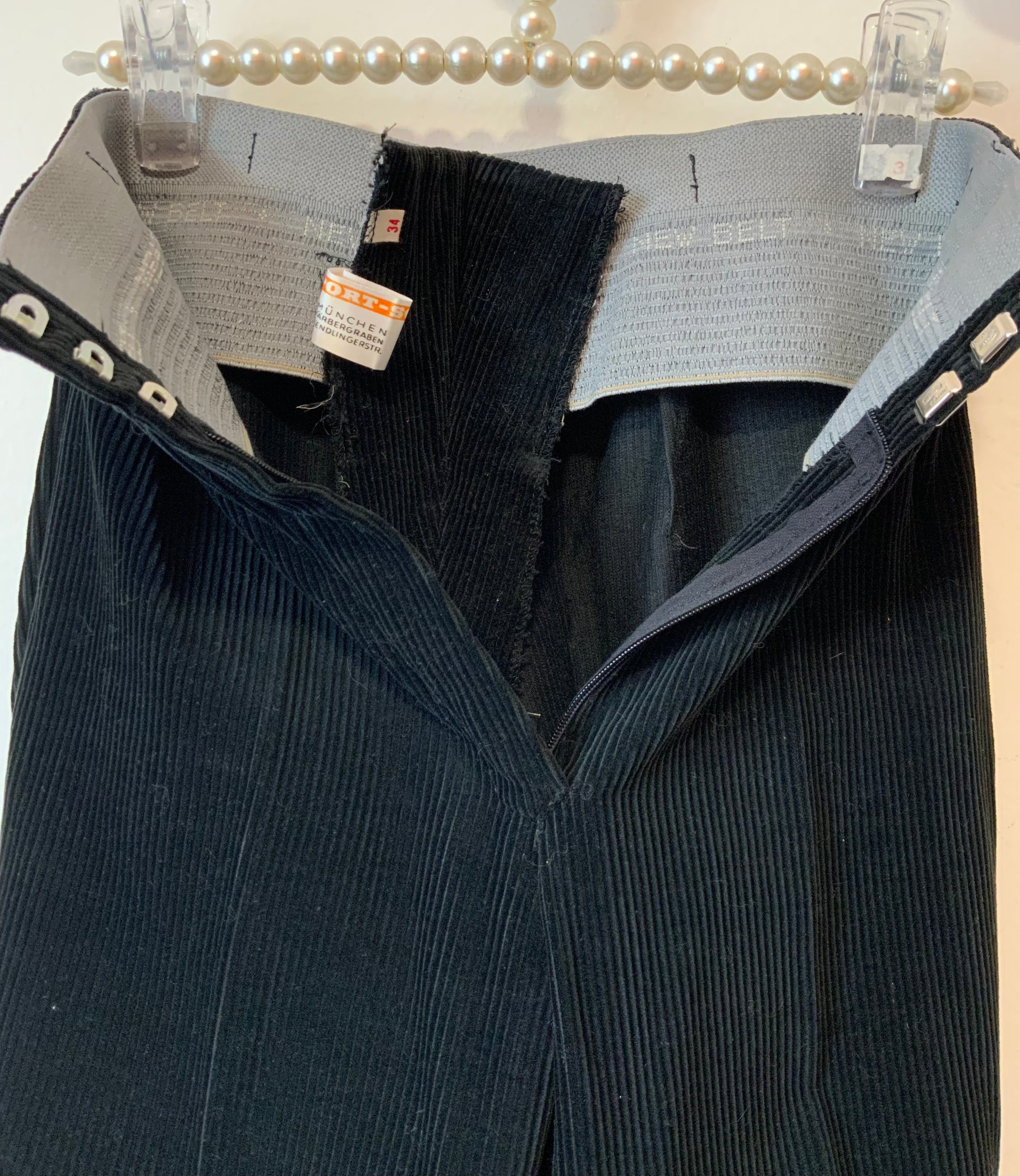 Rare et très beau pantalon pattes d’éléphant sport Allemagne Vintage de couleur Noir en velours côtelé très épais et pièces de cuir aux bas de jambes - avec empiècement pour pieds Fuseau et un tissu élastique protégeant tout comme un pantalon de ski -