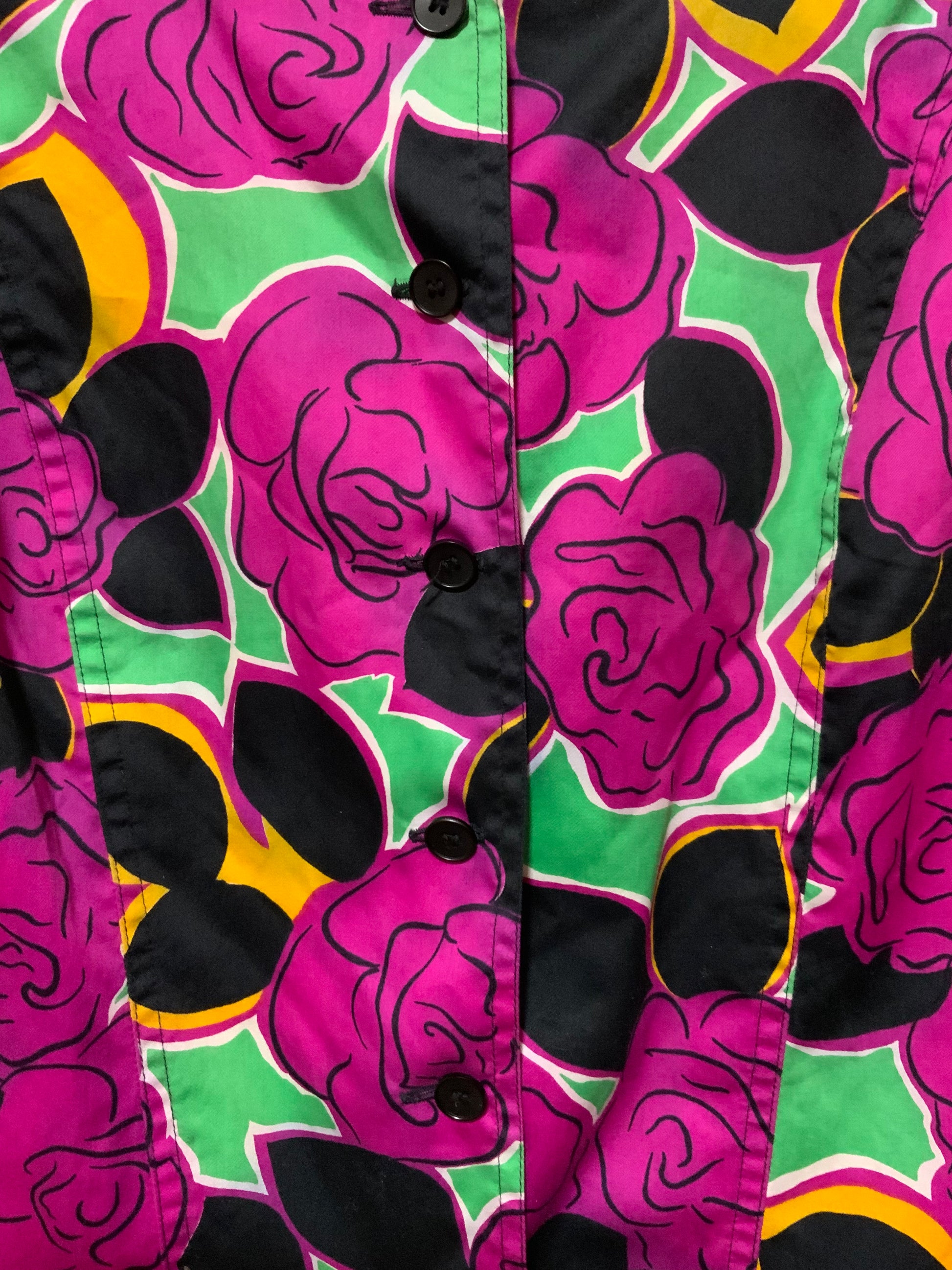 Excellent état - 100% Coton fleuri Fuchsia vert noir moutarde et vert + 1 bouton de rechange cousu dans son intérieur.