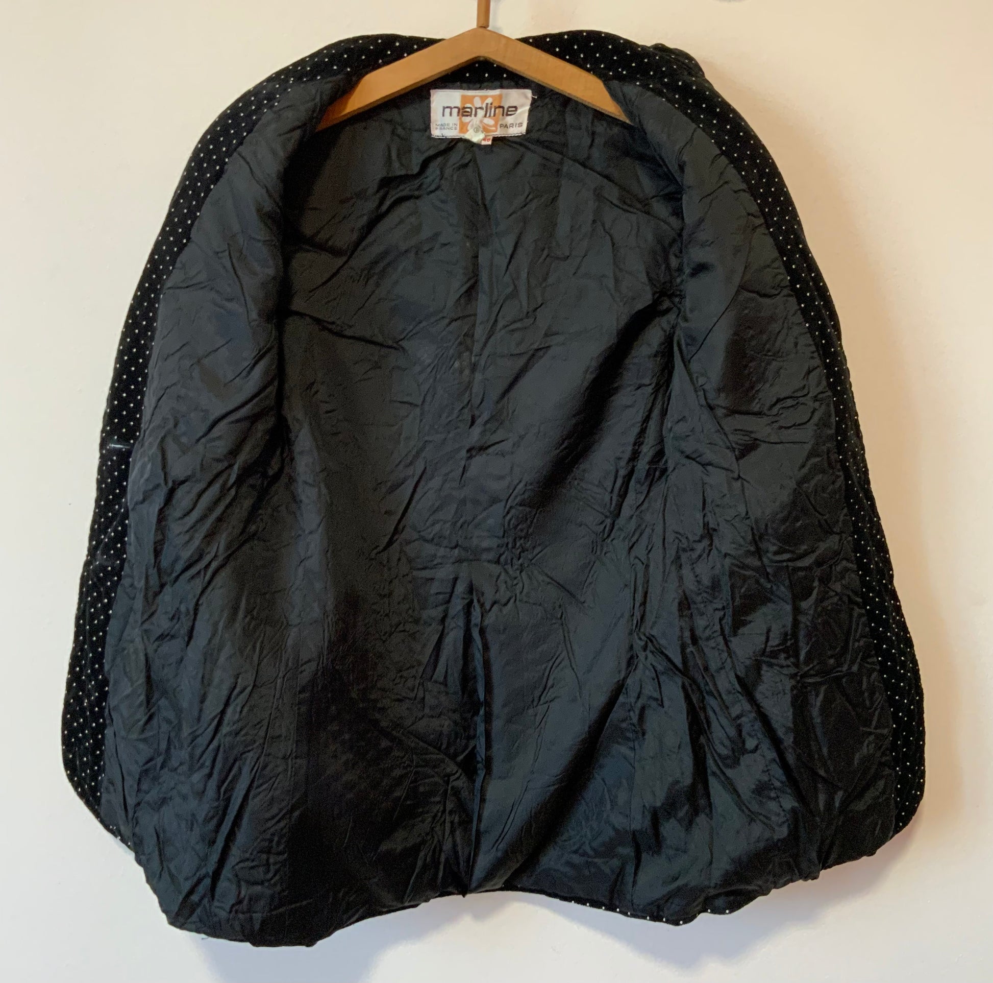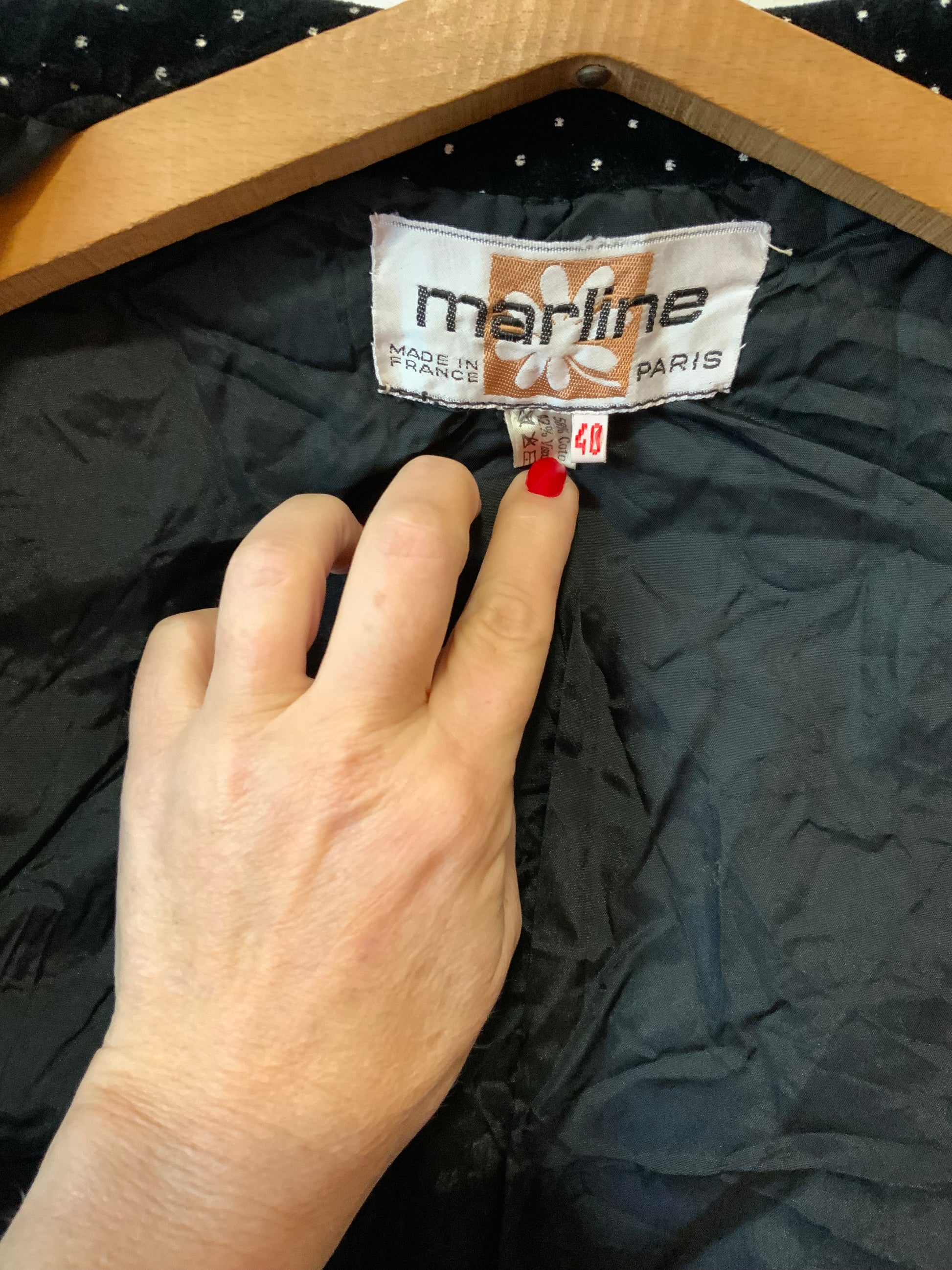 Tres belle veste en velours petit pois Vintage fin 1970 de la marque Marline Made in France Paris - petits pois blancs sur fond velours noir, Entièrement doublée - 58% Coton 42% Viscose- Superbe qualité + Épaulettes sous doublure.