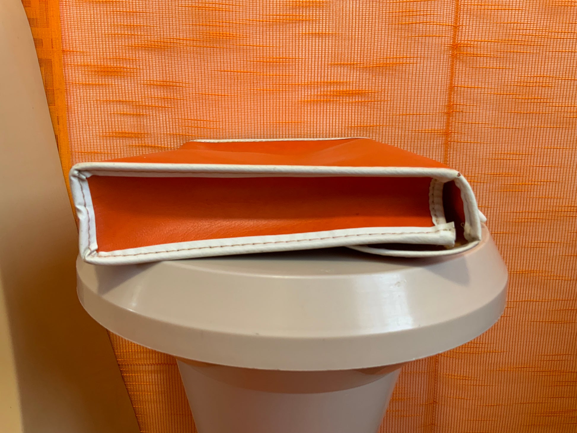 Superbe petit cartable sac à main sacoche Orange Un pur vintage Seventies Cuir orange et blanc poignée plastique blanc Intérieur nickel avec le nom de son petit propriétaire de l'époque.