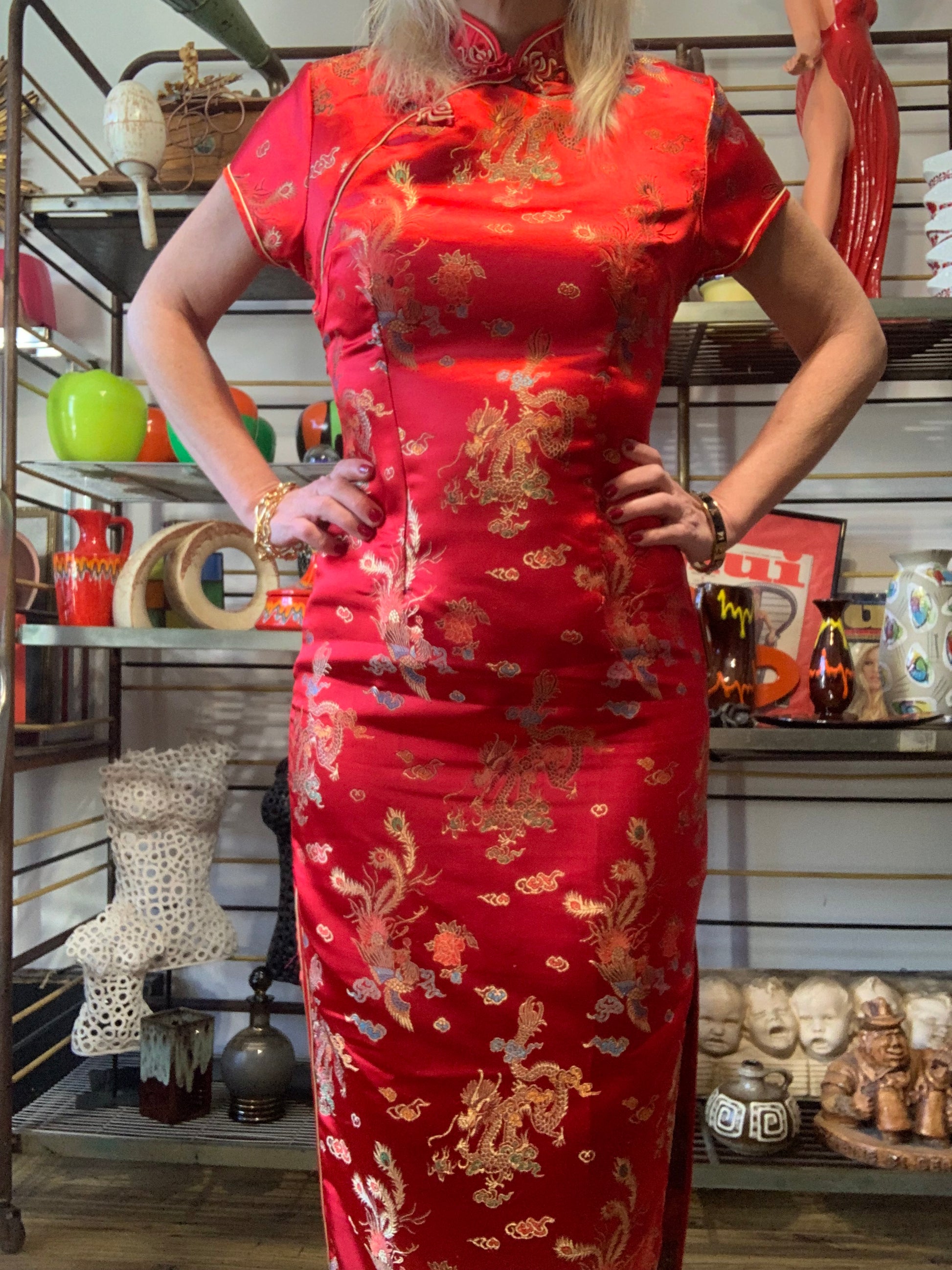 Très belle robe longue Vintage Chinoise 100% Soie Rouge avec motifs brodés dragon - État excellent, fendue de chaque côté avec interieur sublime egalement.