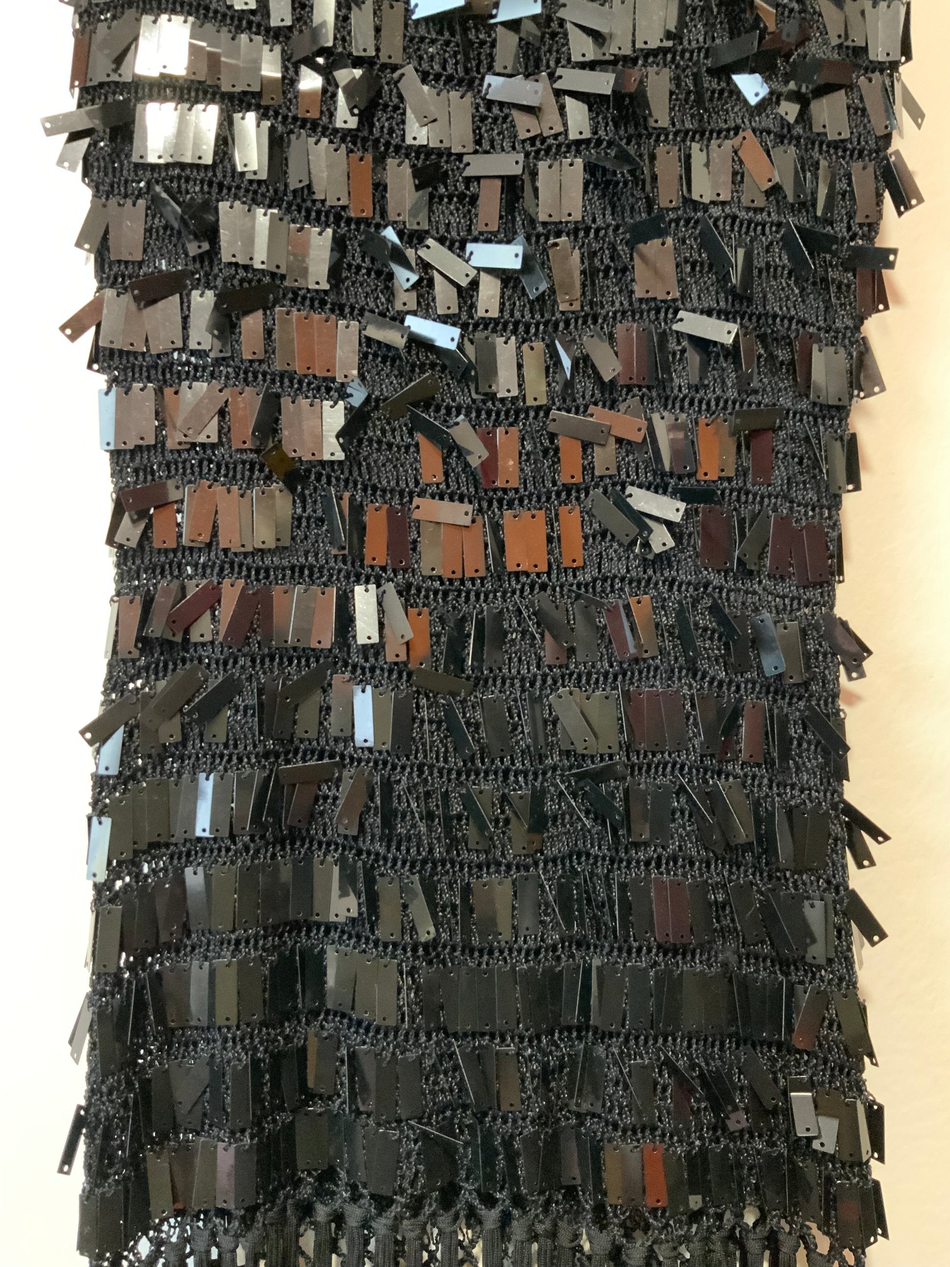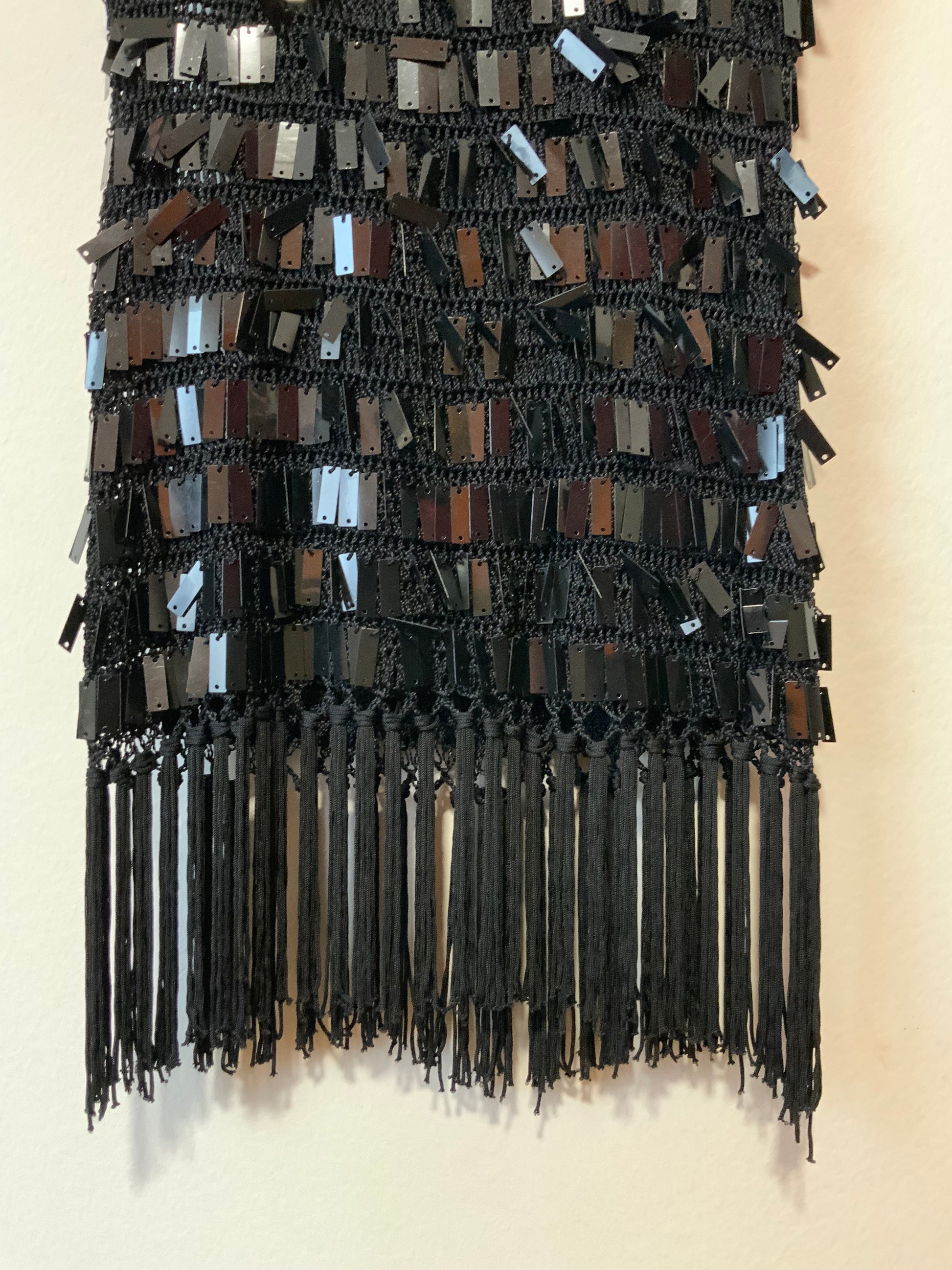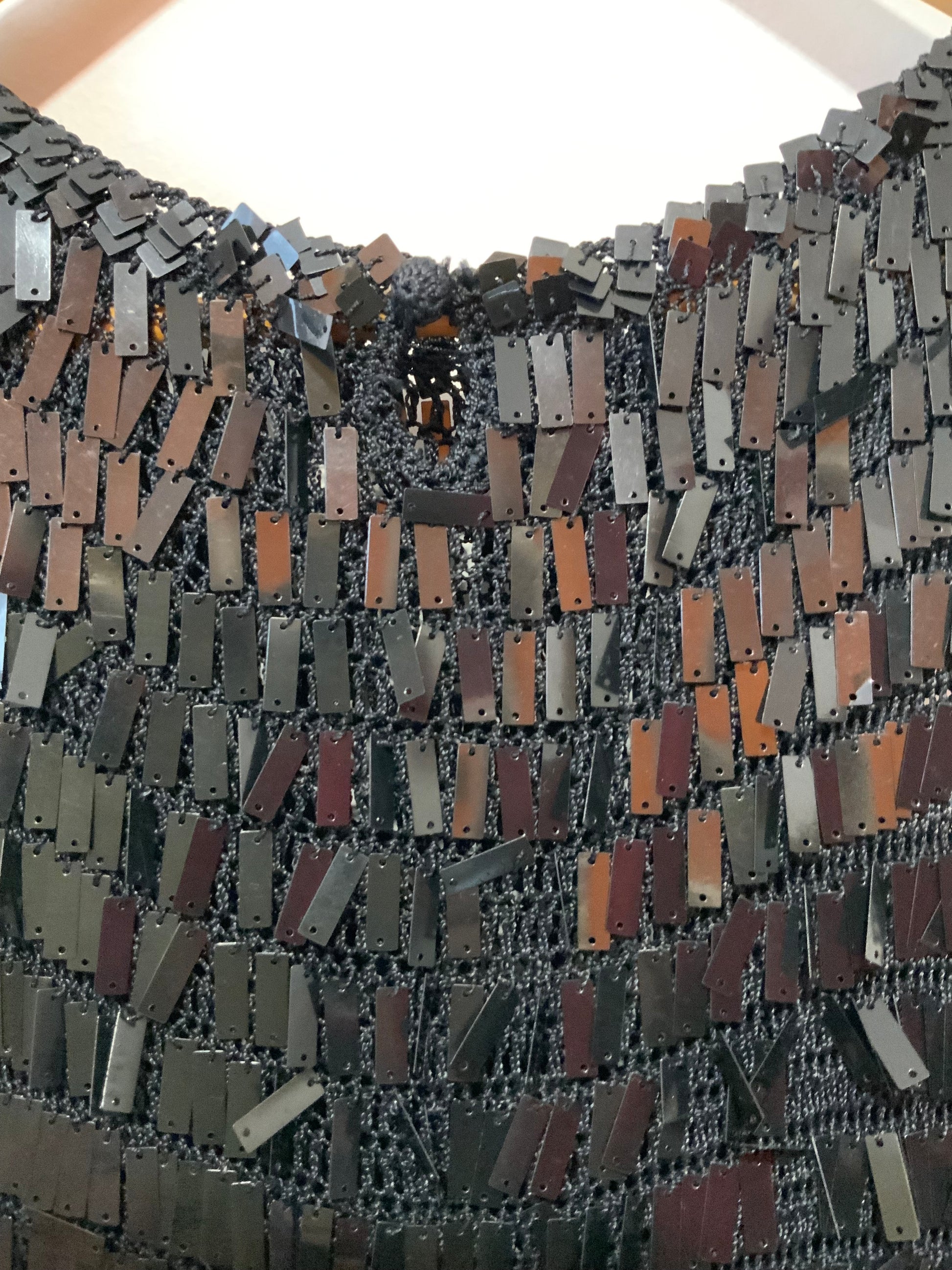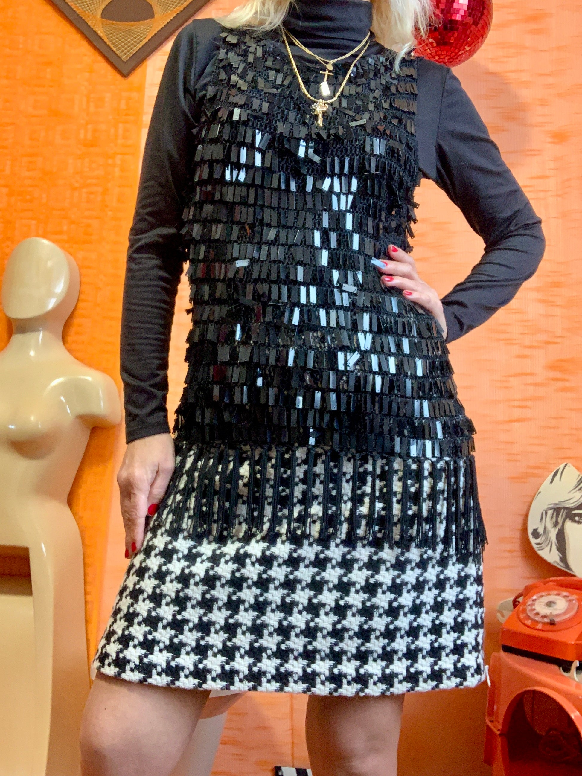 Vintage 1990 Ravissant top à franges fait en crochets avec strass - Noir en excellent état - Peut aussi être porté en mini Robe selon ses goûts et sa taille.