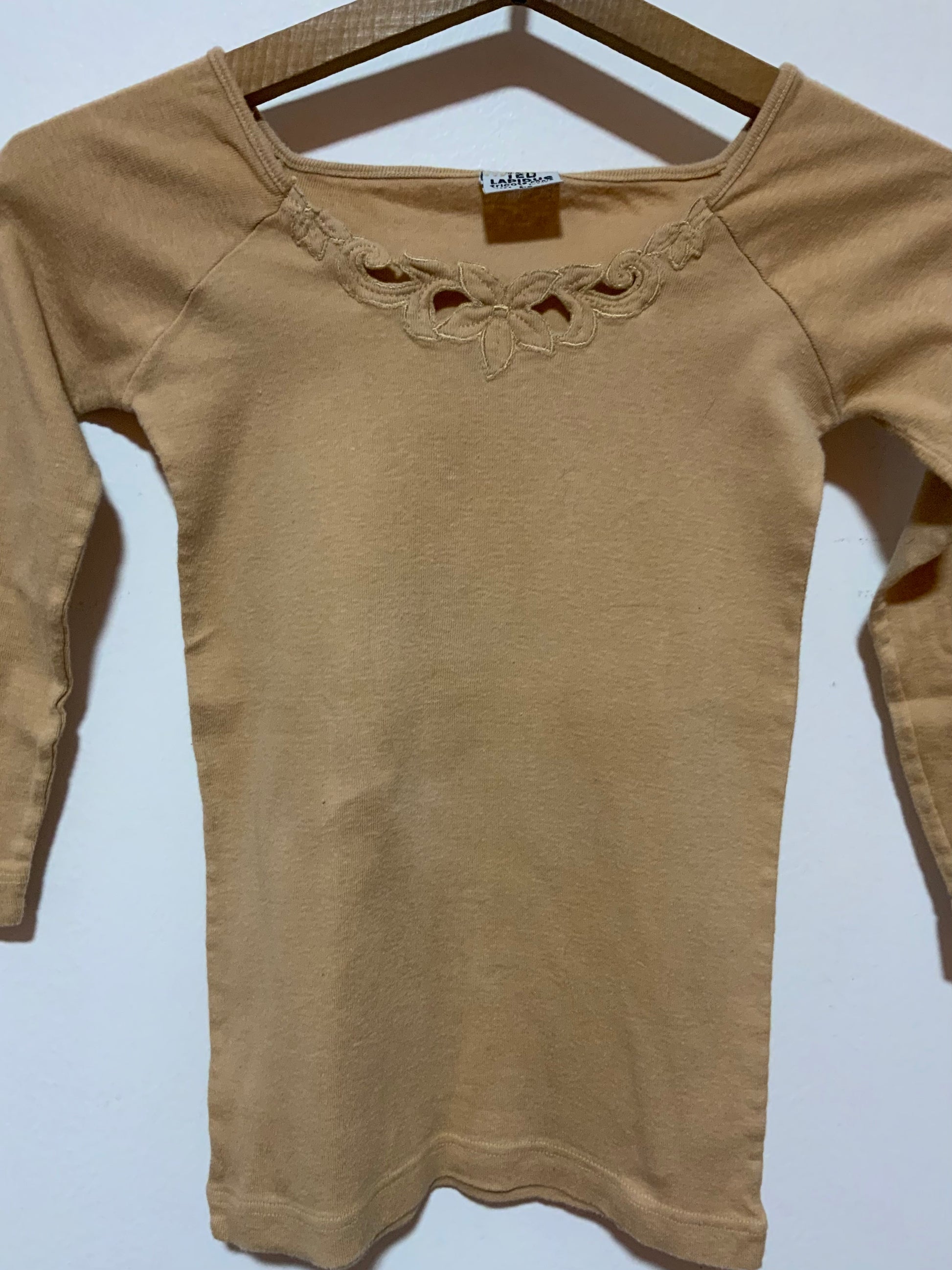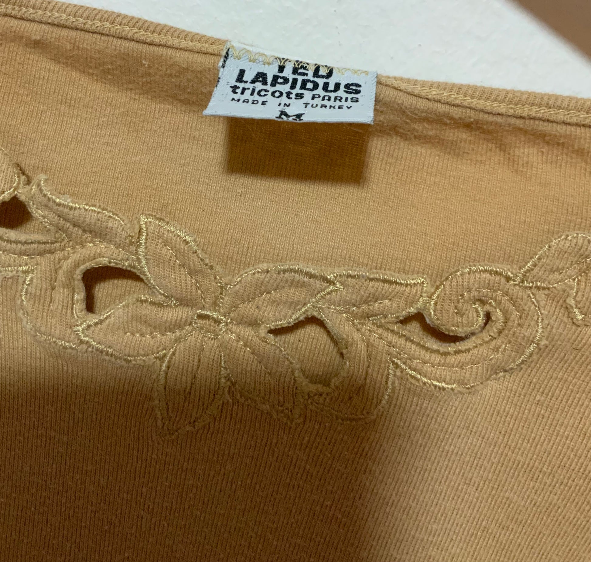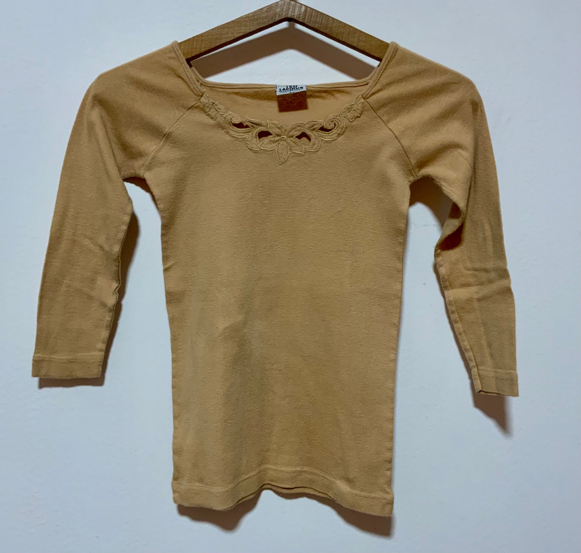 Top Vintage Ted Lapidus Paris Tricots 1980 - Beige à motifs fleurs sur le haut.