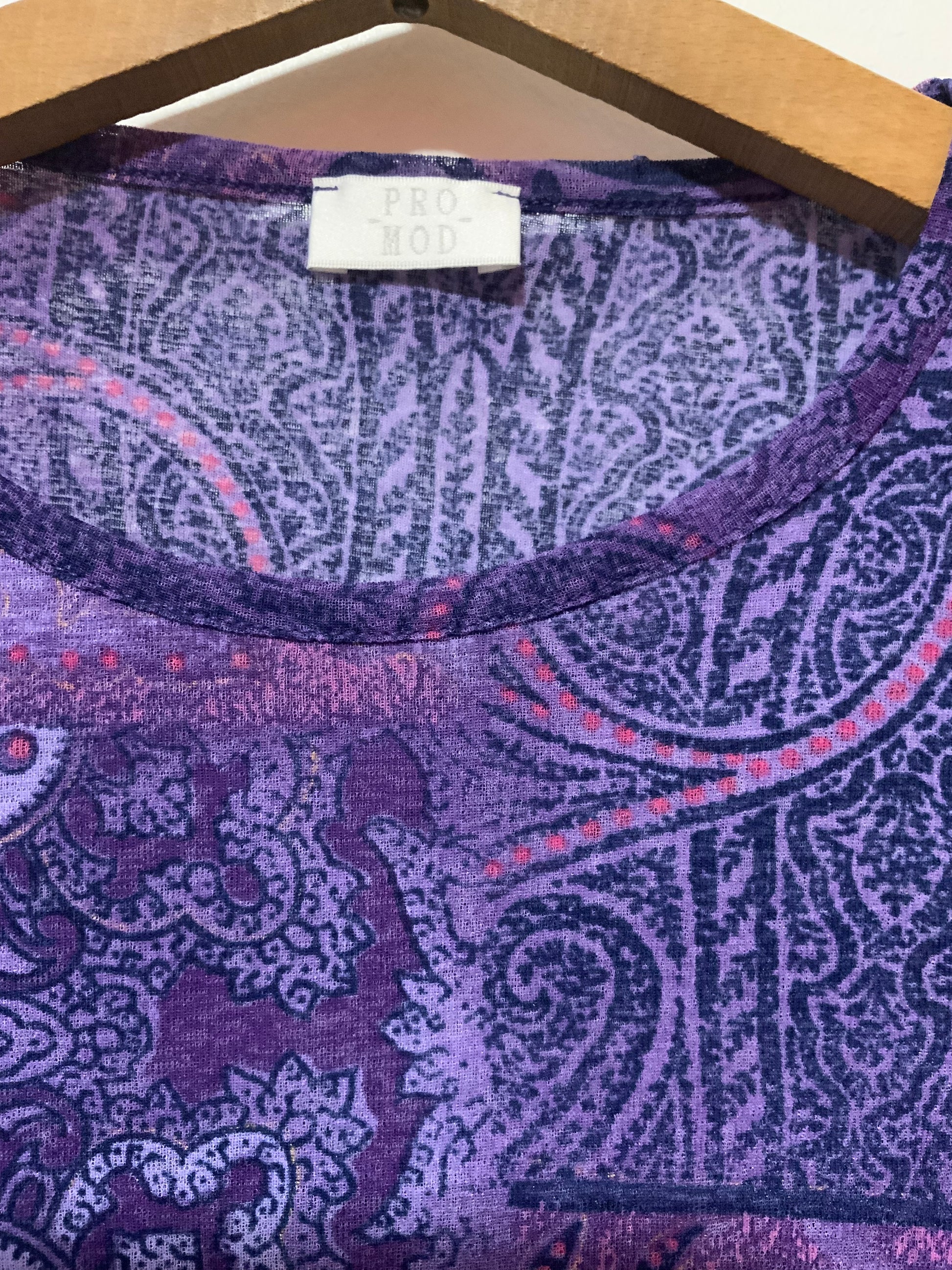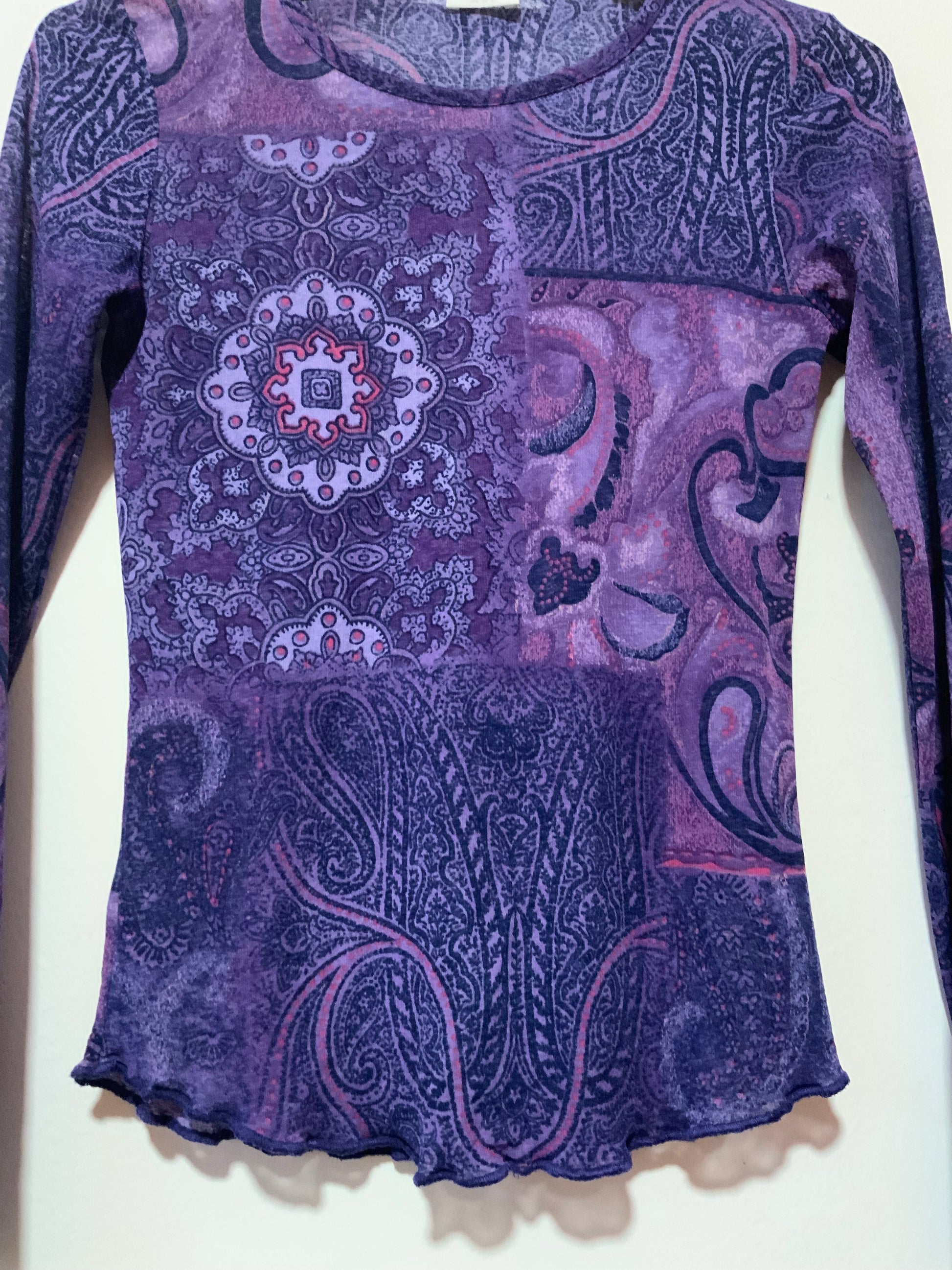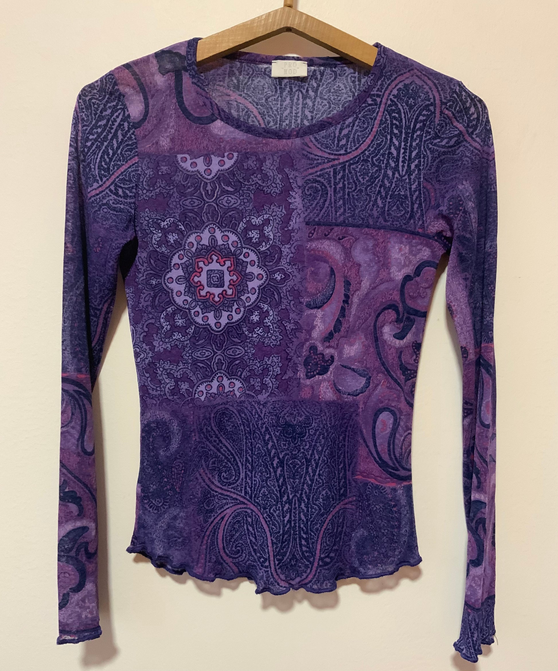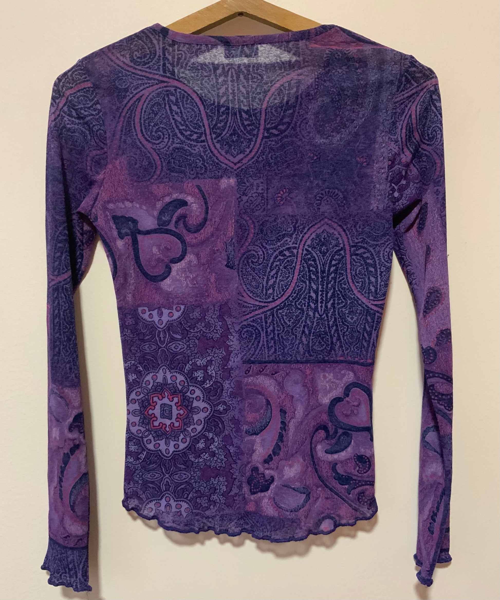 Top Voile a motifs violets Rose Vintage ProMod 1990- Très légère transparence, volanté sur la bas.