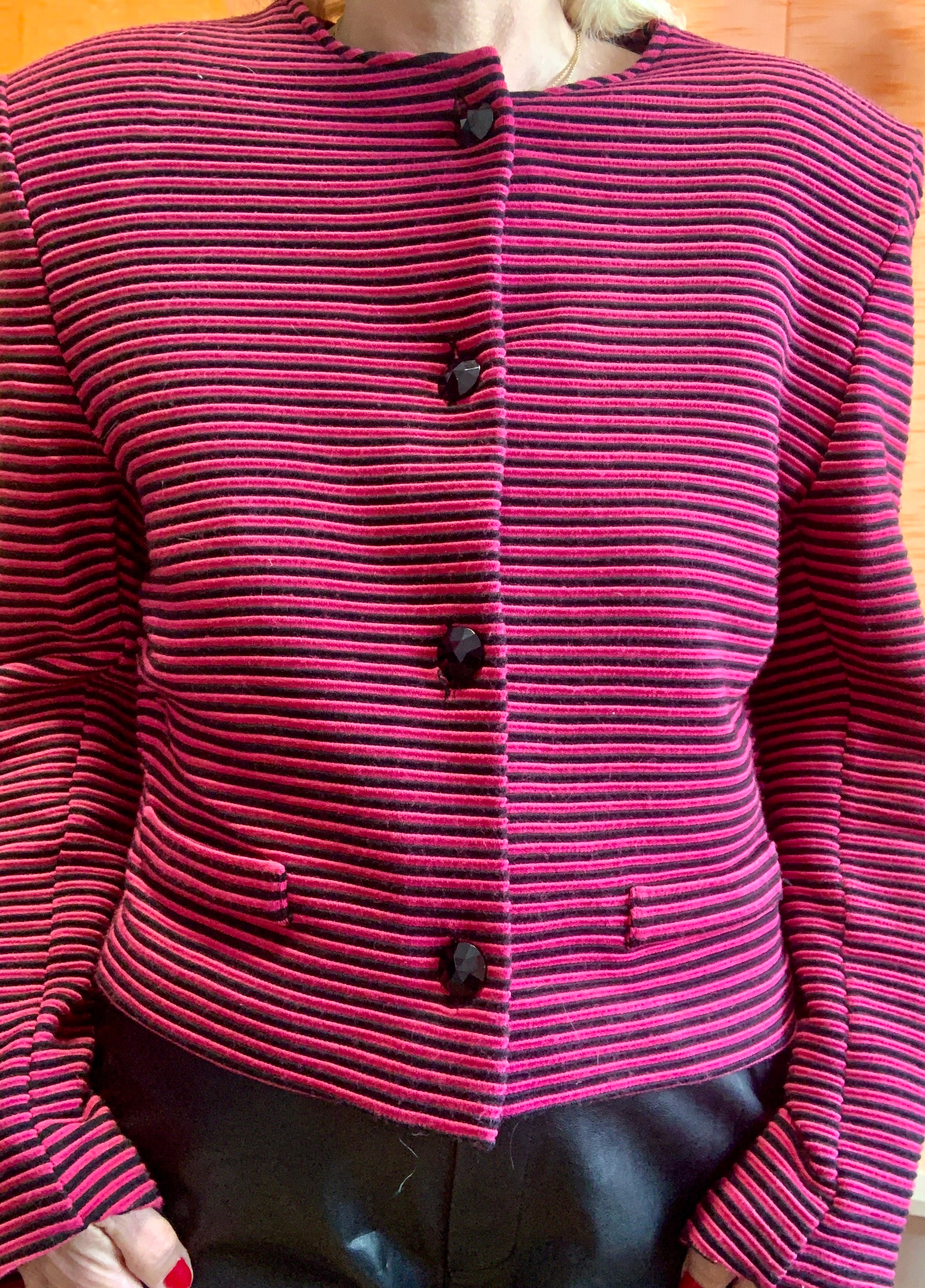 Très beau gilet sweat à rayures et larges épaulettes Vintage 1980 rose fuchsia et noir avec boutons formes diamants noirs brillants.