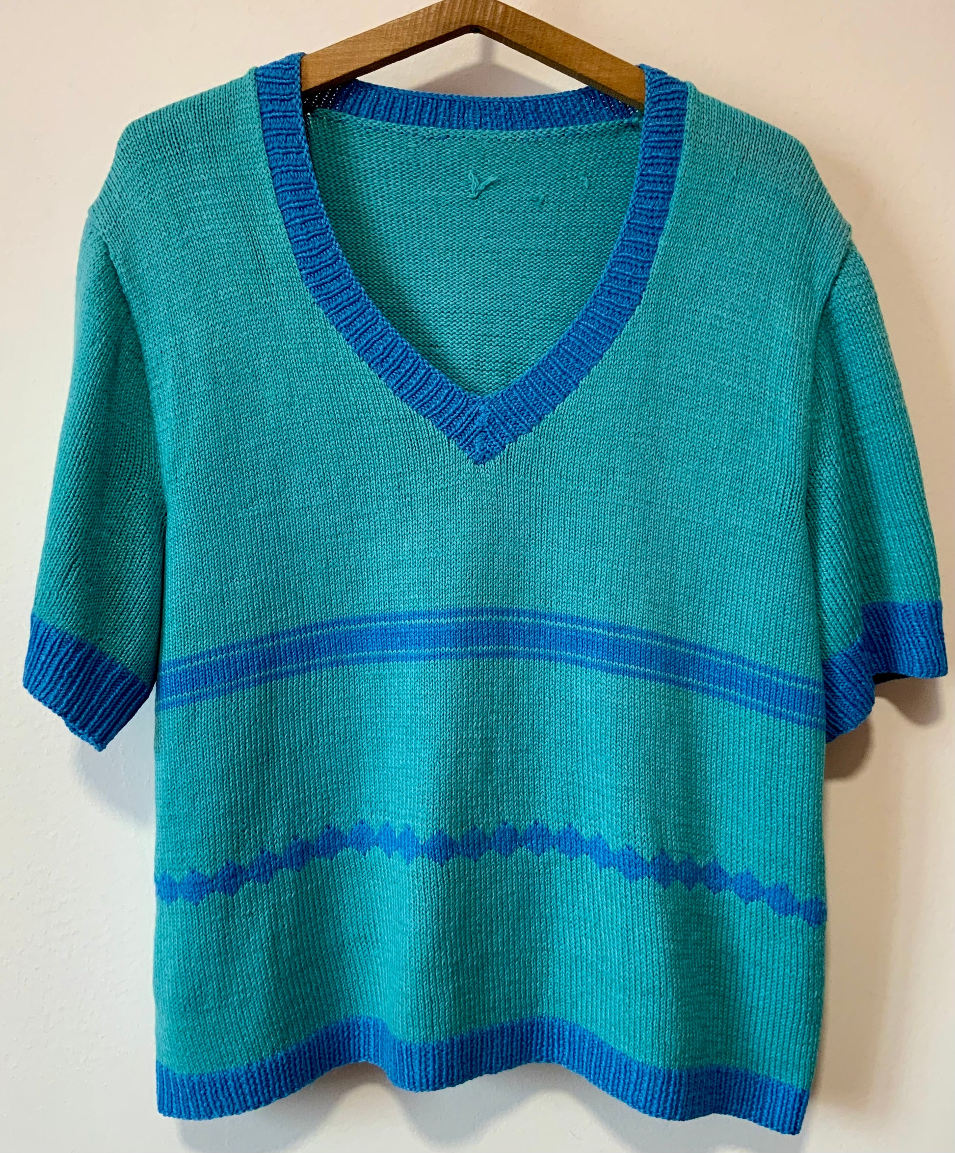 Tricot confection main Laine acrylique Bleu Vert à rayures et détails - Très bon état.