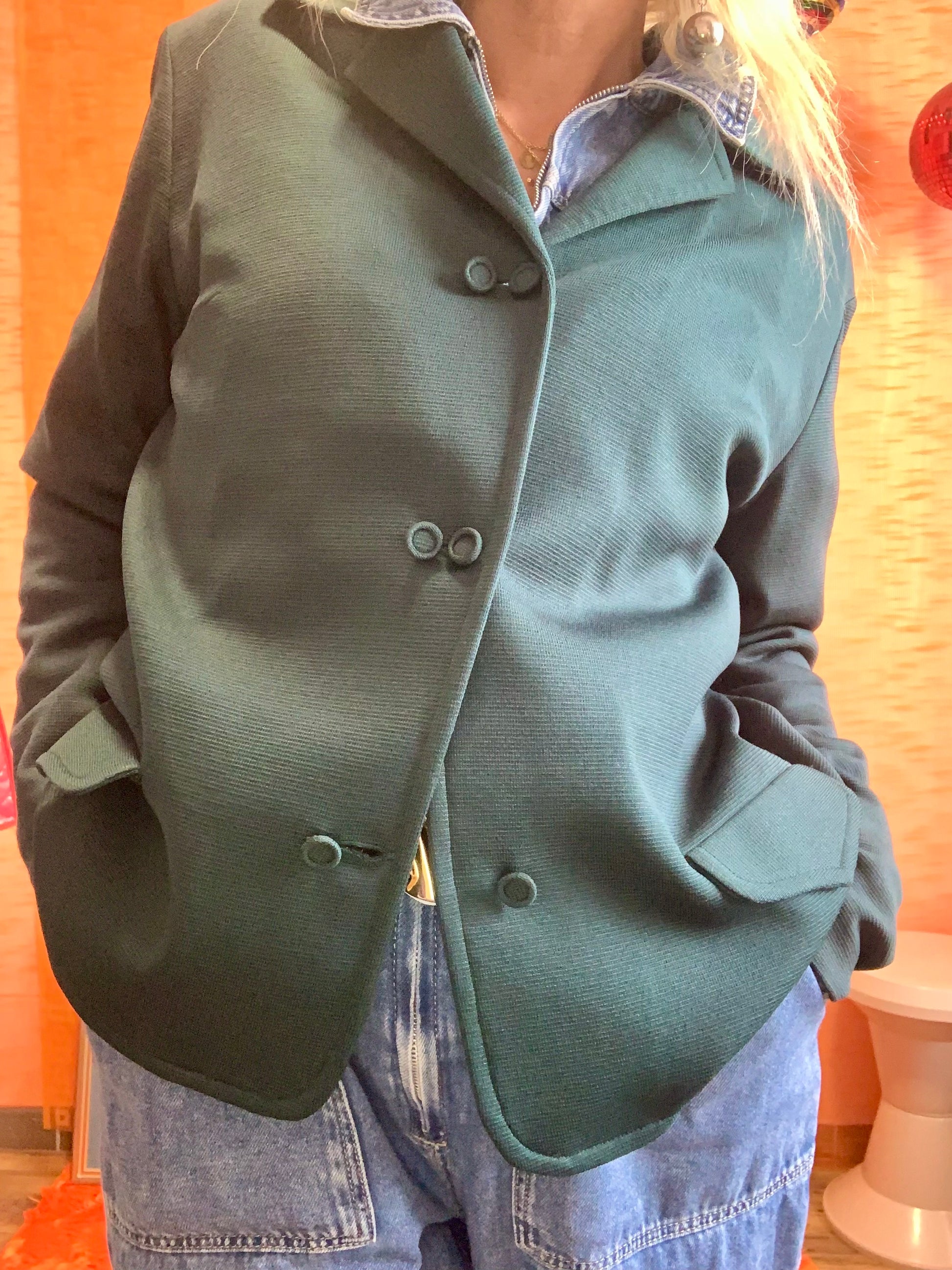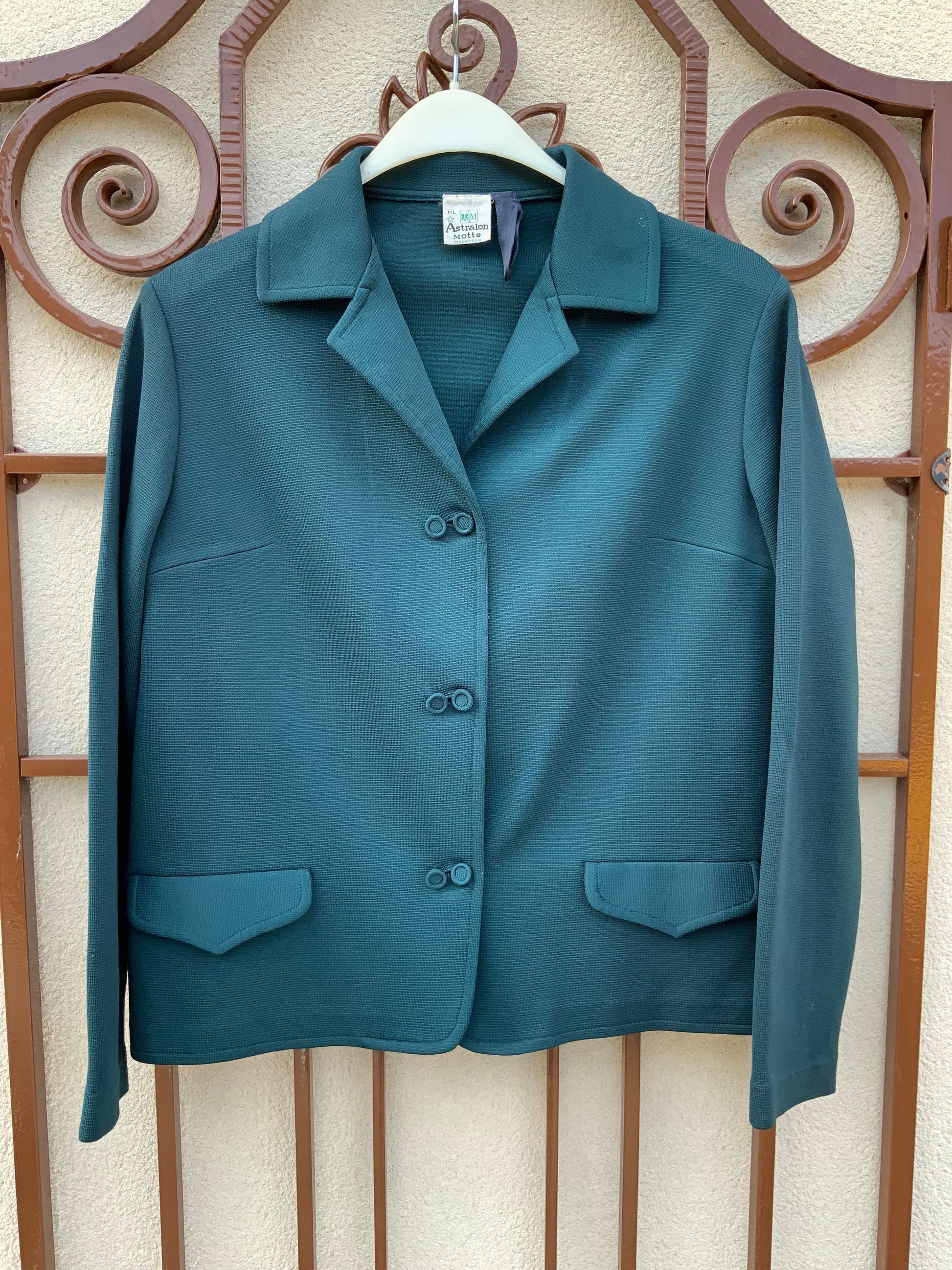 Veste courte Forme Cardigan en Astralon Vintage 1970 Chic, une ressemblance avec les vestes asiatiques lié a l effet double boutonnage, effet poche.