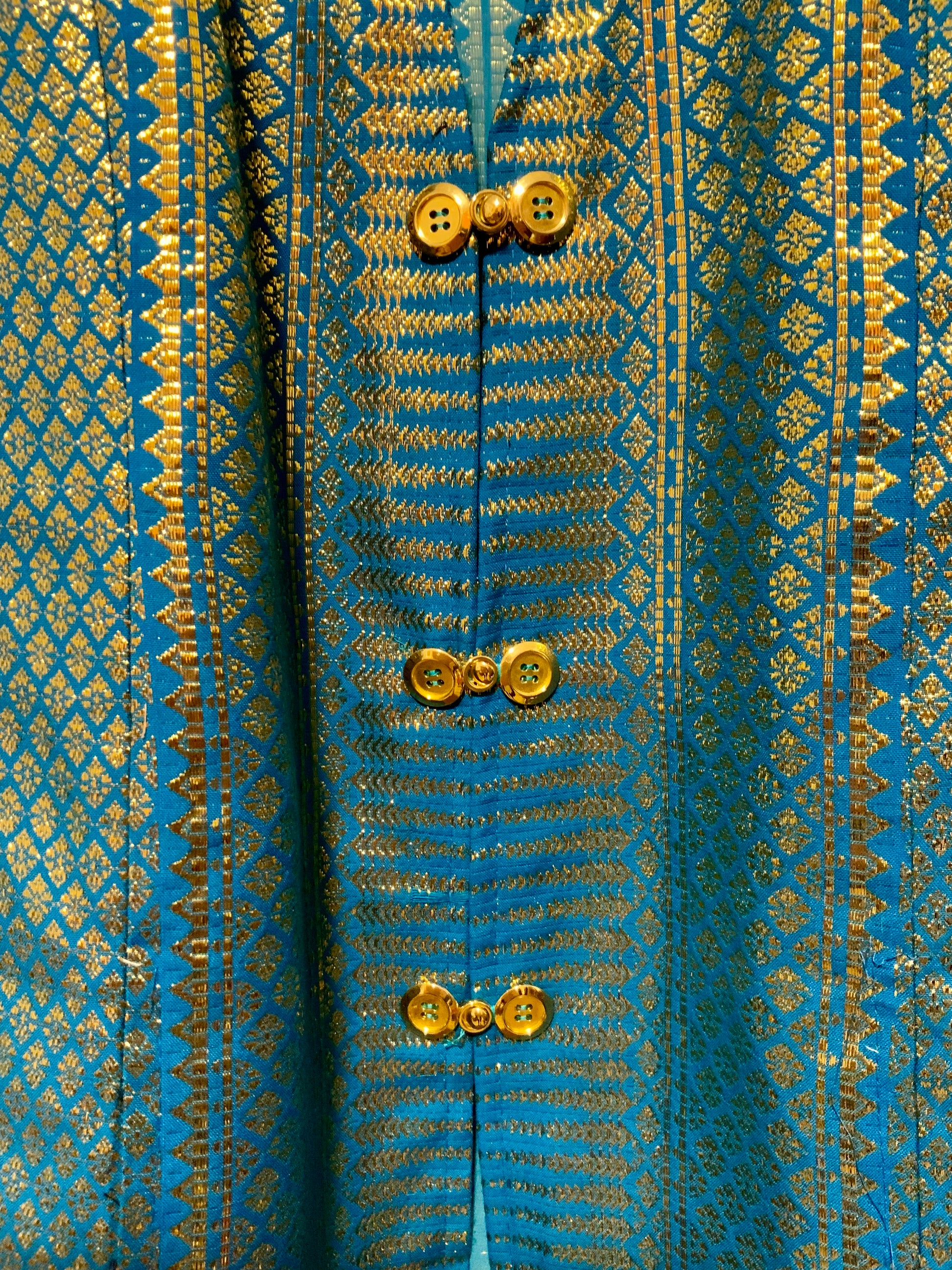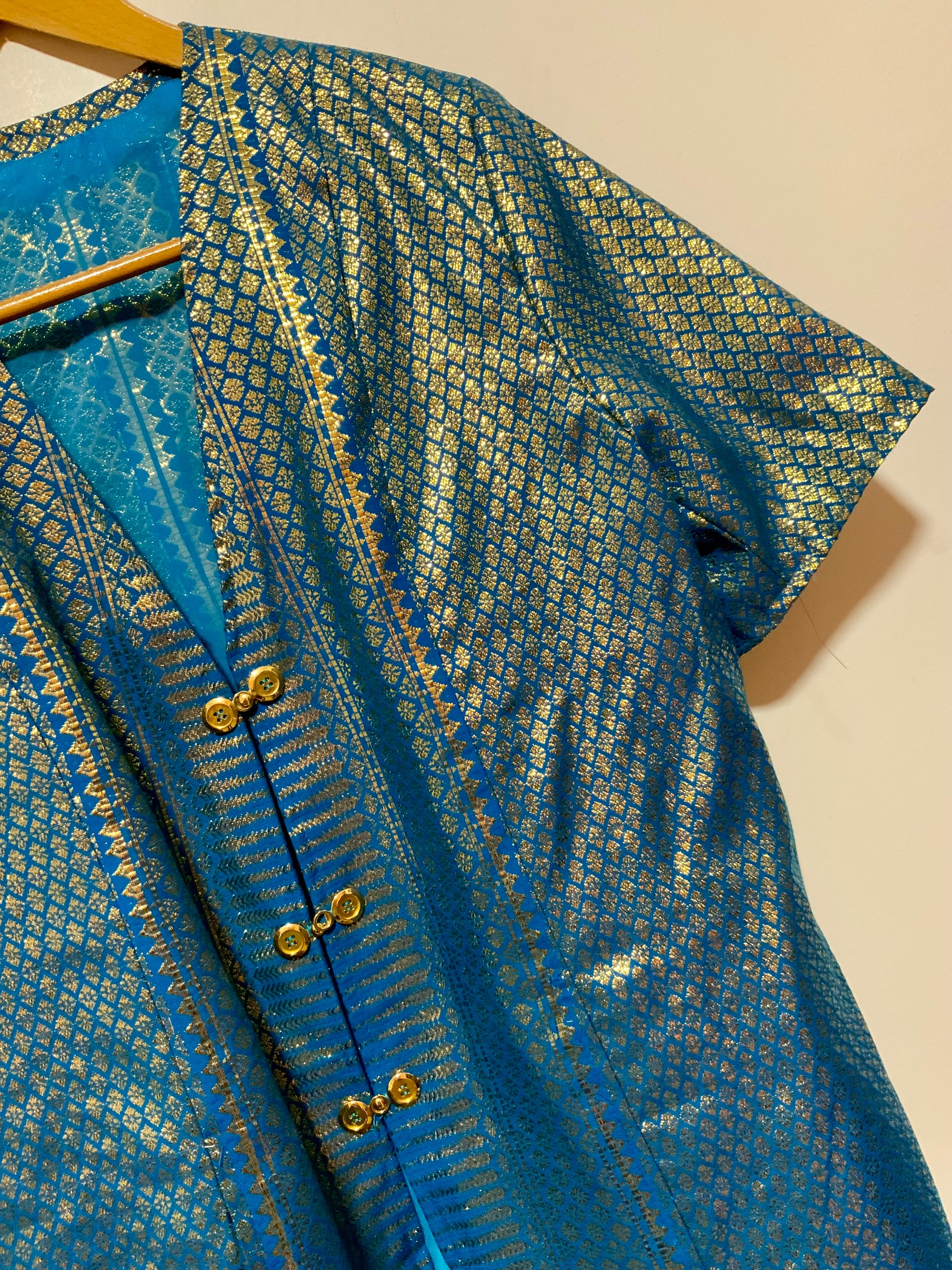 Veste de fêtes Confection Main 1980/90 Bleu et paillettes dorées - Entièrement doublée voile bleu, en état excellent- Boutons merveilleux et originaux en métal doré -