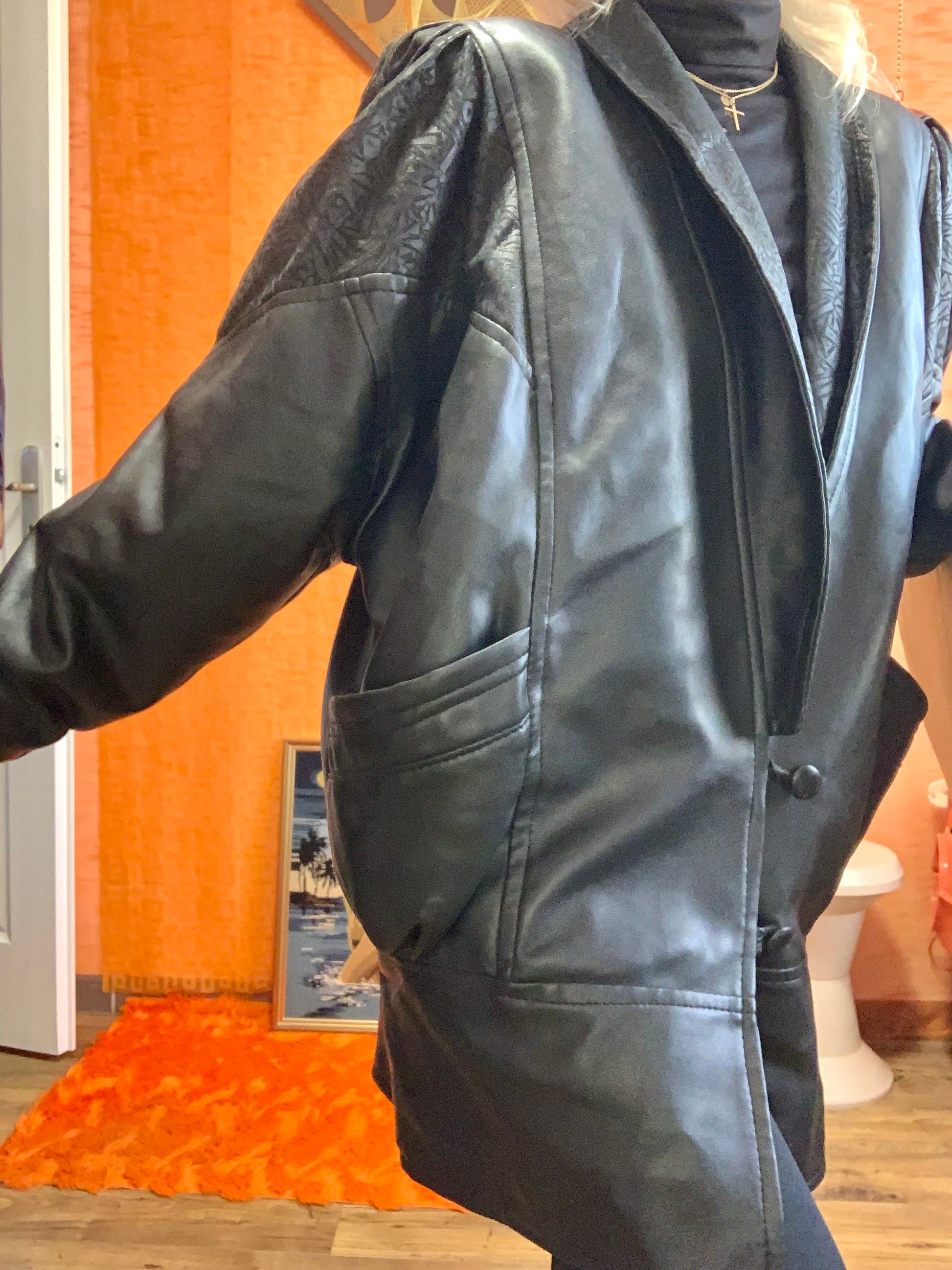 Tres belle veste en Cuir noir forme large 3/4- Vintage 1980- Epaules à volume pincé, Grandes poches et Fantaisies sur épaules et col - Entièrement doublée matelassée - Larges épaulettes - Très bon état Cuir souple noir de très très légères griffes.