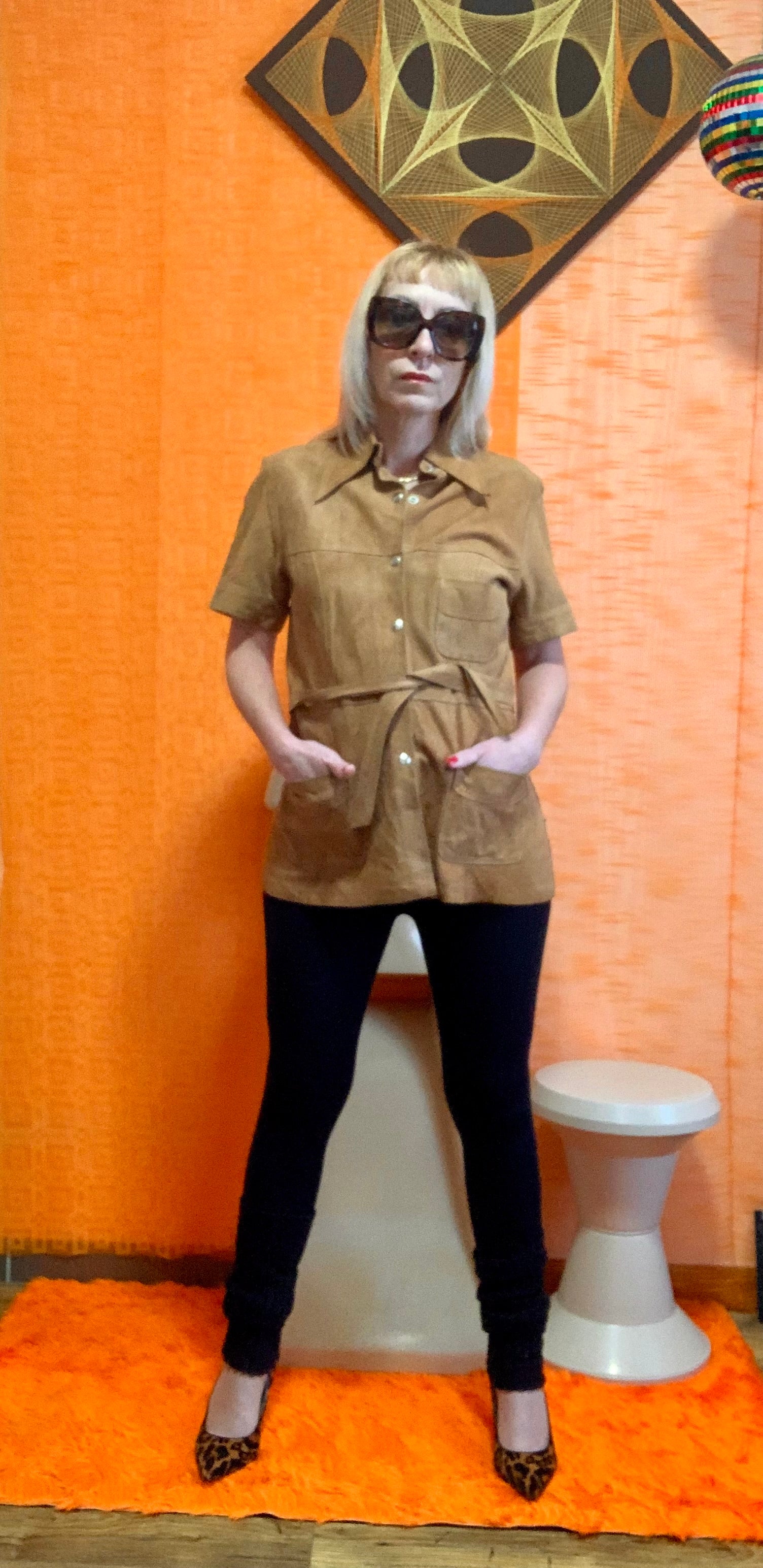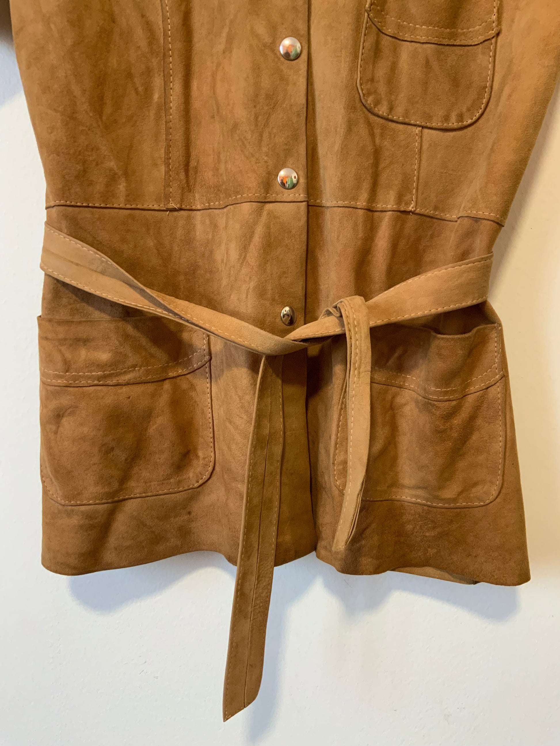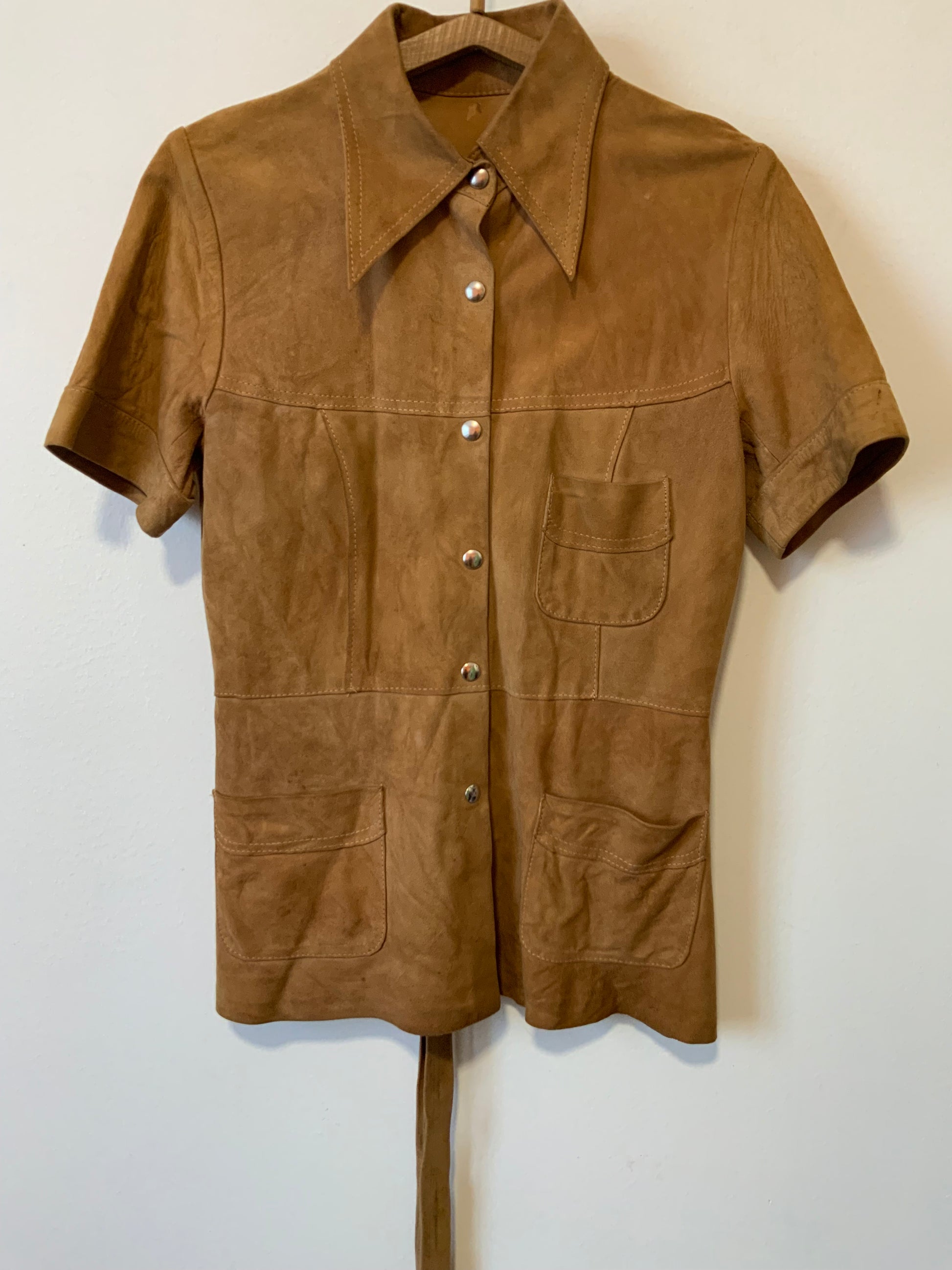 Tres belle et Authentique Veste en Daim Vintage 1970 au col pelle à tartes Façon chemise avec lien taille - Veste de création seventies en cuir daim marron camel, bon état de légères traces et une minuscule déchirure voir la photo.